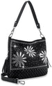 Go for full glamour with this hobo handbag complete with brilliant stone Daisy flowers and trimmed with a woven pattern.