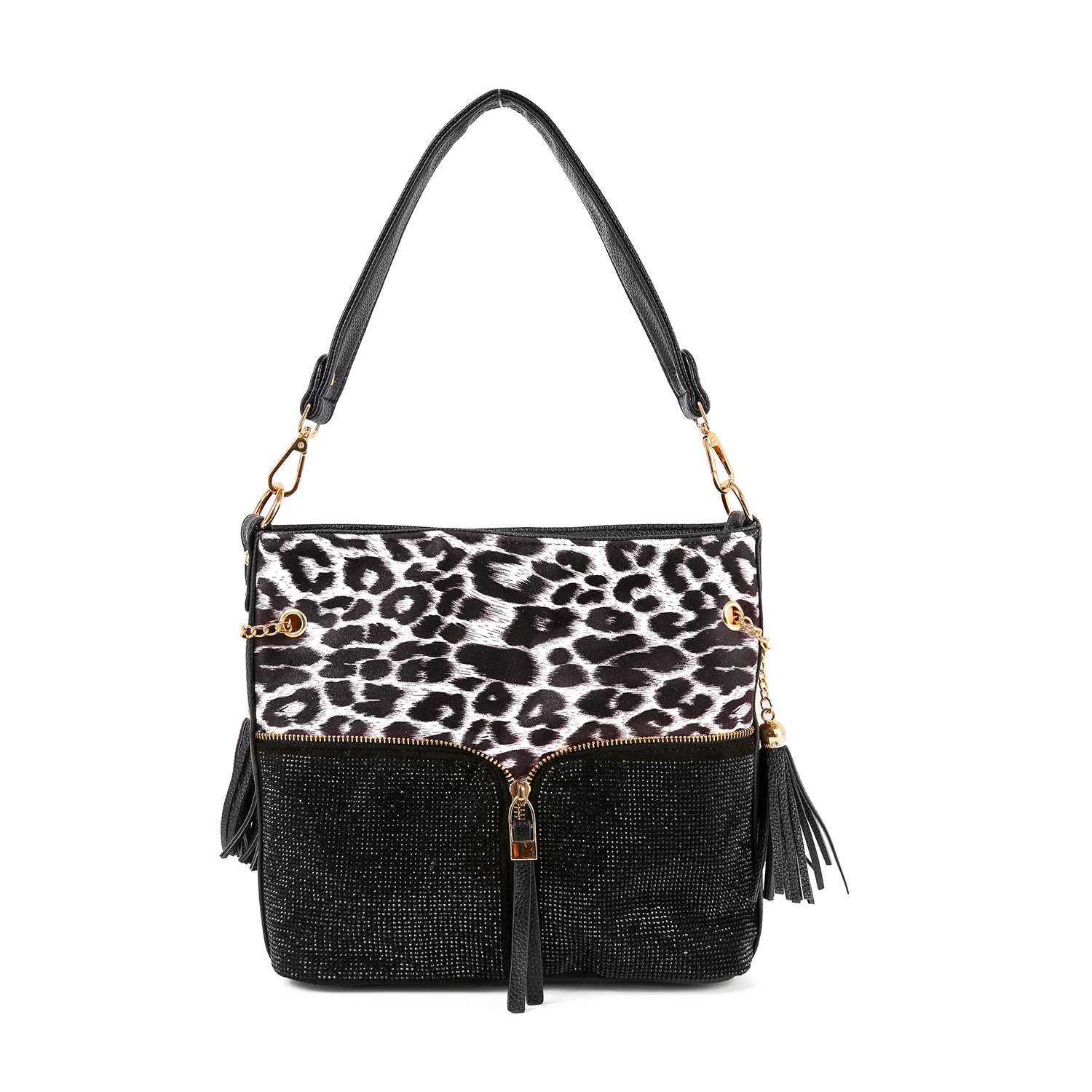 Animal Print Rhinestone Zip Hobo Handbag