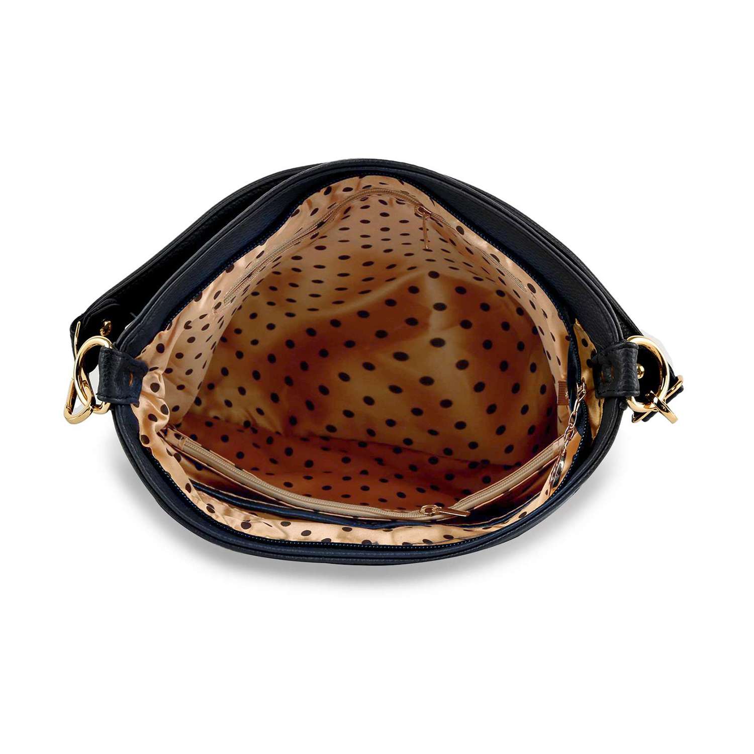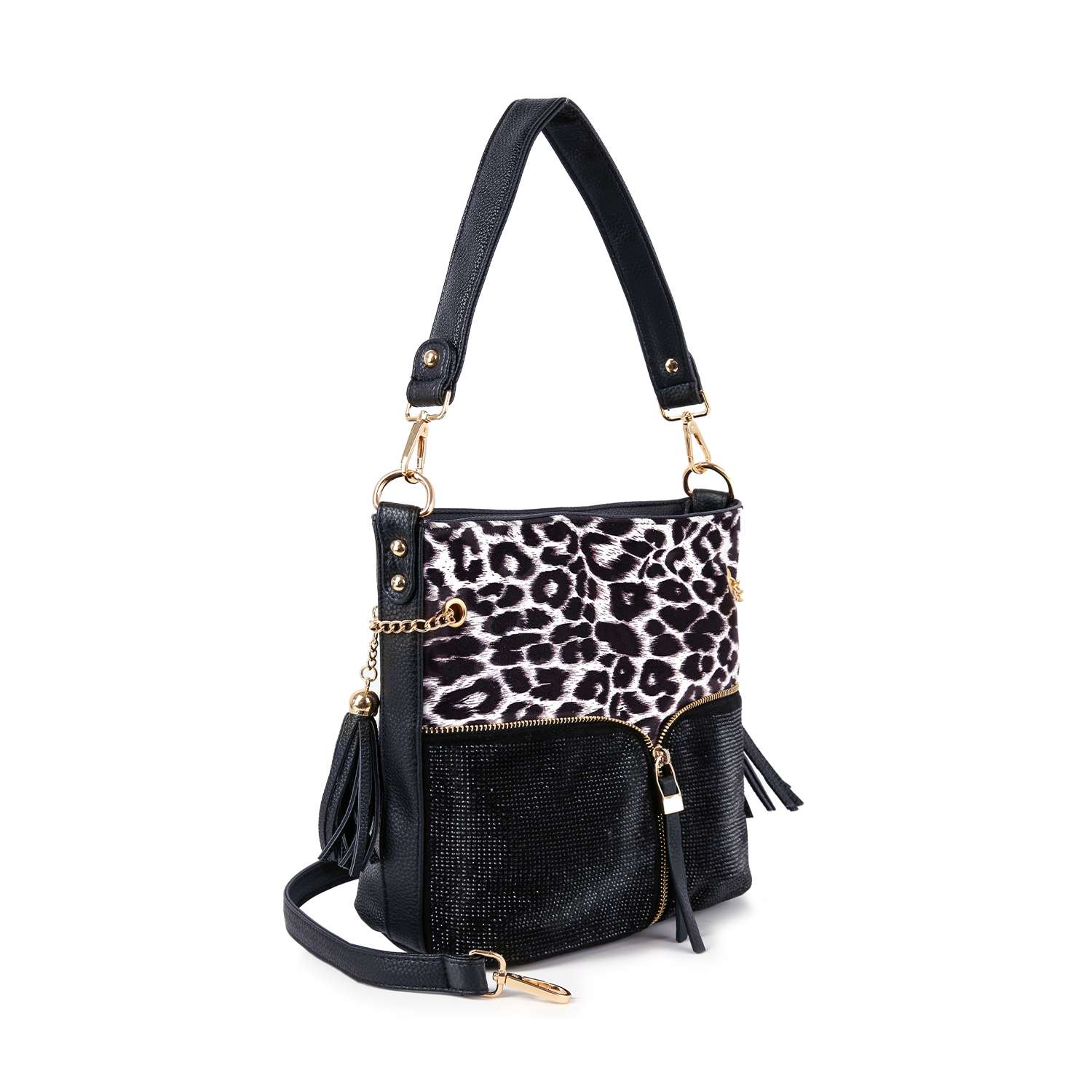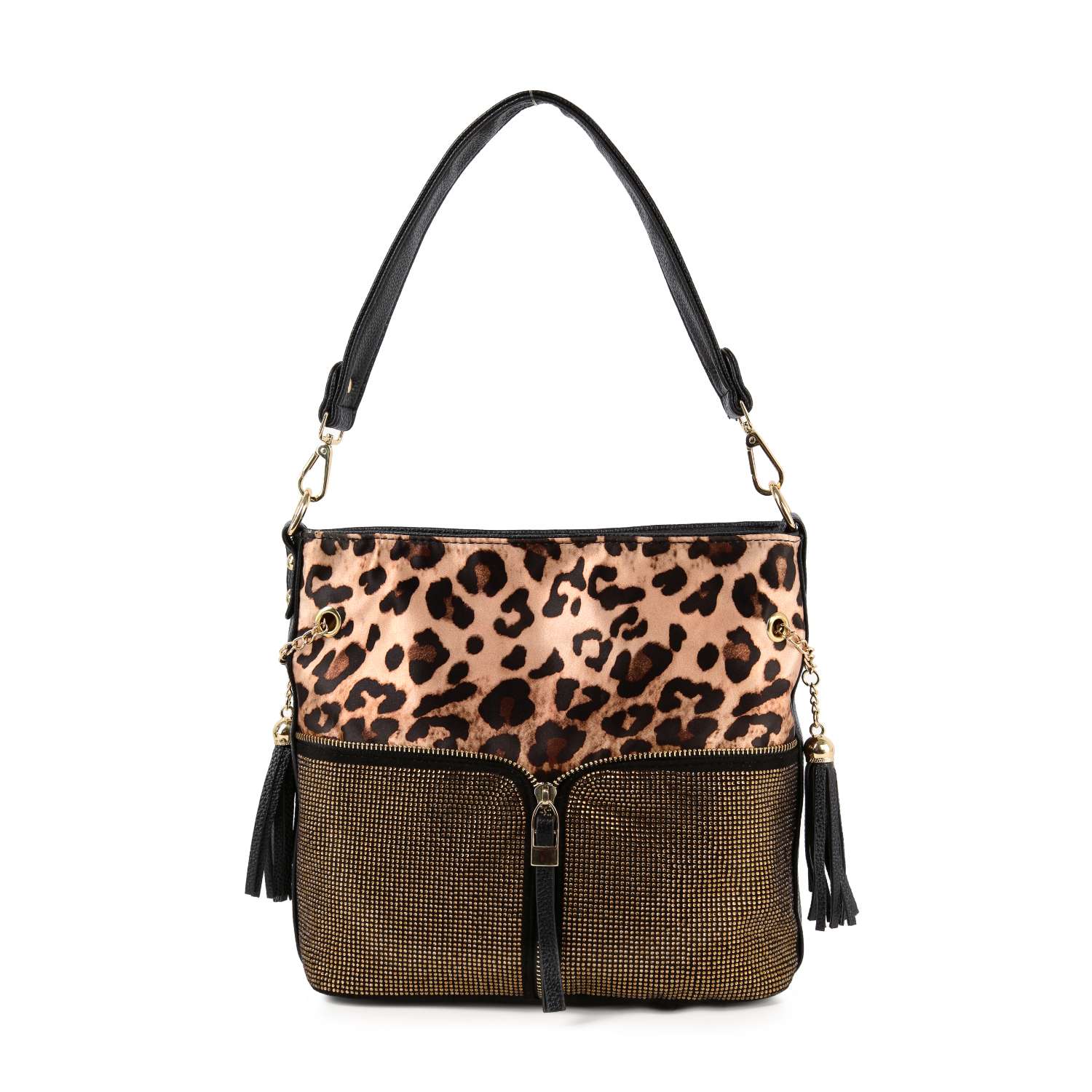 On-trend Animal print!   Zipper accented, pave rhinestones, gold hardware and tassel accents. This highly decorative hobo will look great running errands or a night on the town.