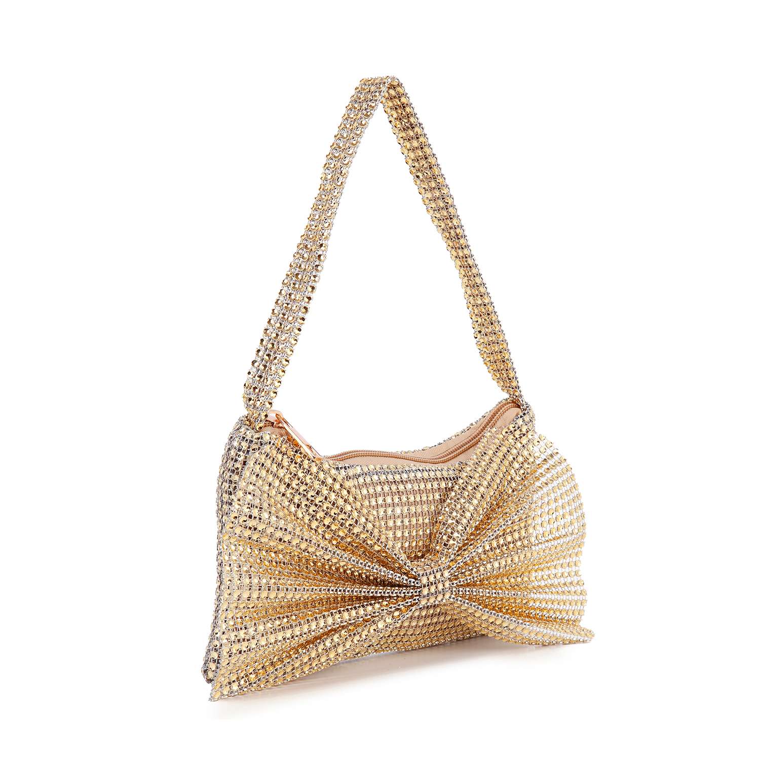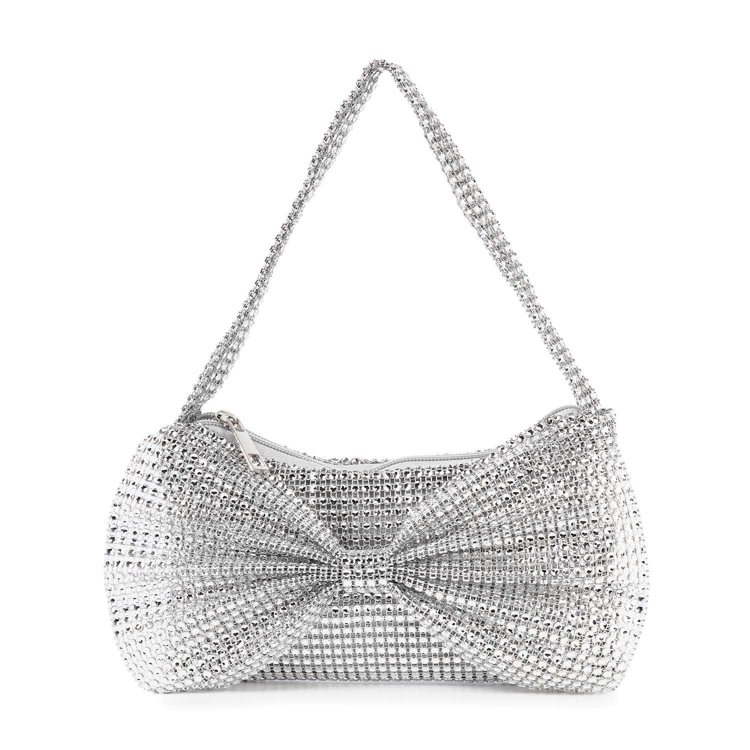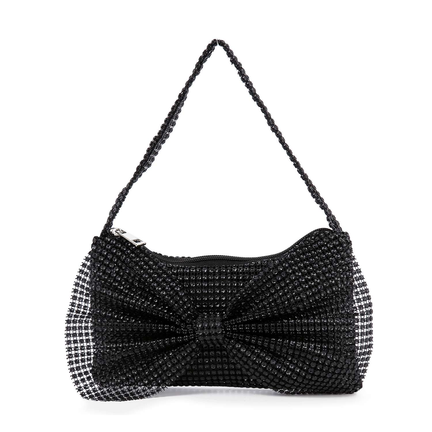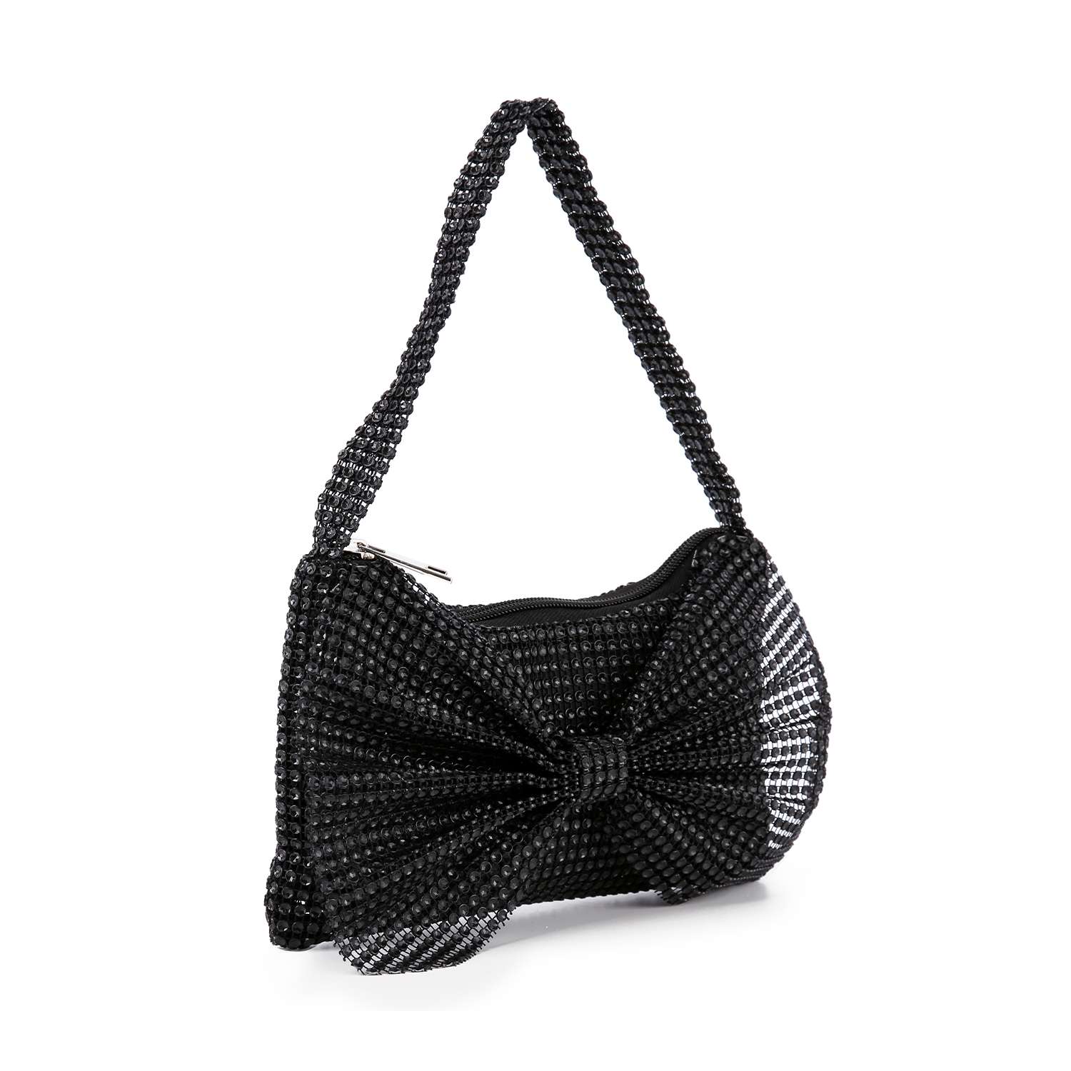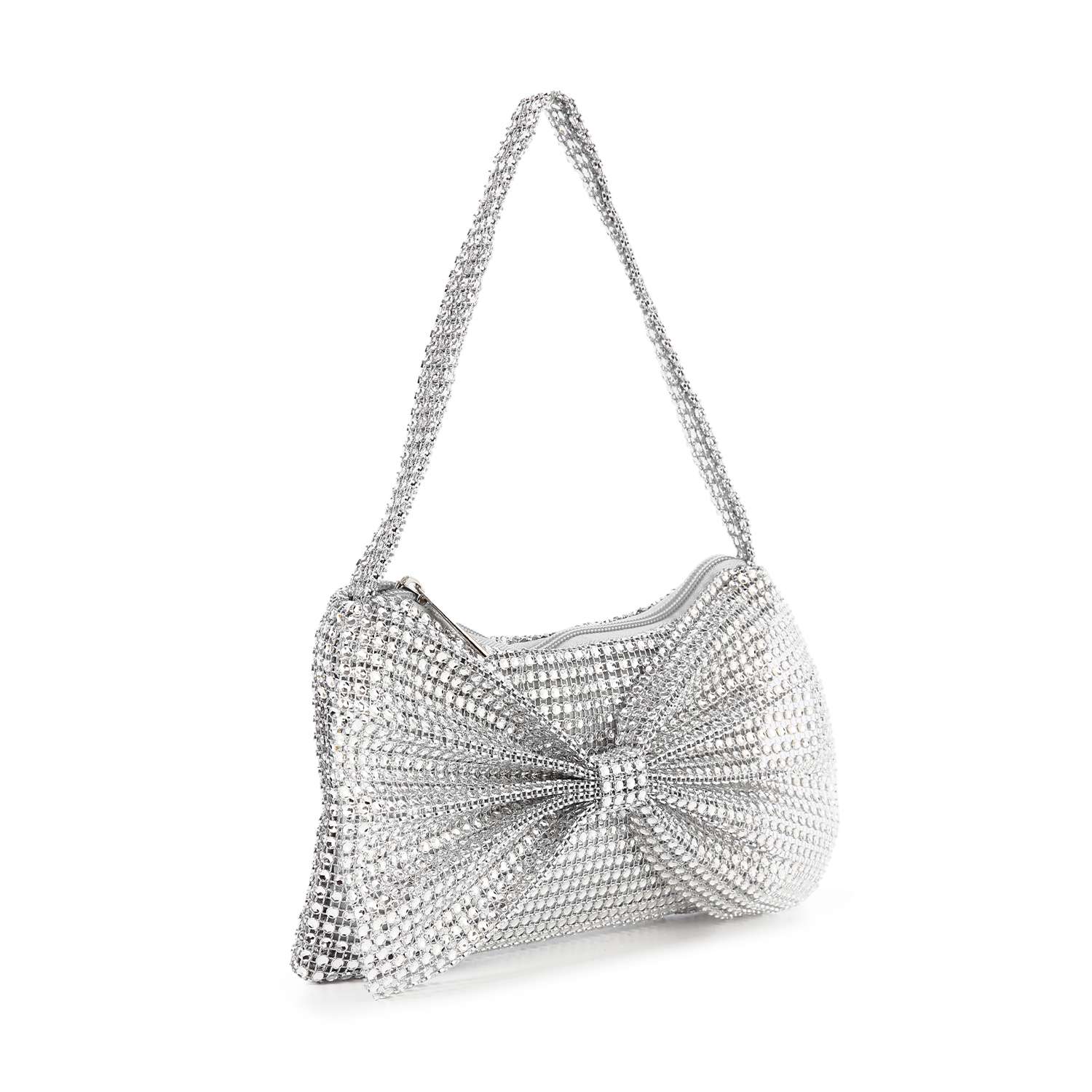 Clusters of metal mesh crystals sparkle and shine as a classic bow takes shape on the perfect little evening bag.