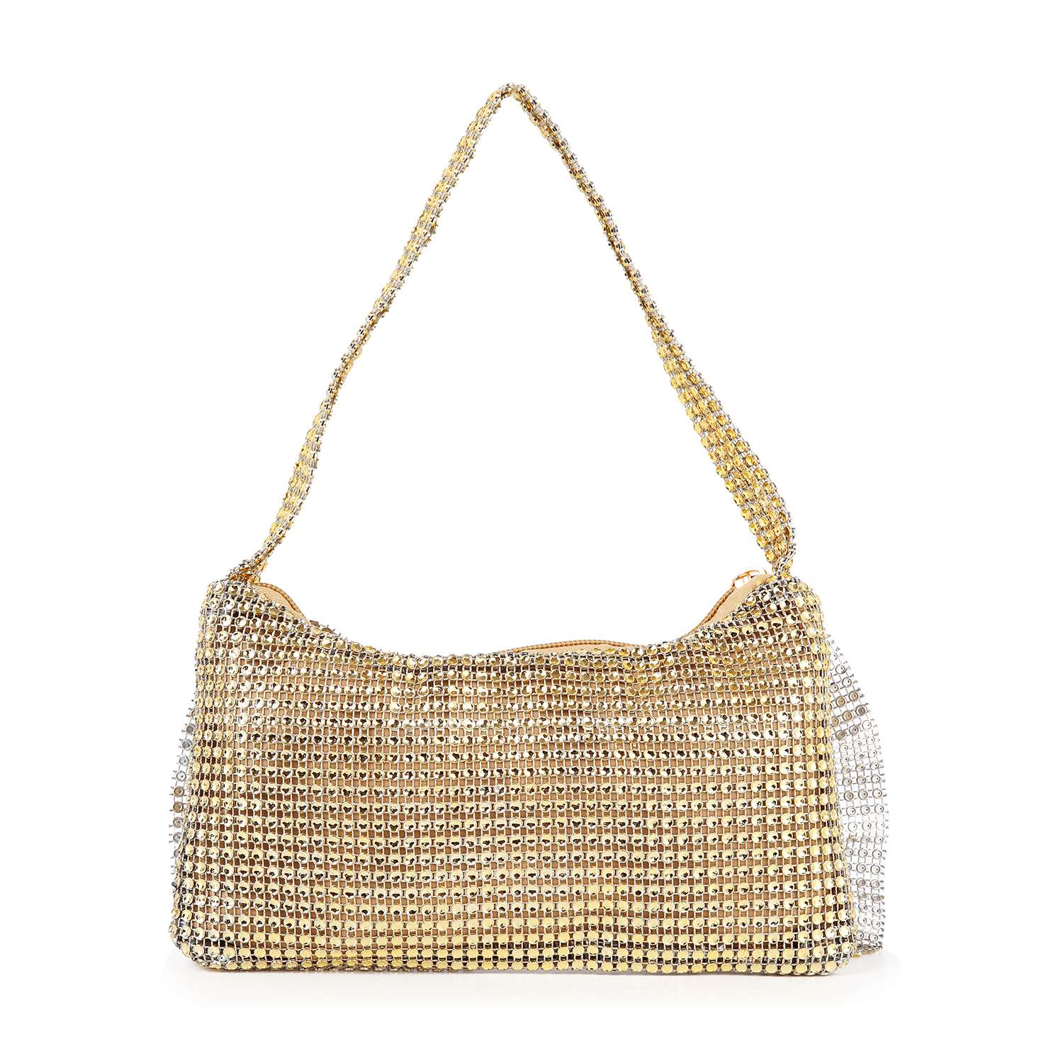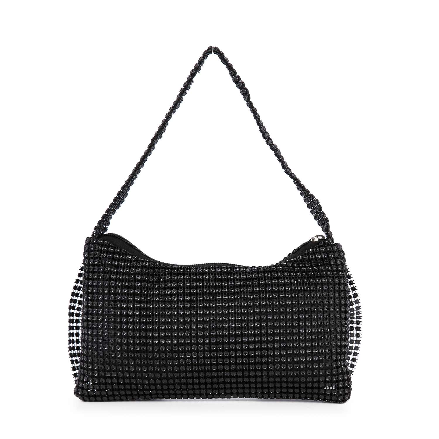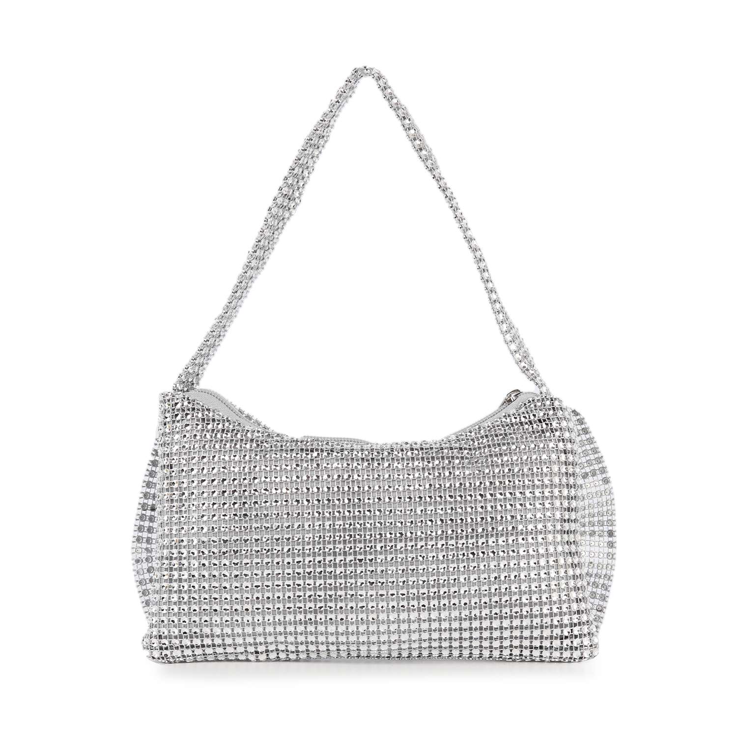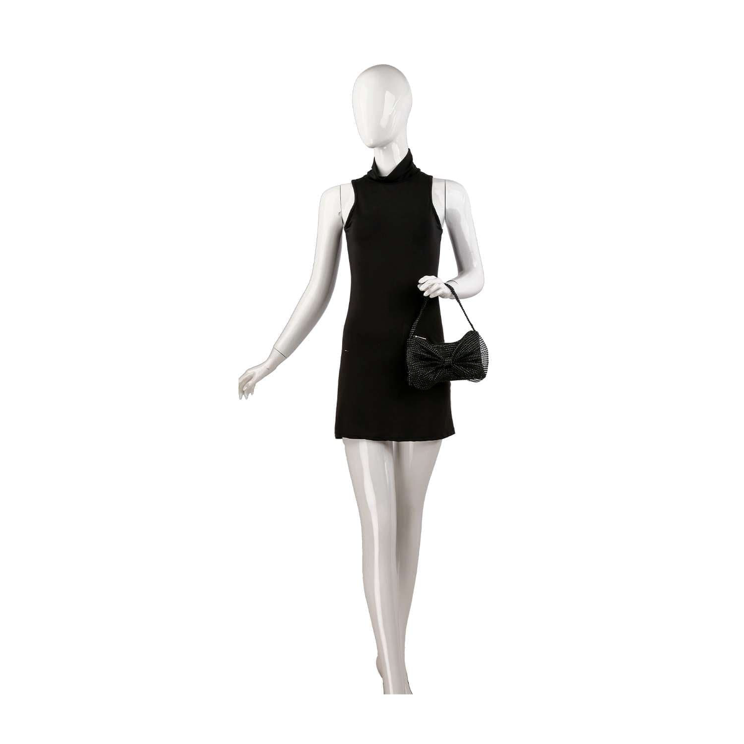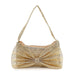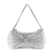 Clusters of metal mesh crystals sparkle and shine as a classic bow takes shape on the perfect little evening bag.