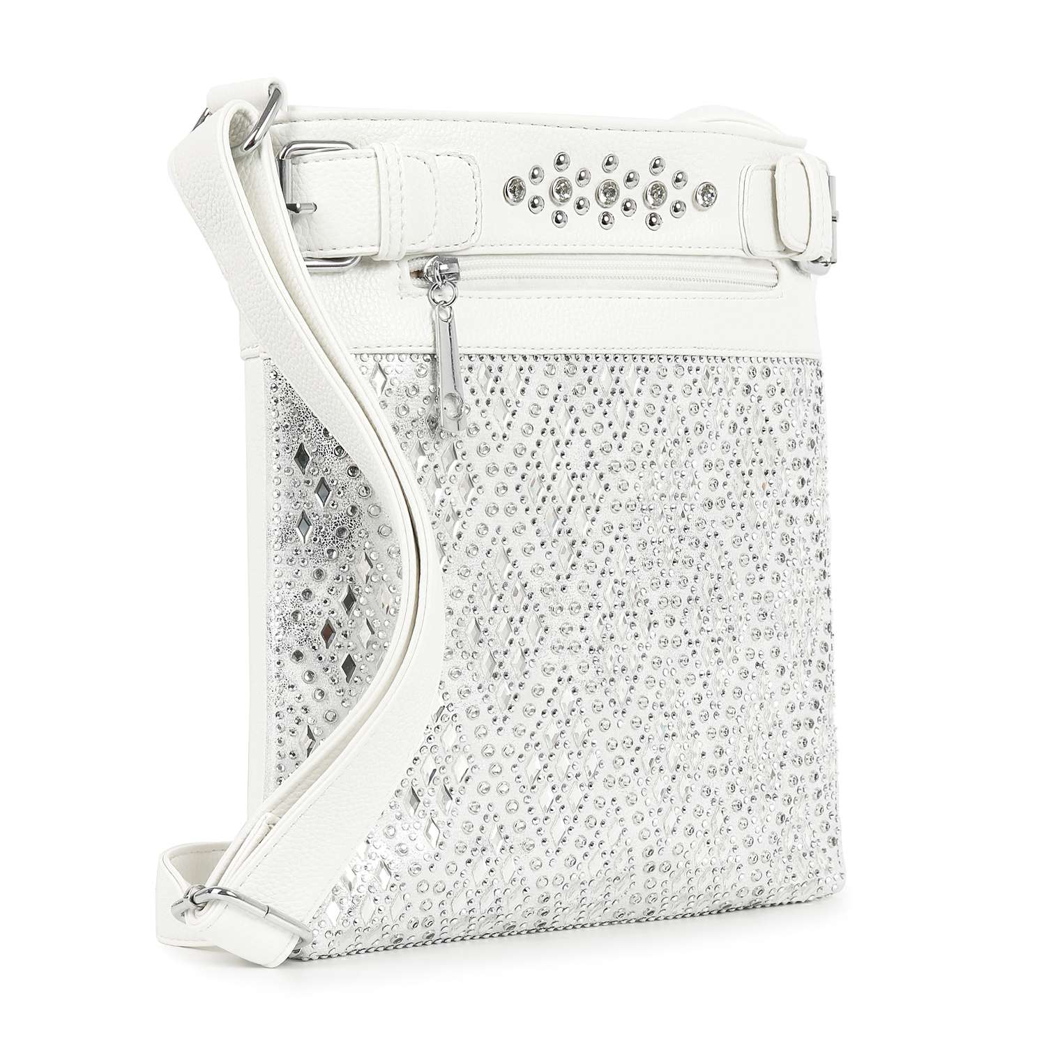 Turn some heads! A sparkling diamond-shaped pattern covers the front panel of this crossbody sling.