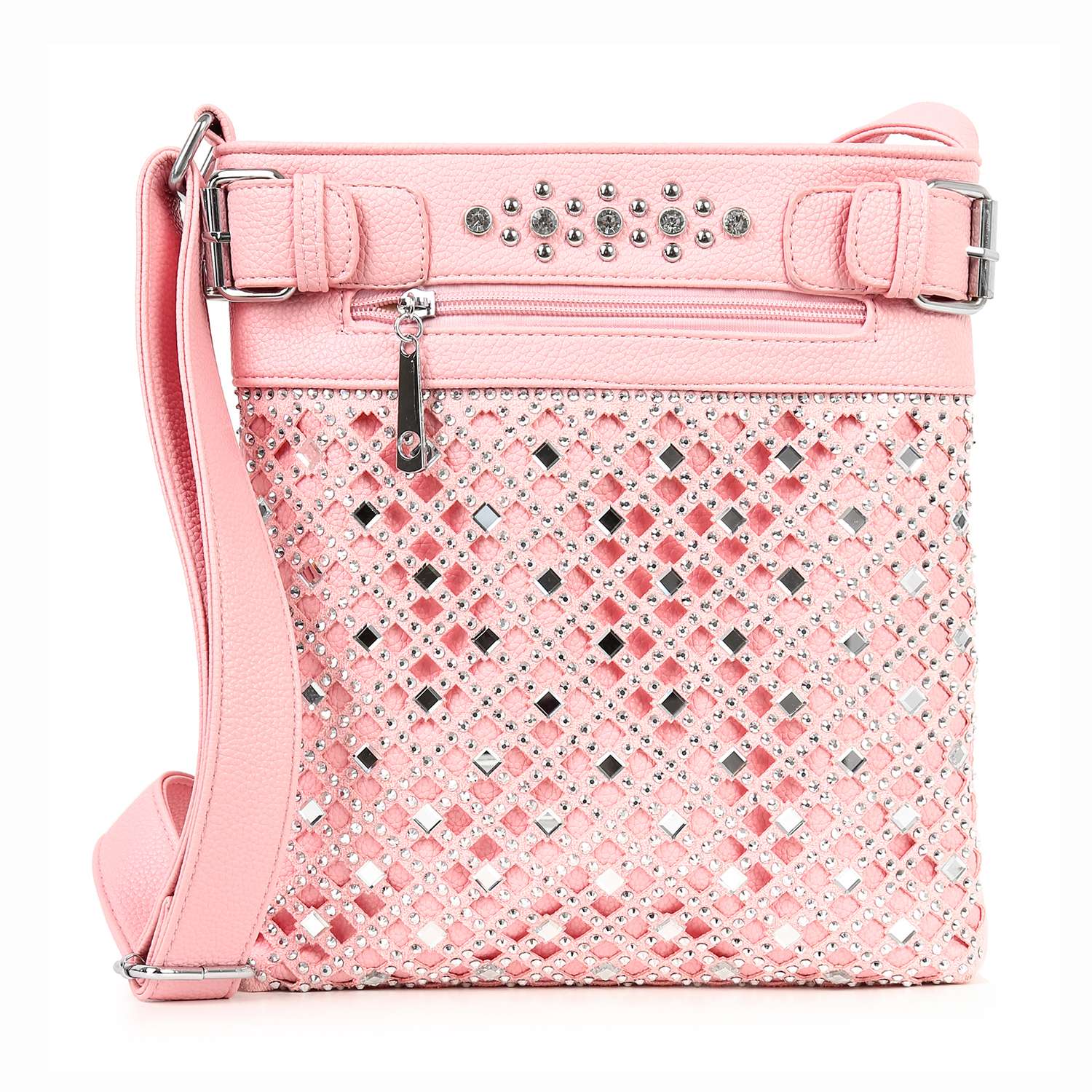 An ornate rhinestone design gives this perfectly sized crossbody sling a truly unique edge