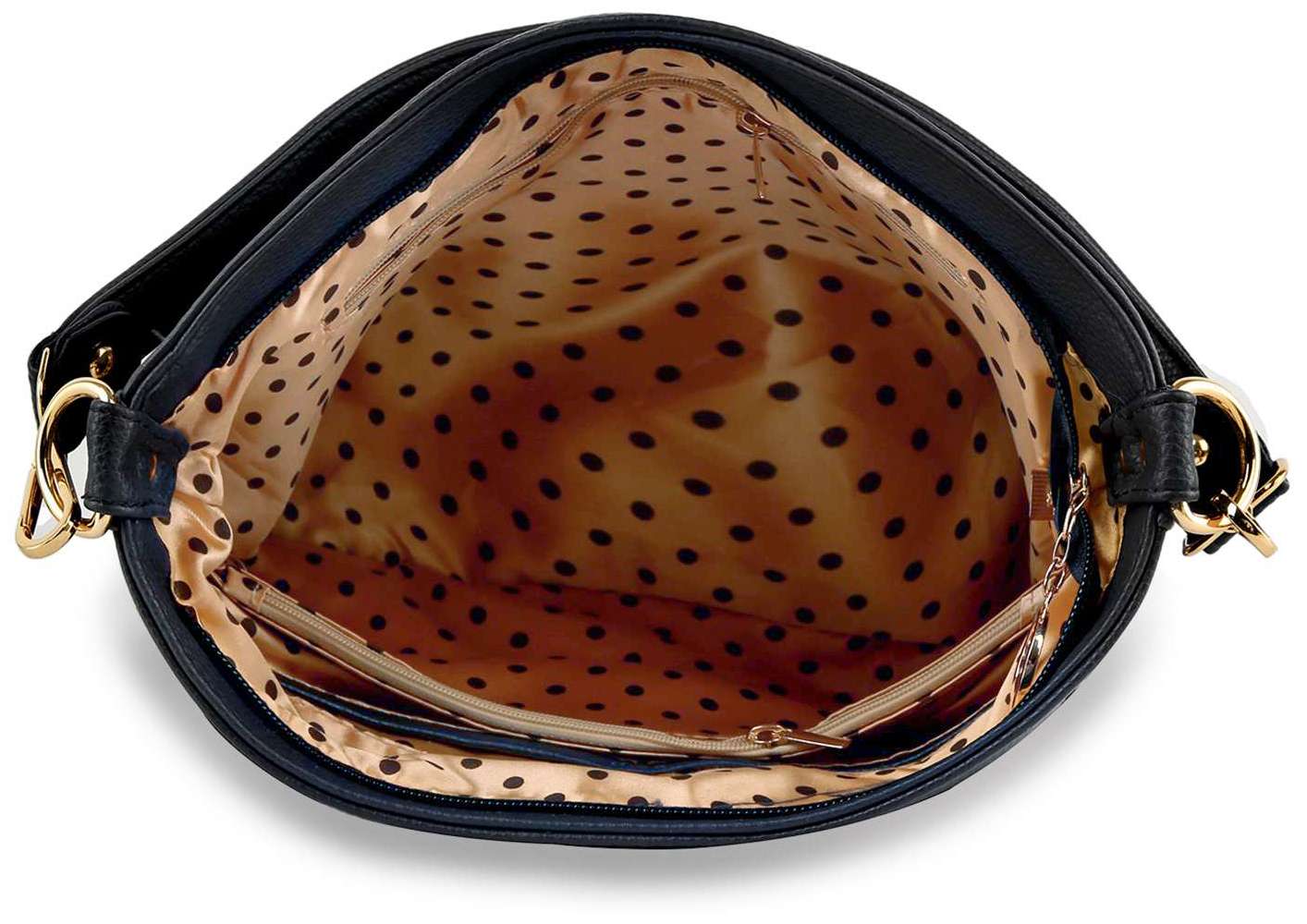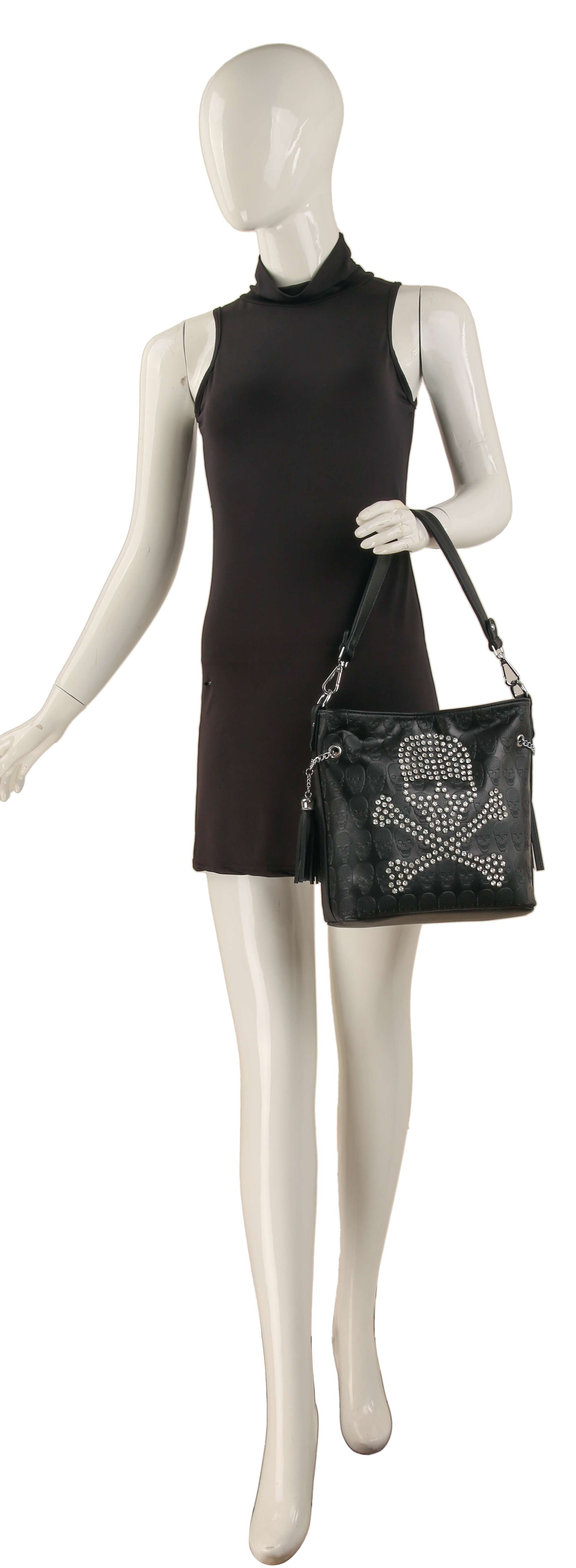 A bold studded rhinestone signature skull and crossbones brings Gothic glamour to a skull embossed hobo crossbody bag.