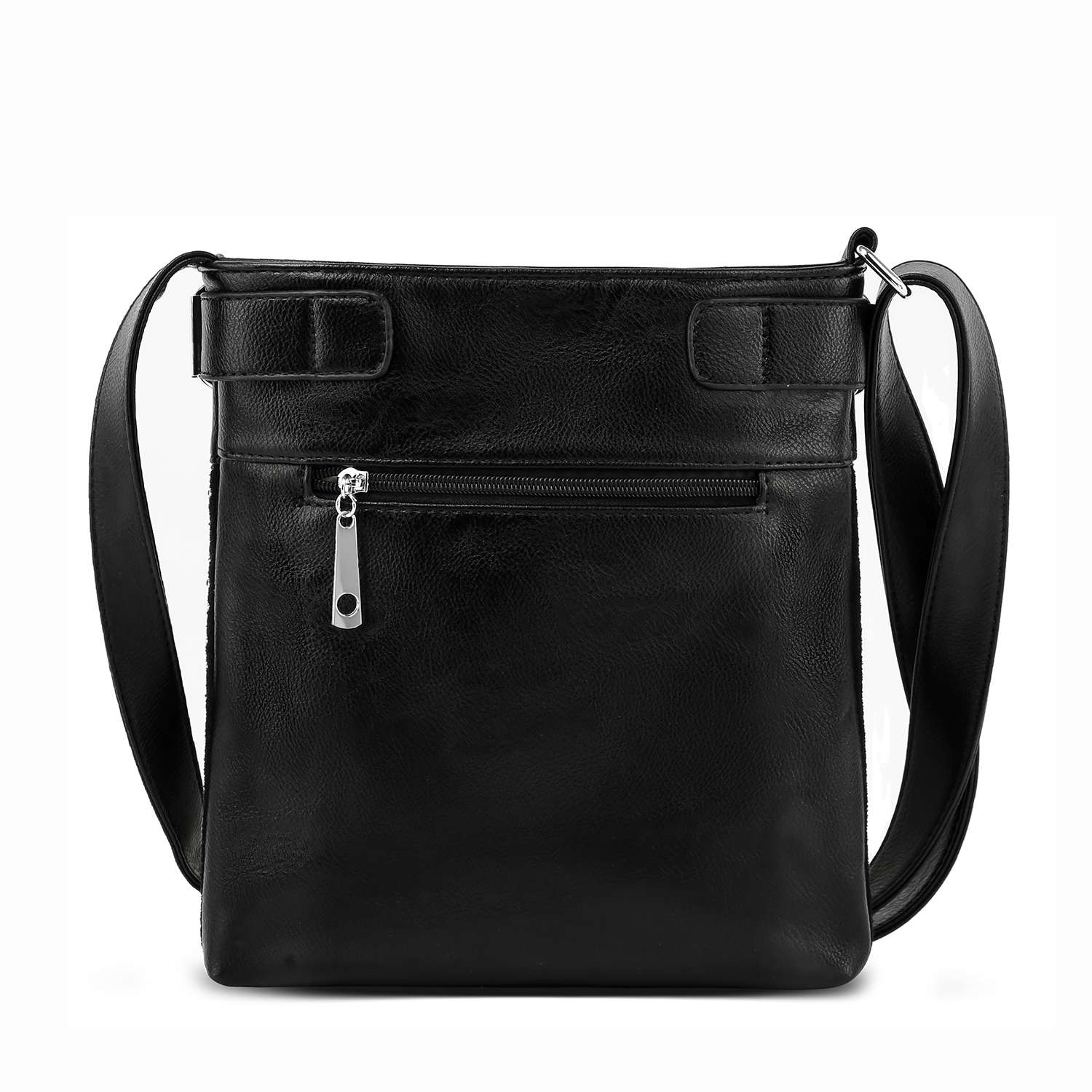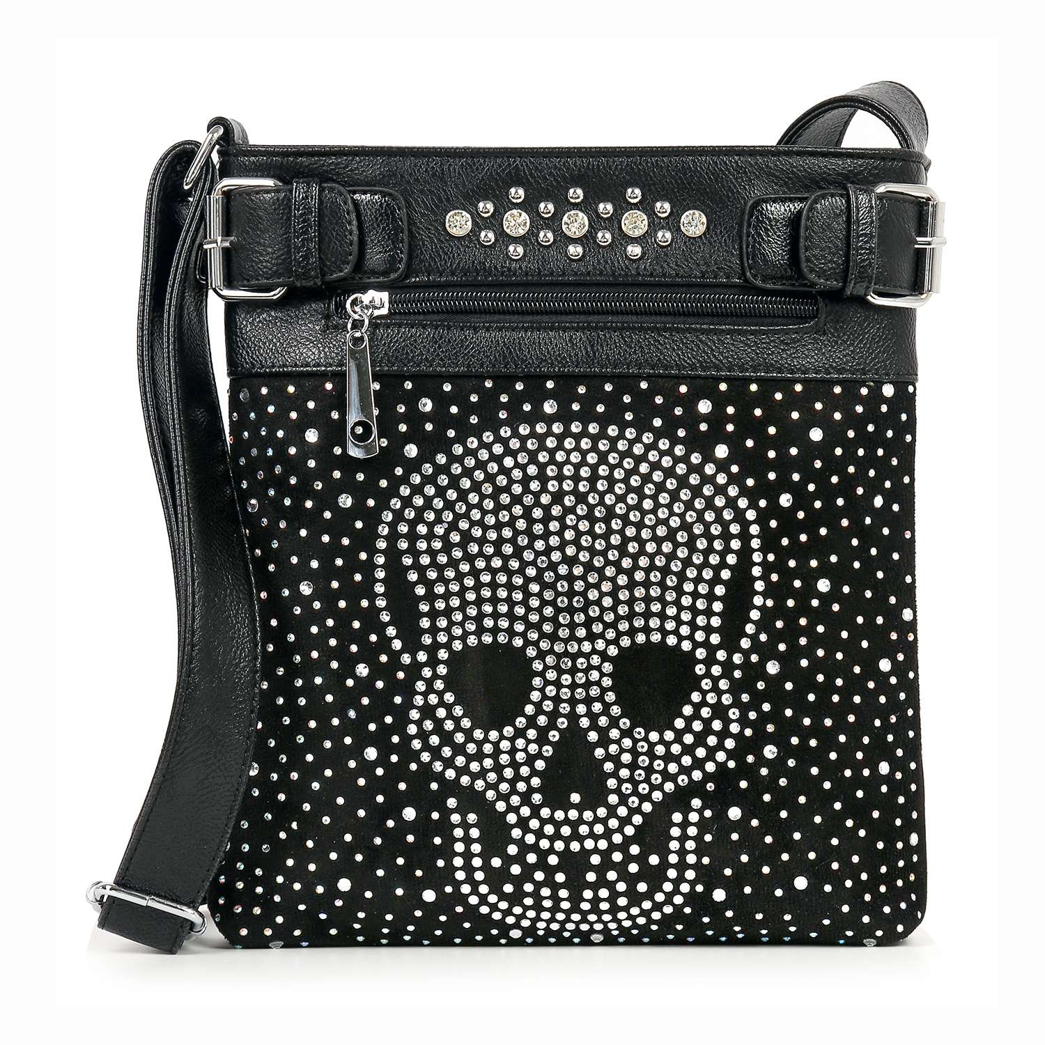 A classic crossbody sling in faux leather with a dazzling bling Skull, set upon a suede like front and finished off with tiny iridescent stones.