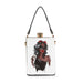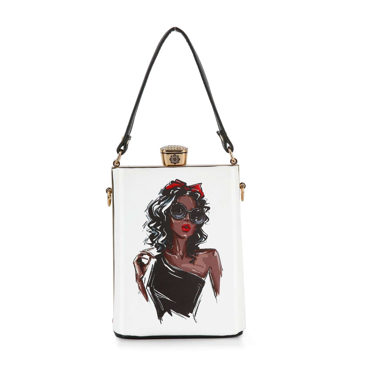 A hip art print dazzles against the metal frame exterior of a petite hand tote fitted with a crossbody chain for hands free styling.