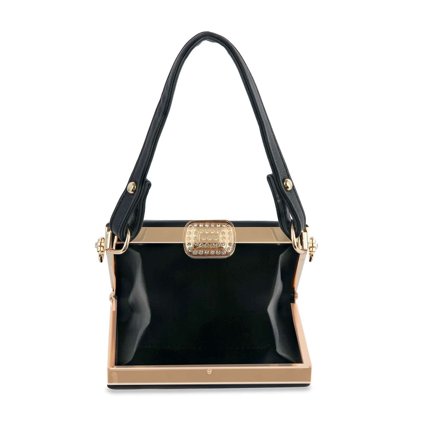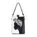 A hip art print dazzles against the metal frame exterior of a petite hand tote fitted with a crossbody chain for hands free styling.