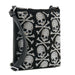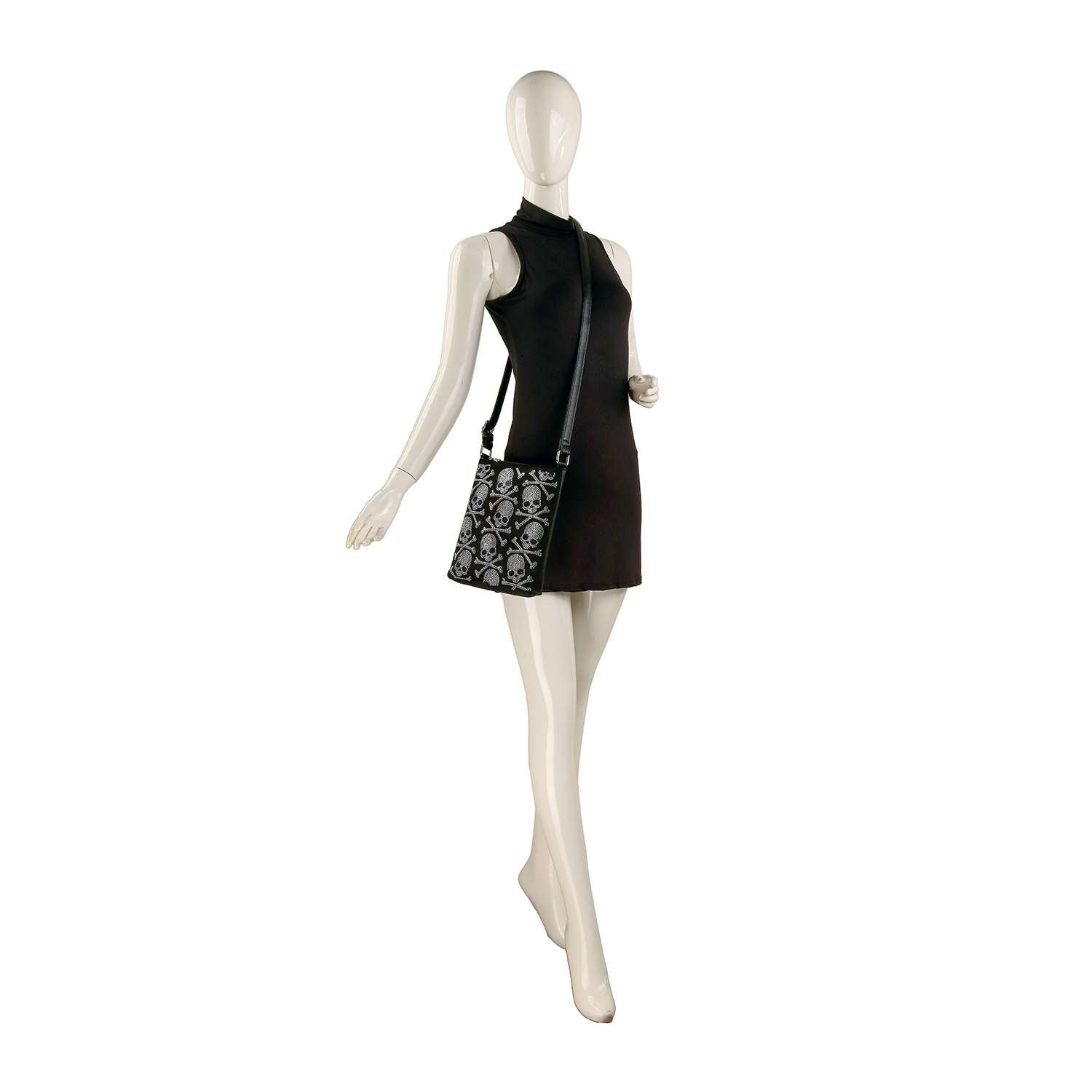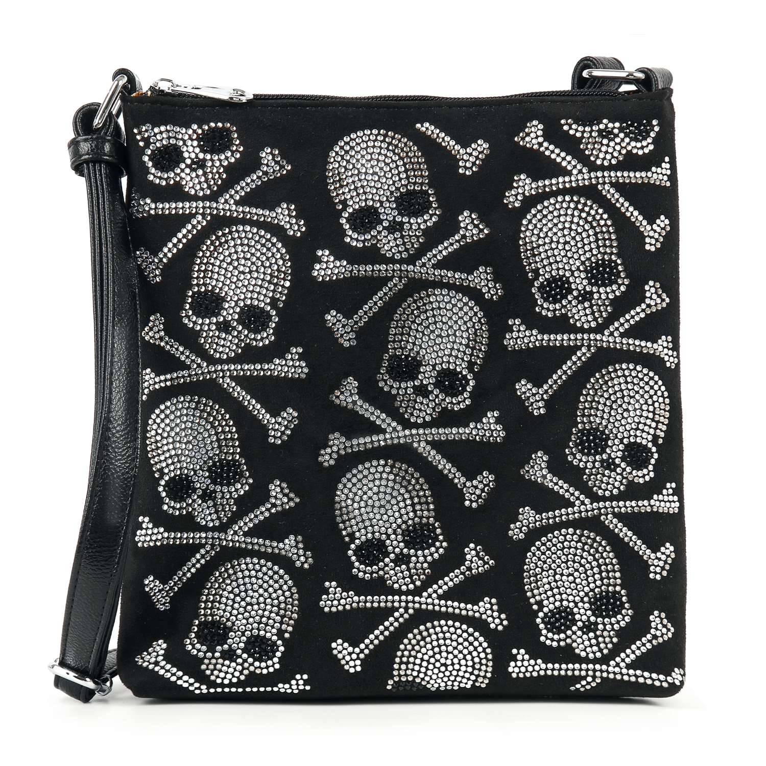 A super blingy rhinestone accented skull and crossbones pattern provides an edgy carrying option for this super convenient crossbody bag.