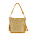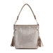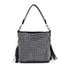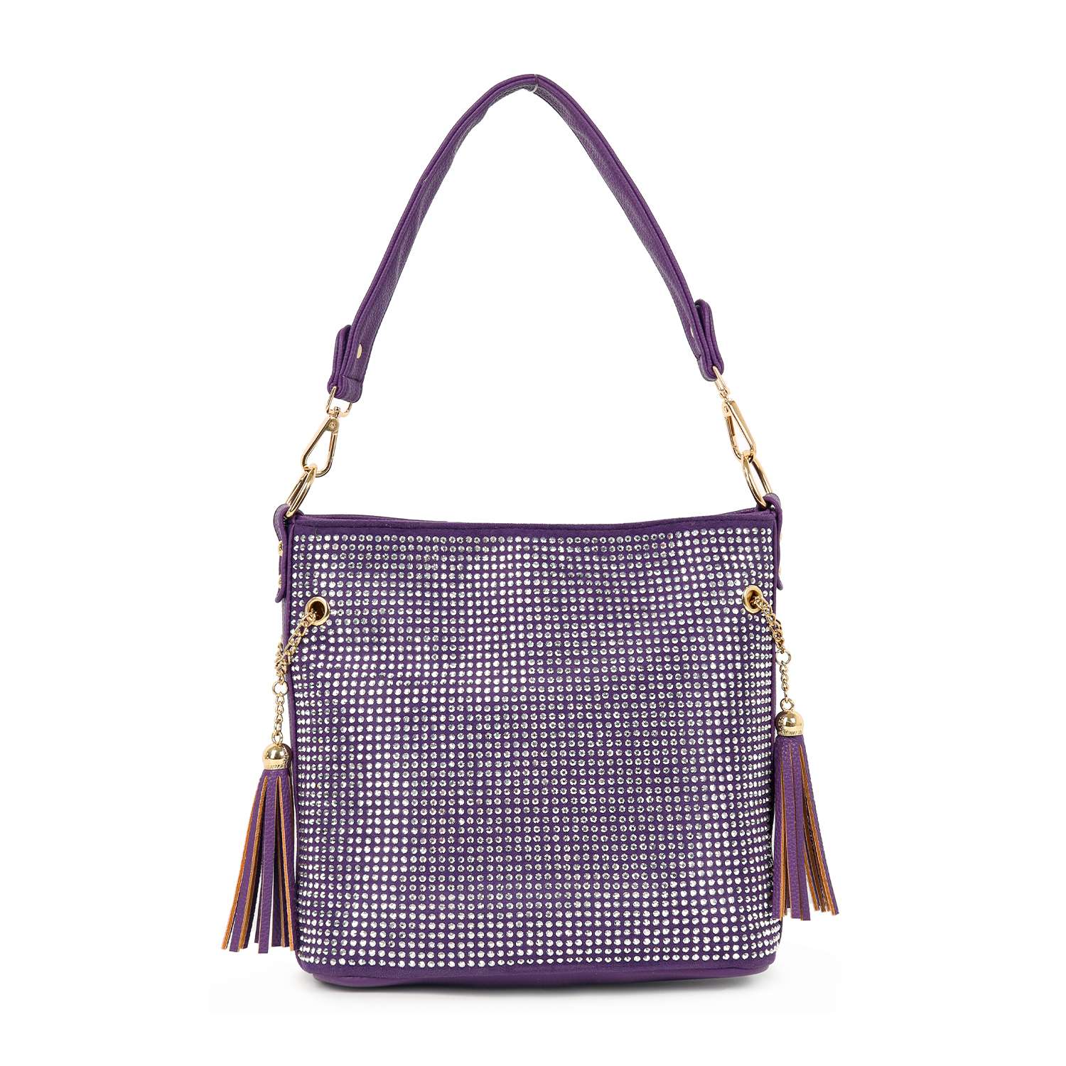 An effortlessly cool silhouette, this fashion hobo is made in a soft faux leather and features a rhinestone covered front that is sure to turn heads.