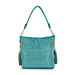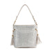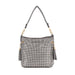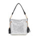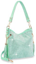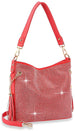 An effortlessly cool silhouette, this fashion hobo is made in a soft faux leather and features a rhinestone covered front that is sure to turn heads.