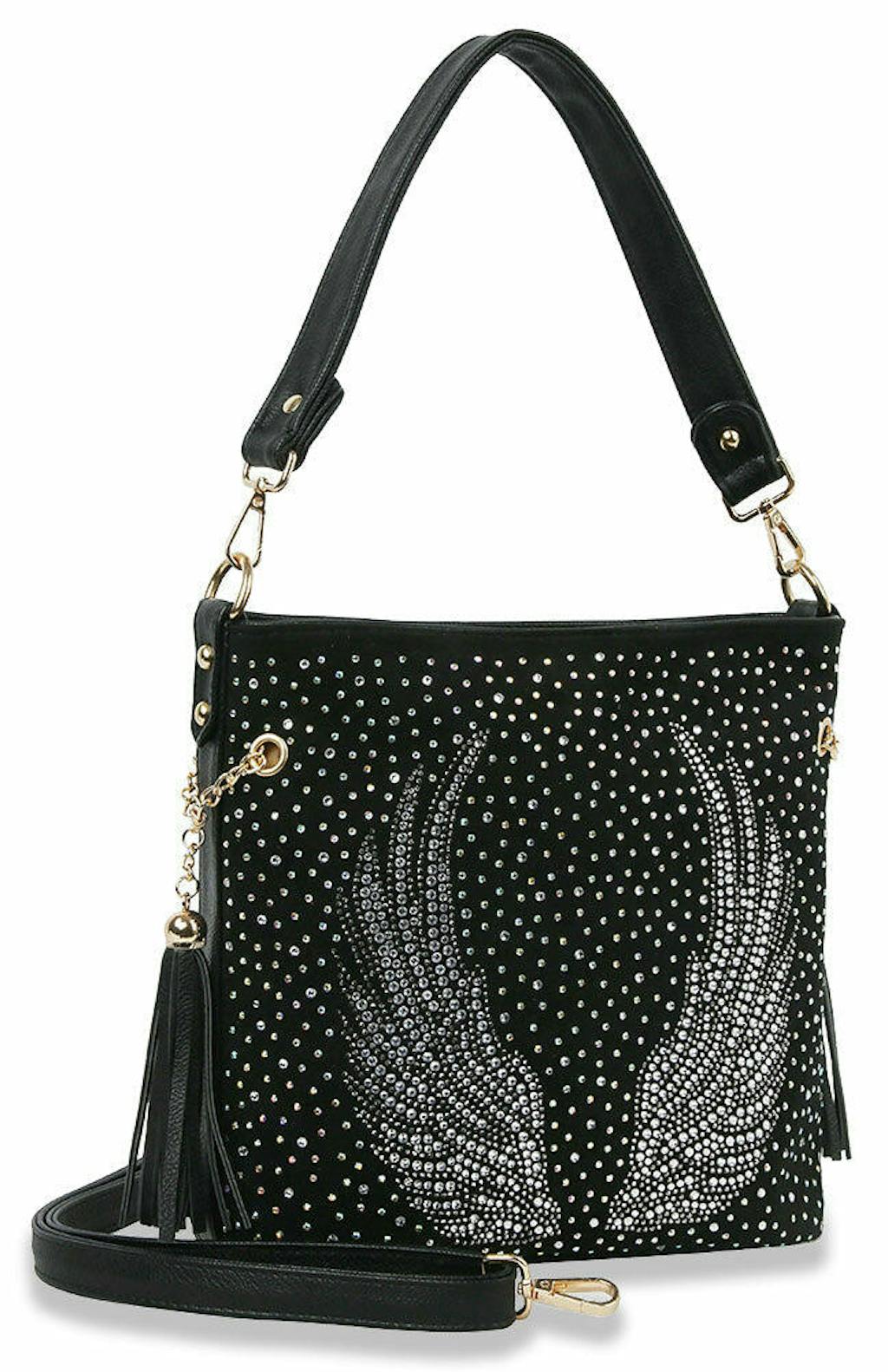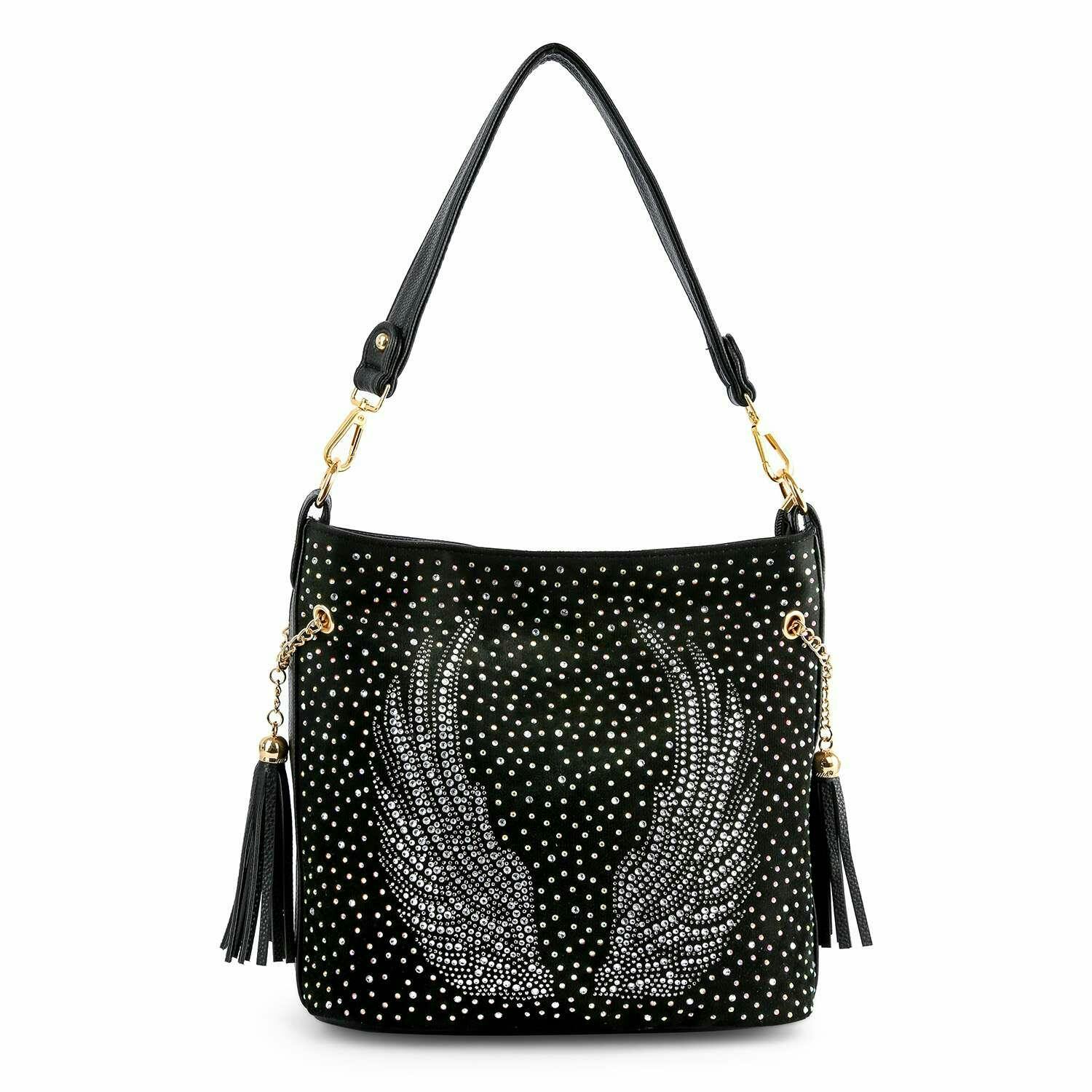 An effortlessly cool silhouette, this fashion hobo is made in a soft faux leather and features a beautiful rhinestone wings design.