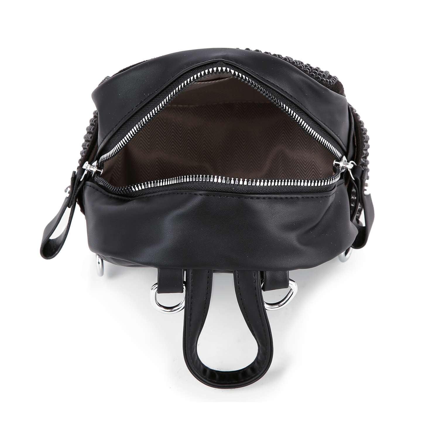 Hands free gets a sleek new upgrade with this faux leather top zip backpack featuring stunning stones.