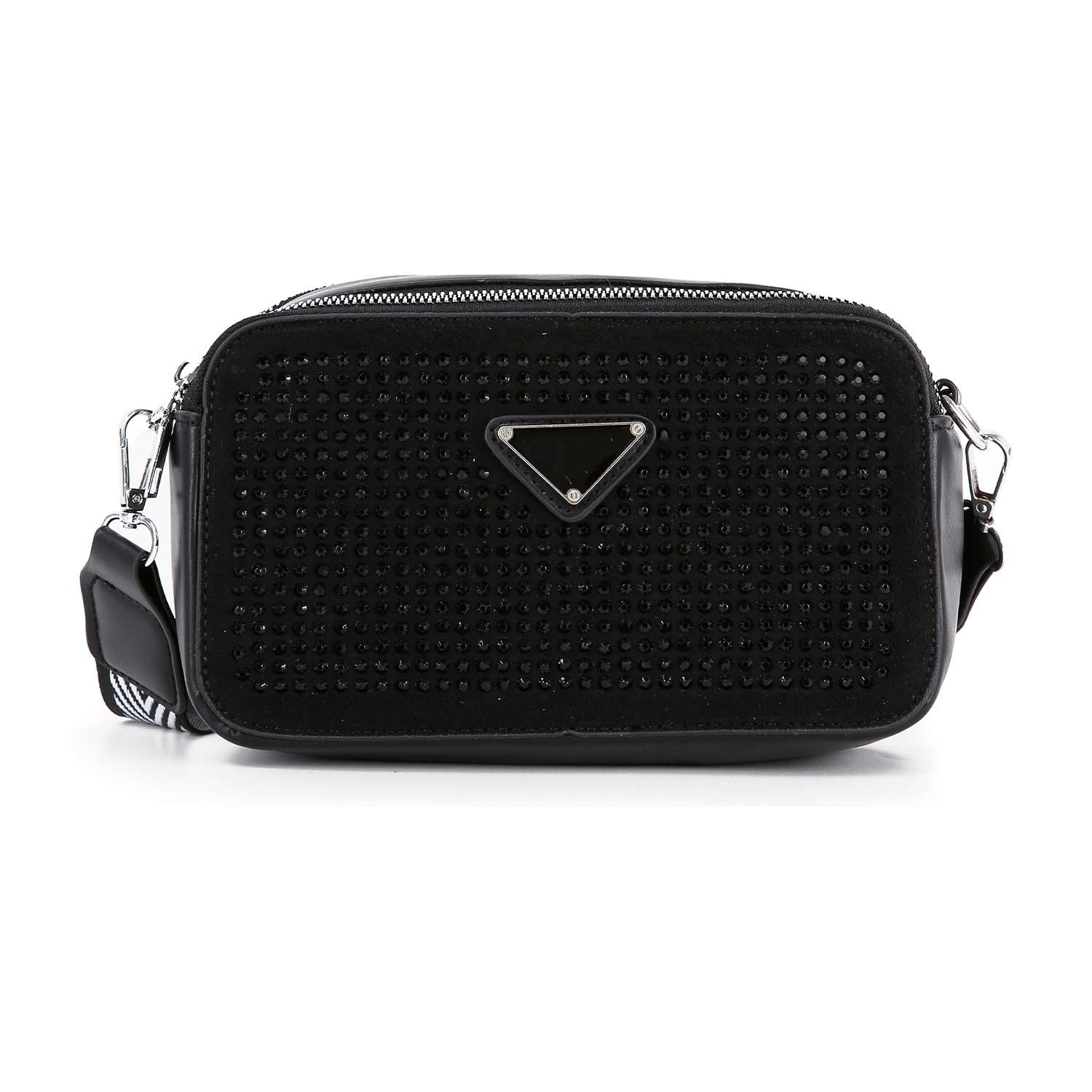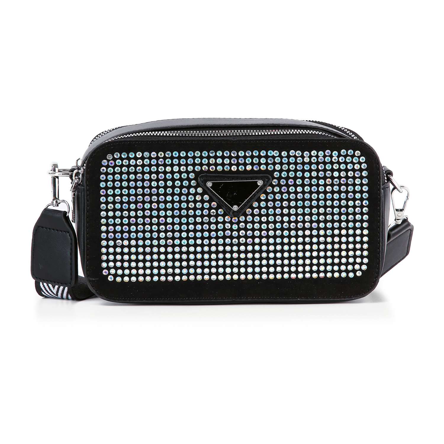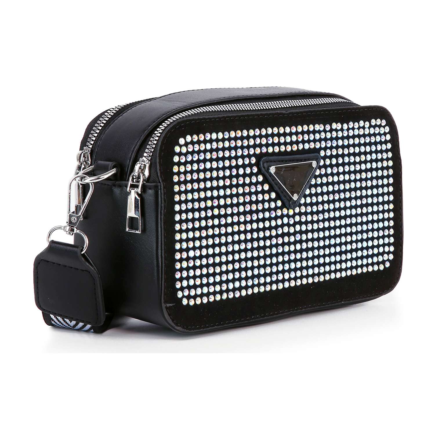 A  rhinestone  exterior is always an easy way to elevate any look, and this petite shoulder does it right.  A patterned guitar strap is detachable, giving you a clutch carry option.