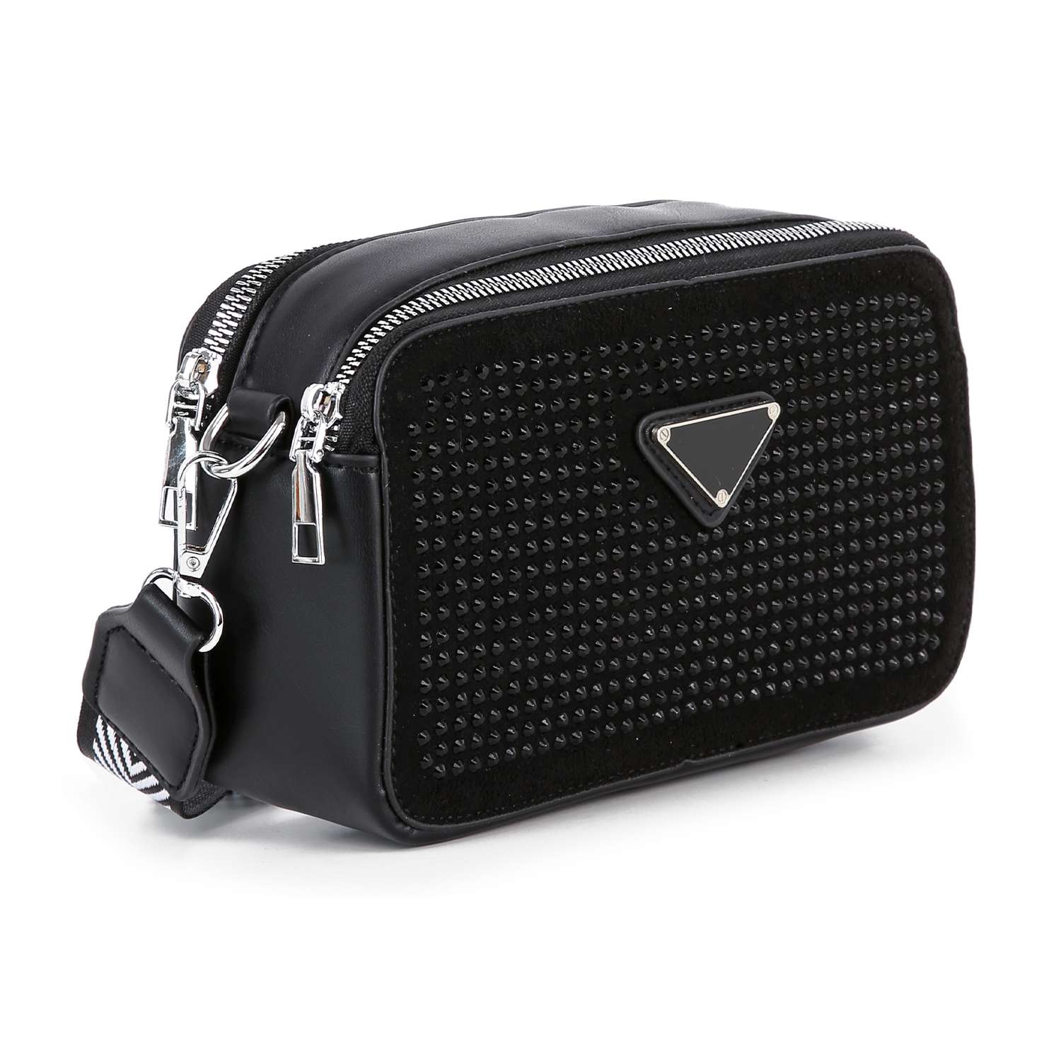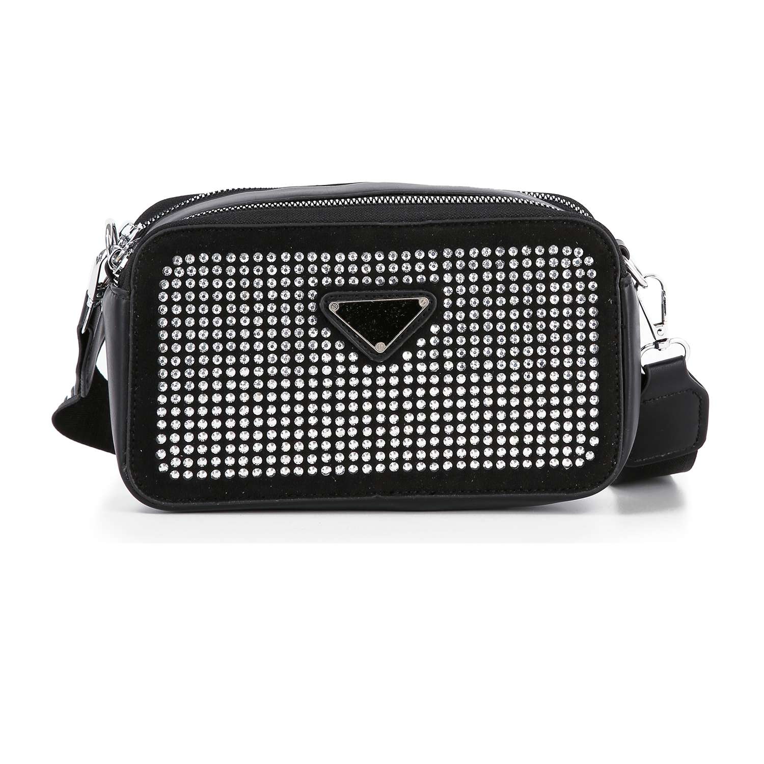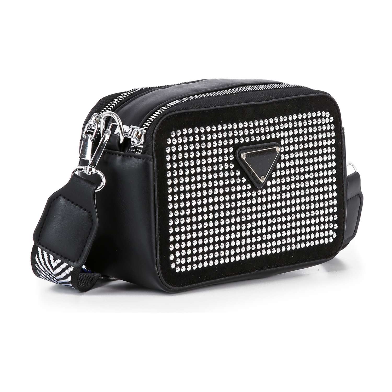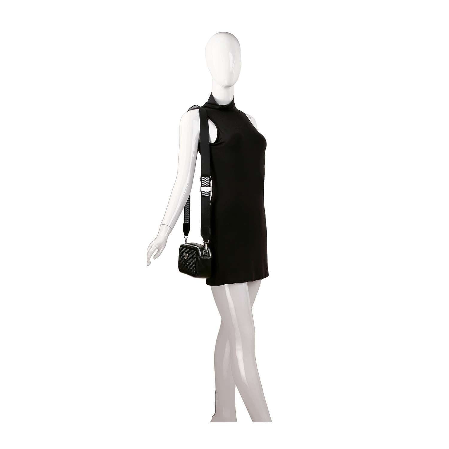 A  rhinestone  exterior is always an easy way to elevate any look, and this petite shoulder does it right.  A patterned guitar strap is detachable, giving you a clutch carry option.