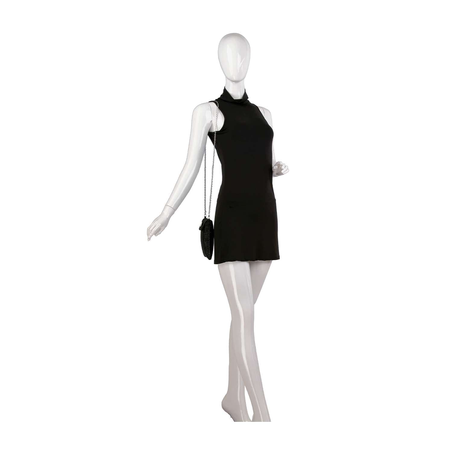 Sized right for a night out. 21L chain strap. Lined interior. Top flap closure. Silver toned hardware....
