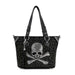 A classic shopper style tote in faux leather with a dazzling bling Skull and crossbones set upon a suede like front and finished off with tiny sparkling stones.