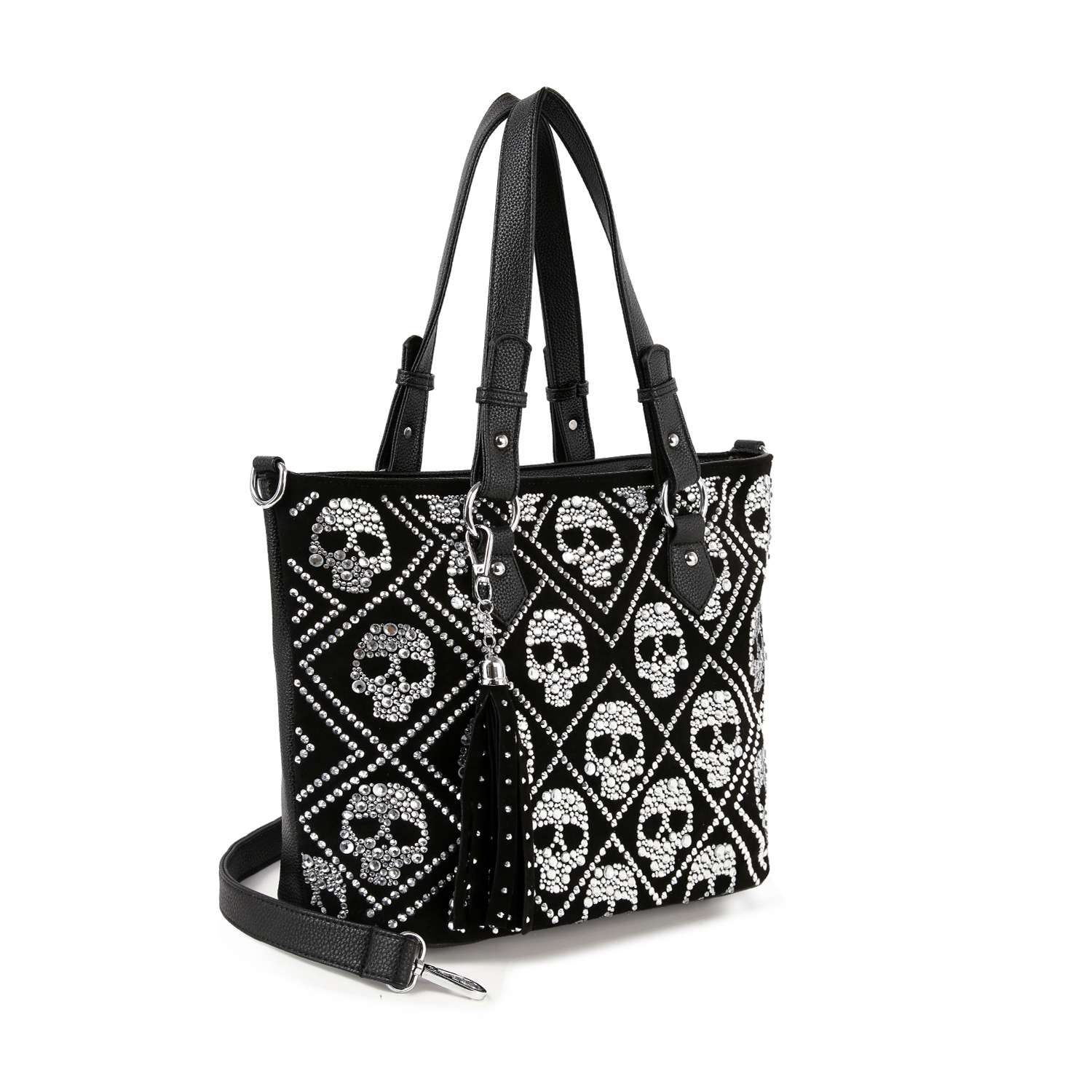 A classic shopper style tote in faux leather with a dazzling array of  stunning bling Skulls  set upon a suede like front and finished off with tiny sparkling stones and detachable tassel accent.