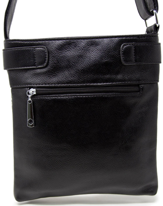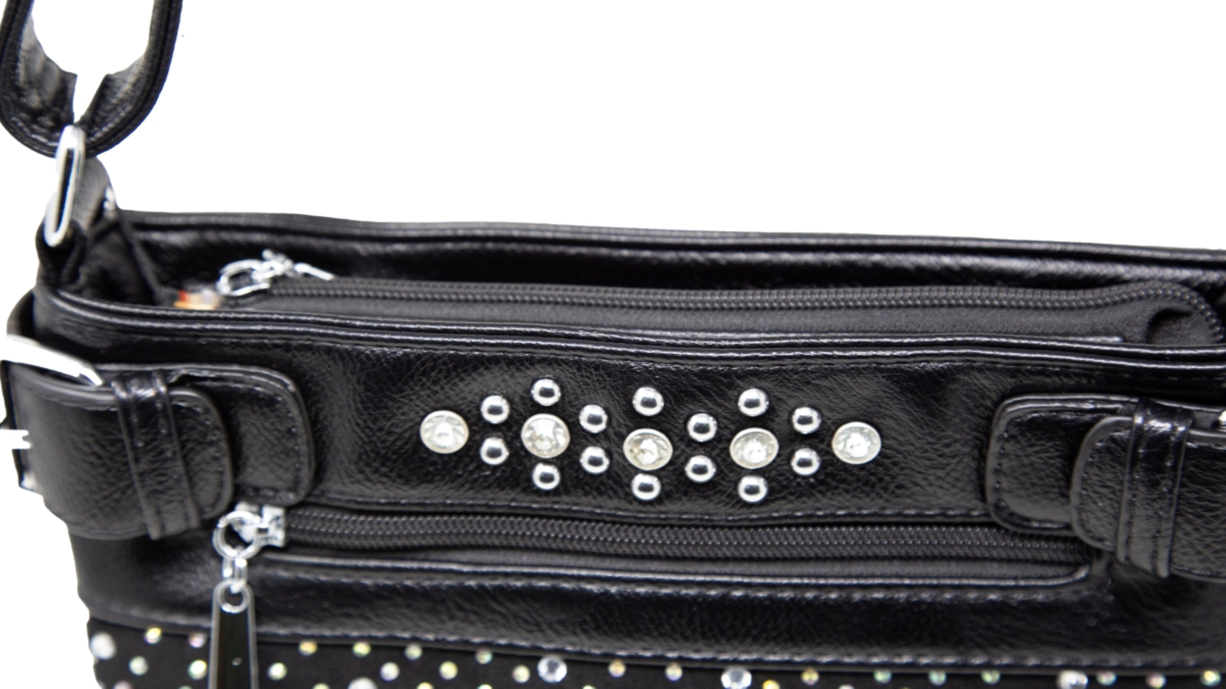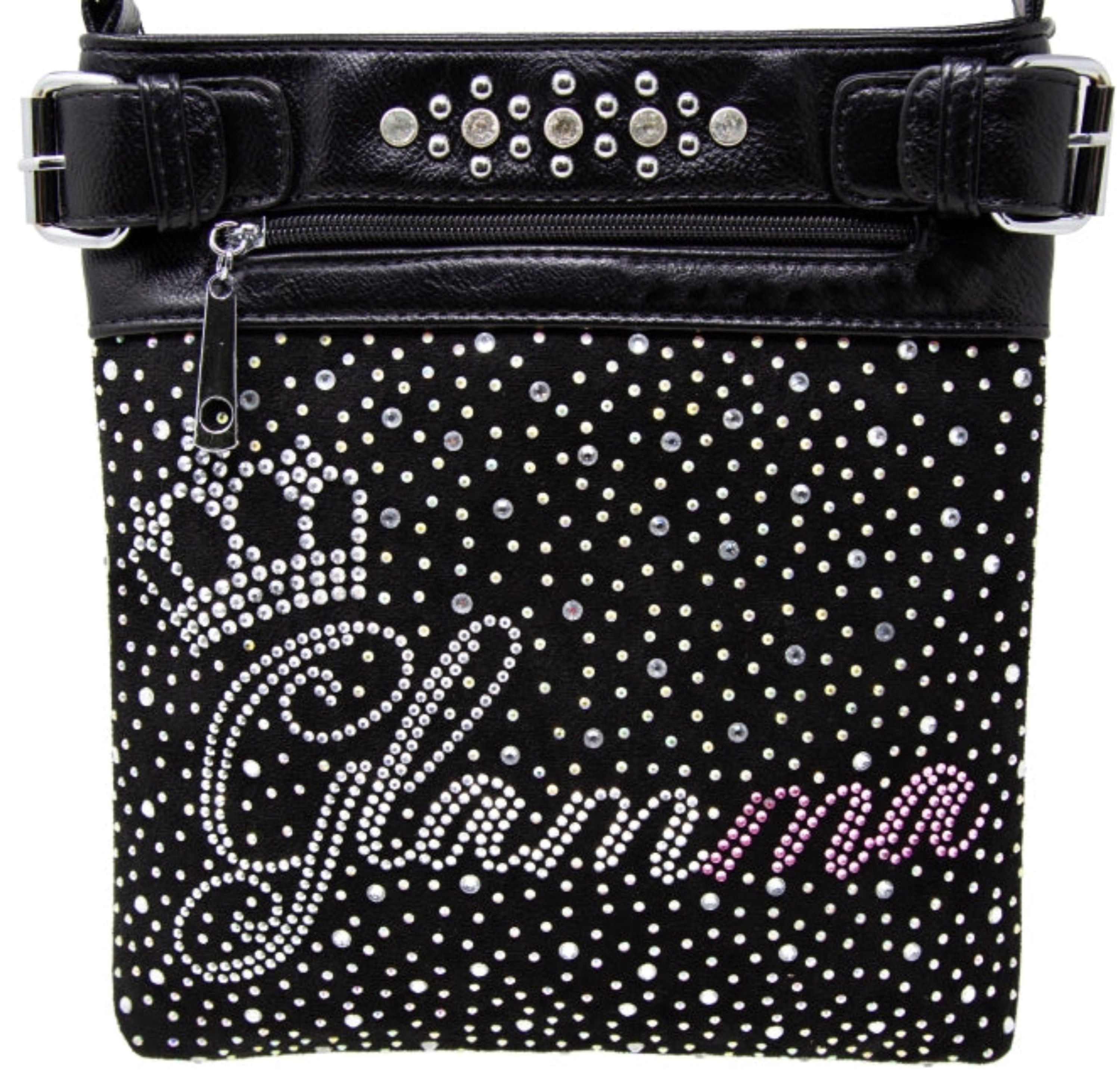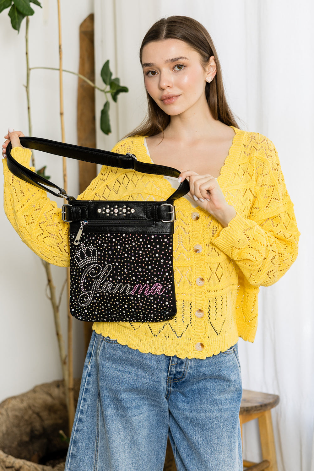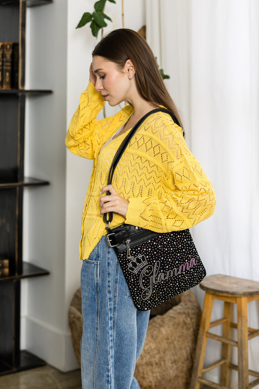 A classic crossbody sling in faux leather goes full GLAMMA with this fun rhinestone pattern.