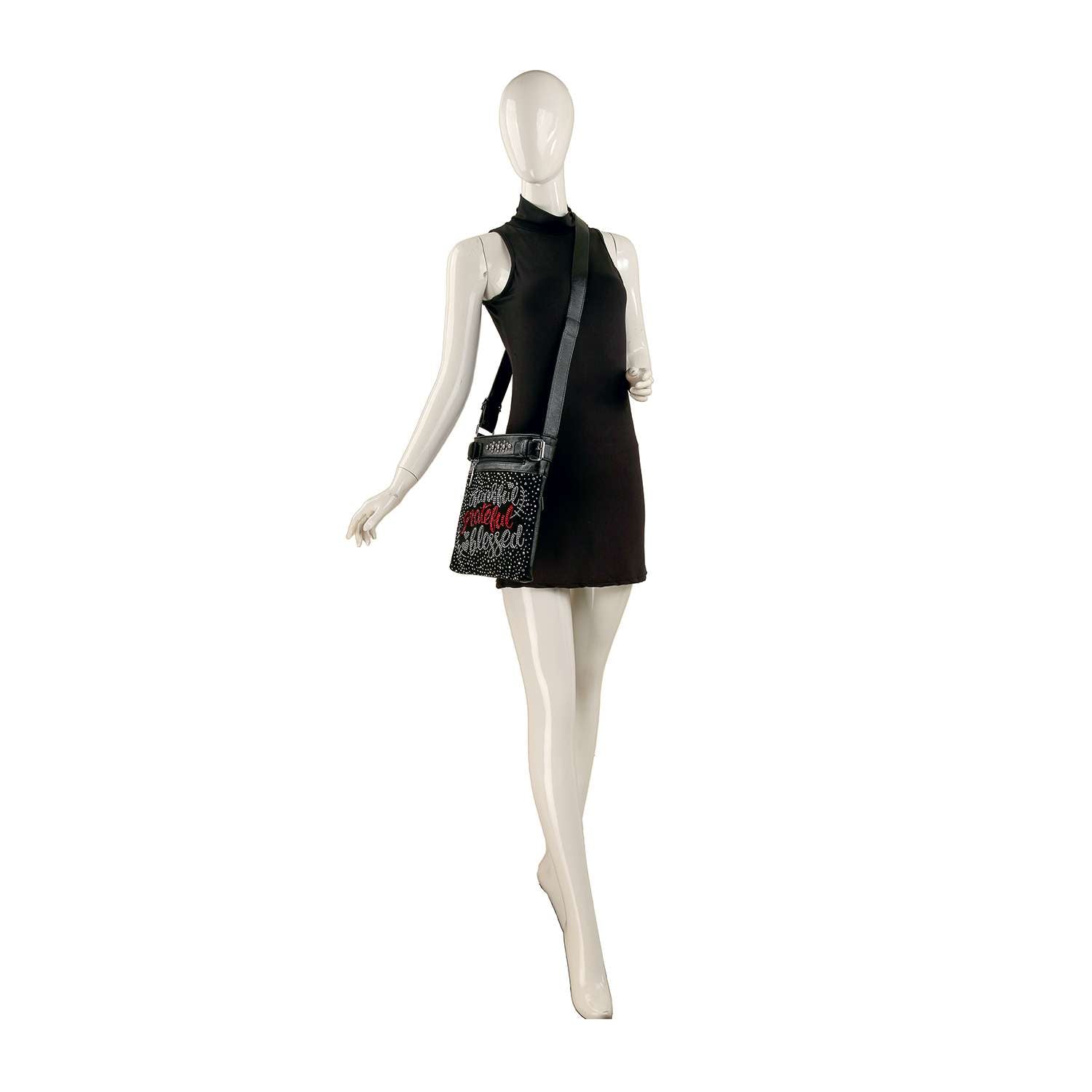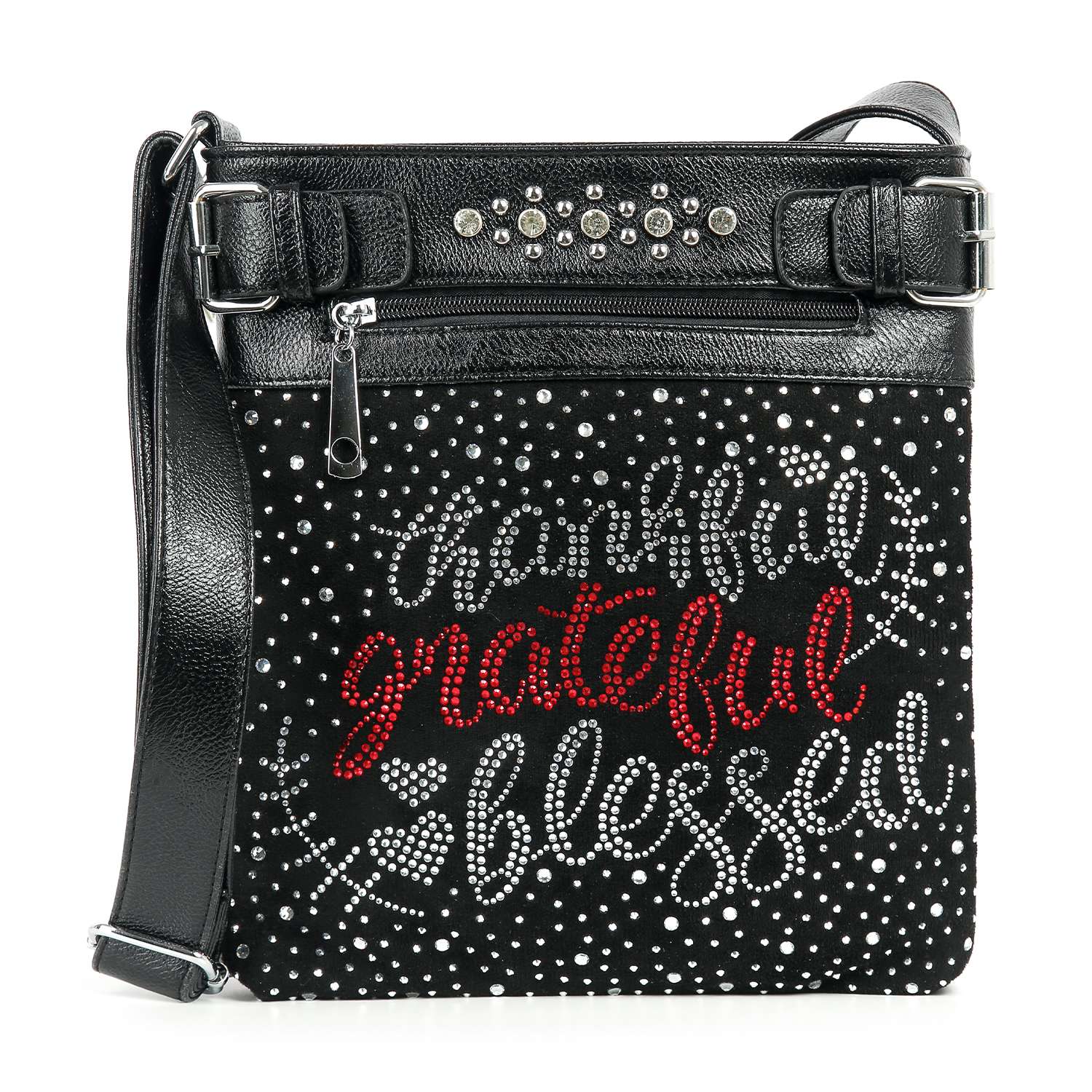 A classic crossbody sling in faux leather is Thankful, Grateful and Blessed in a sparkling rhinestone pattern.