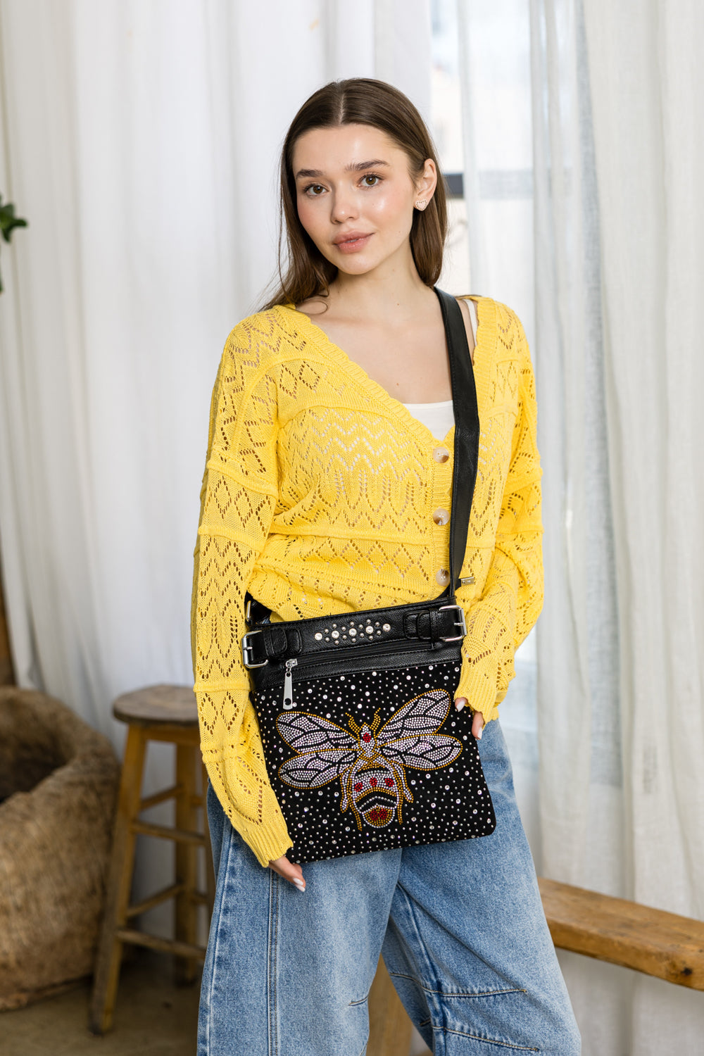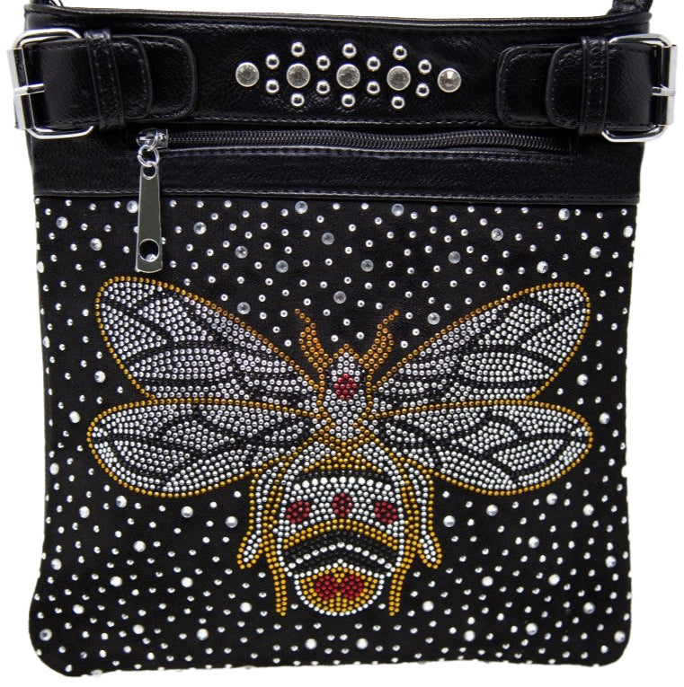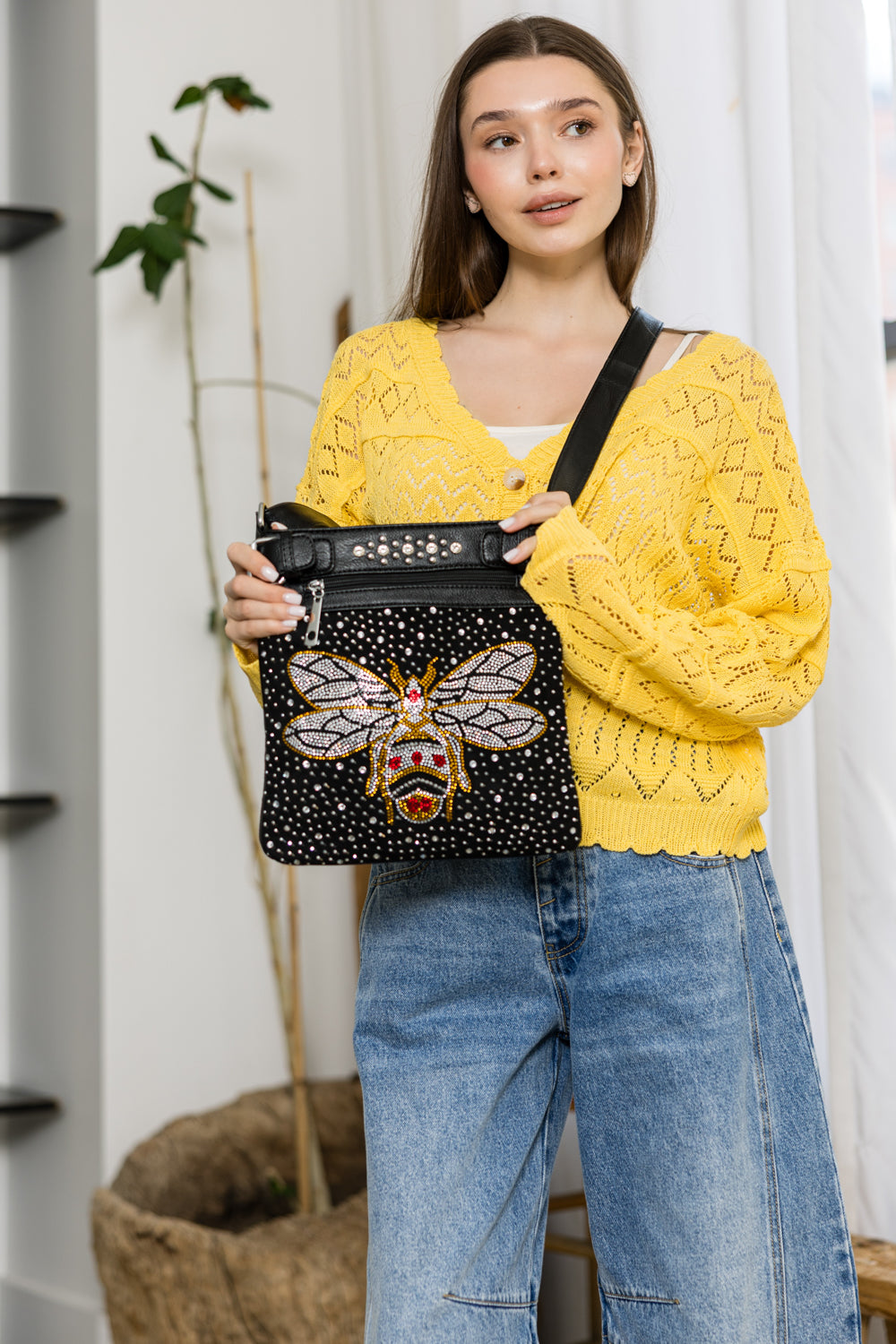This classic crossbody sling in faux leather features a signature rhinestone Bee. You can't get more on-trend right now.