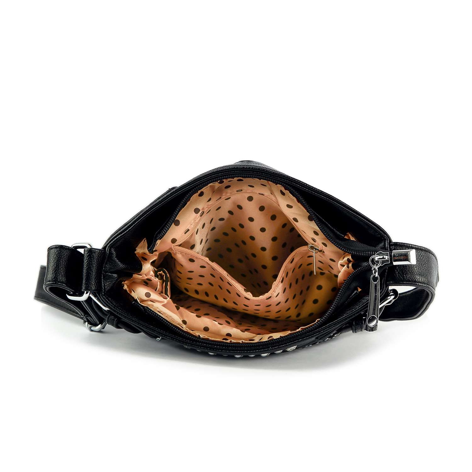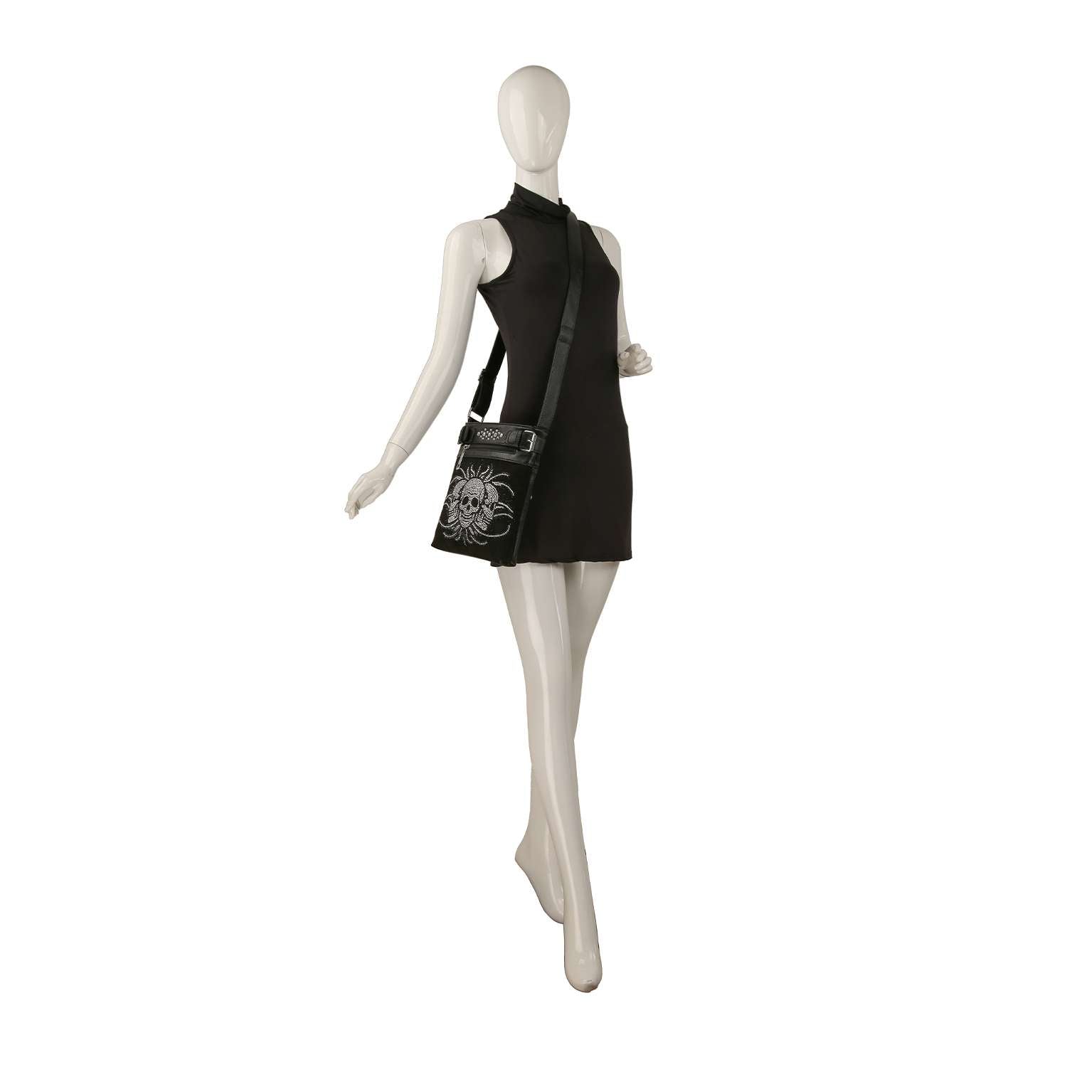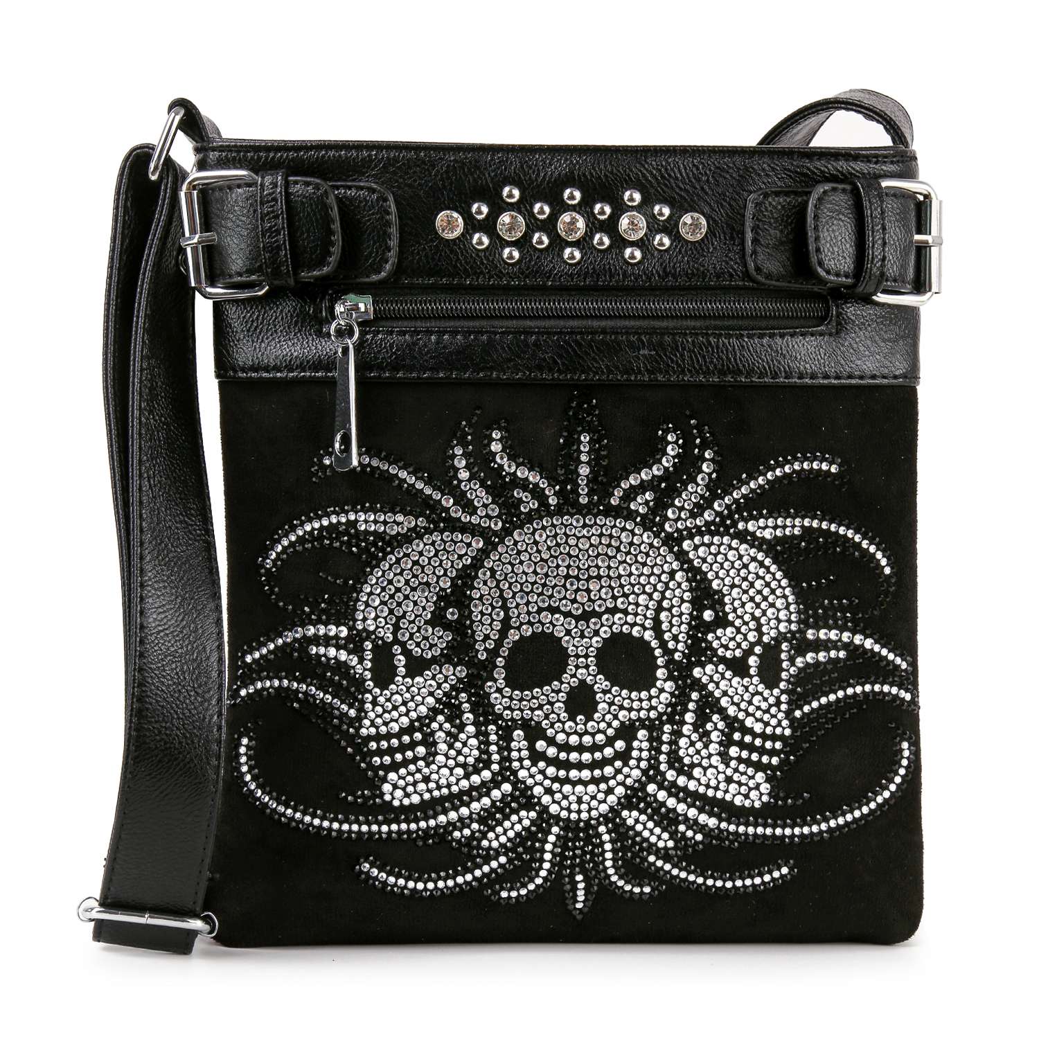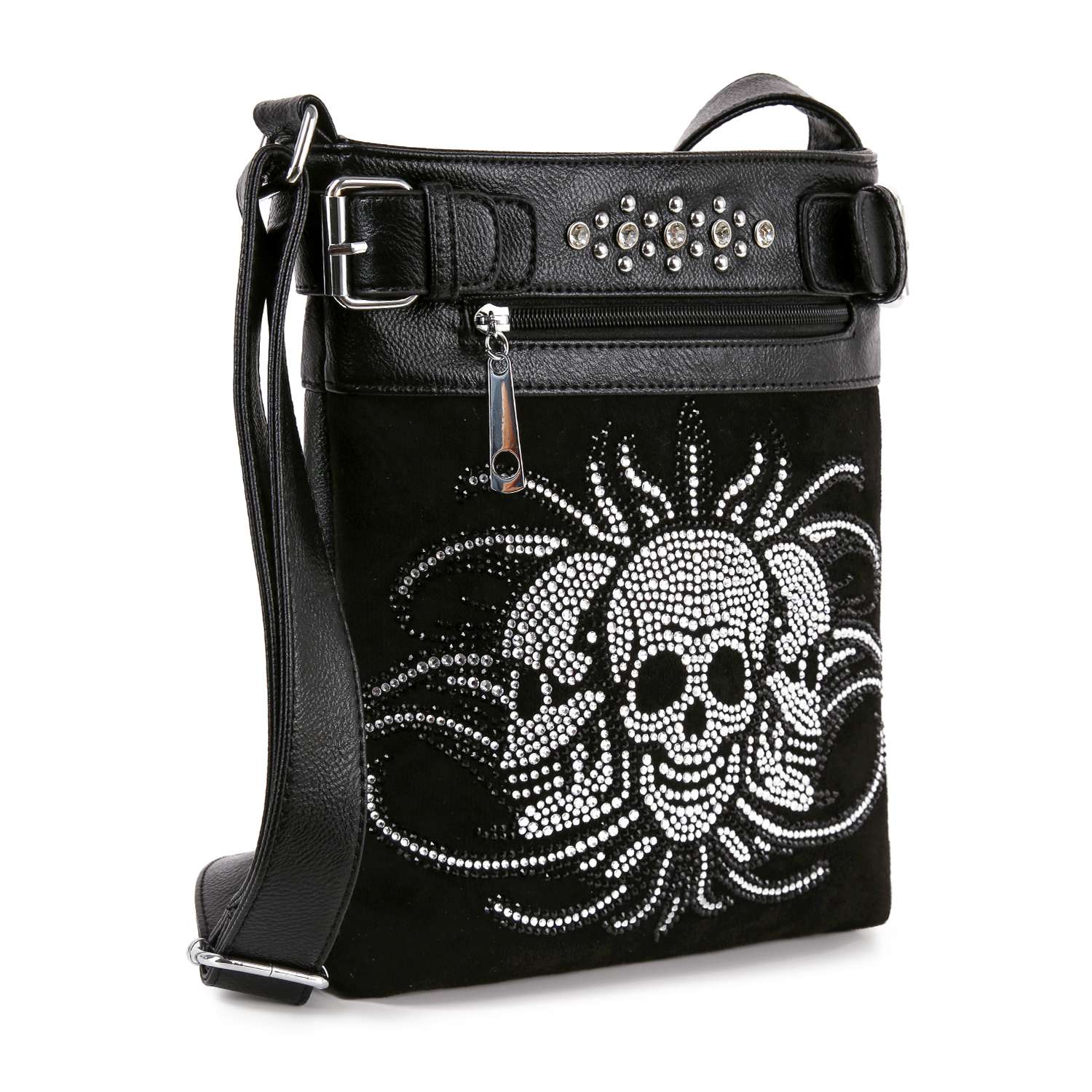 Edgy and cool at the same time, this distinctive crossbody features a trio of rhinestone bling skulls.