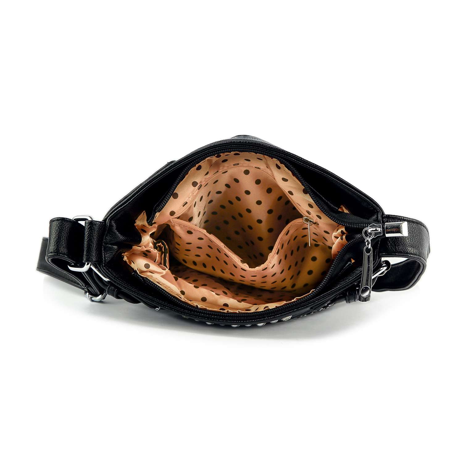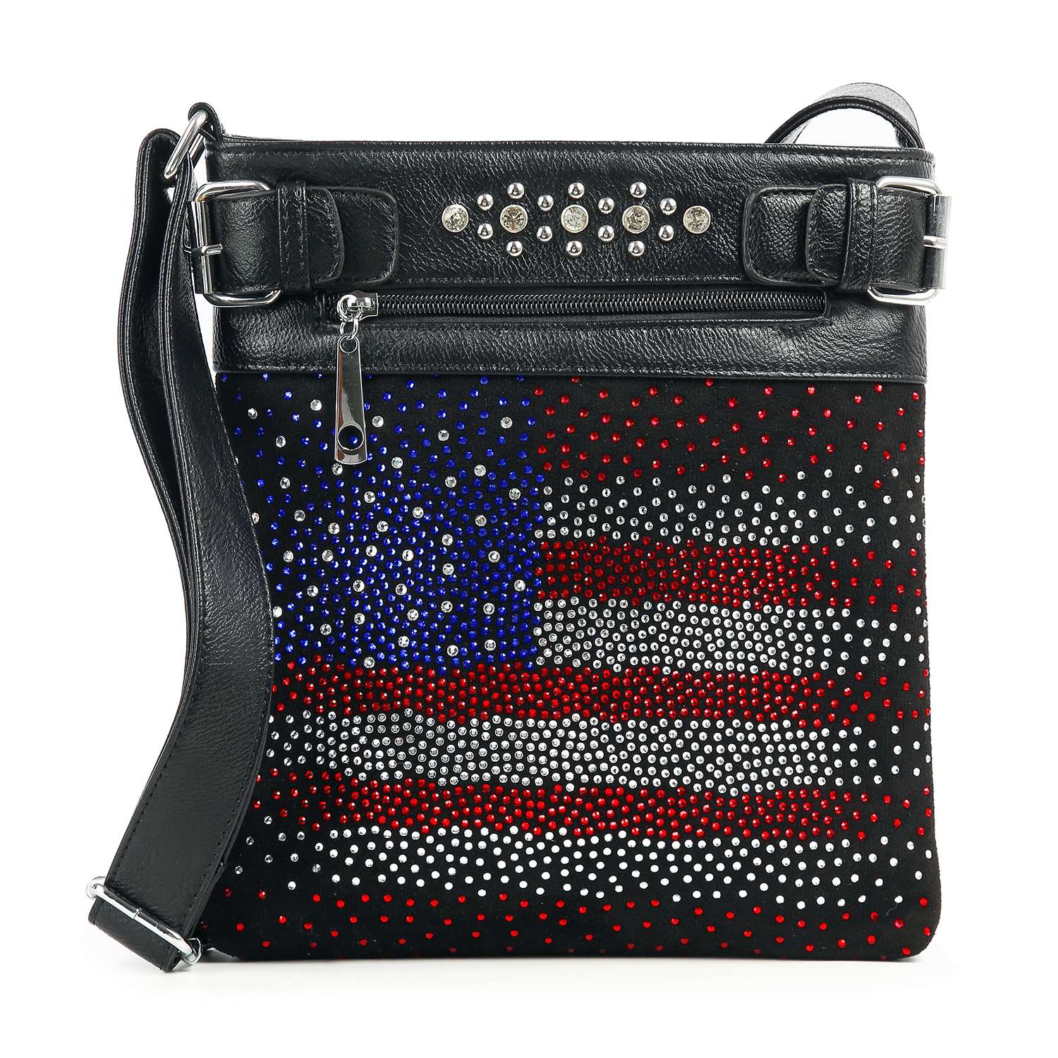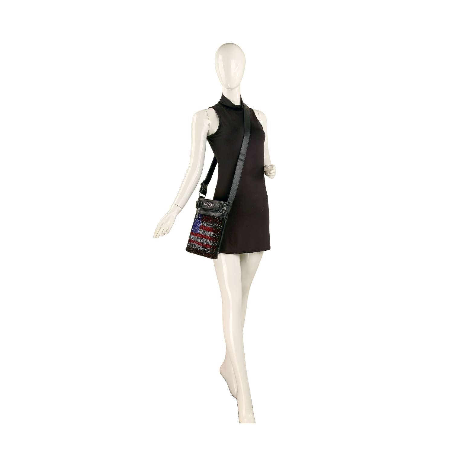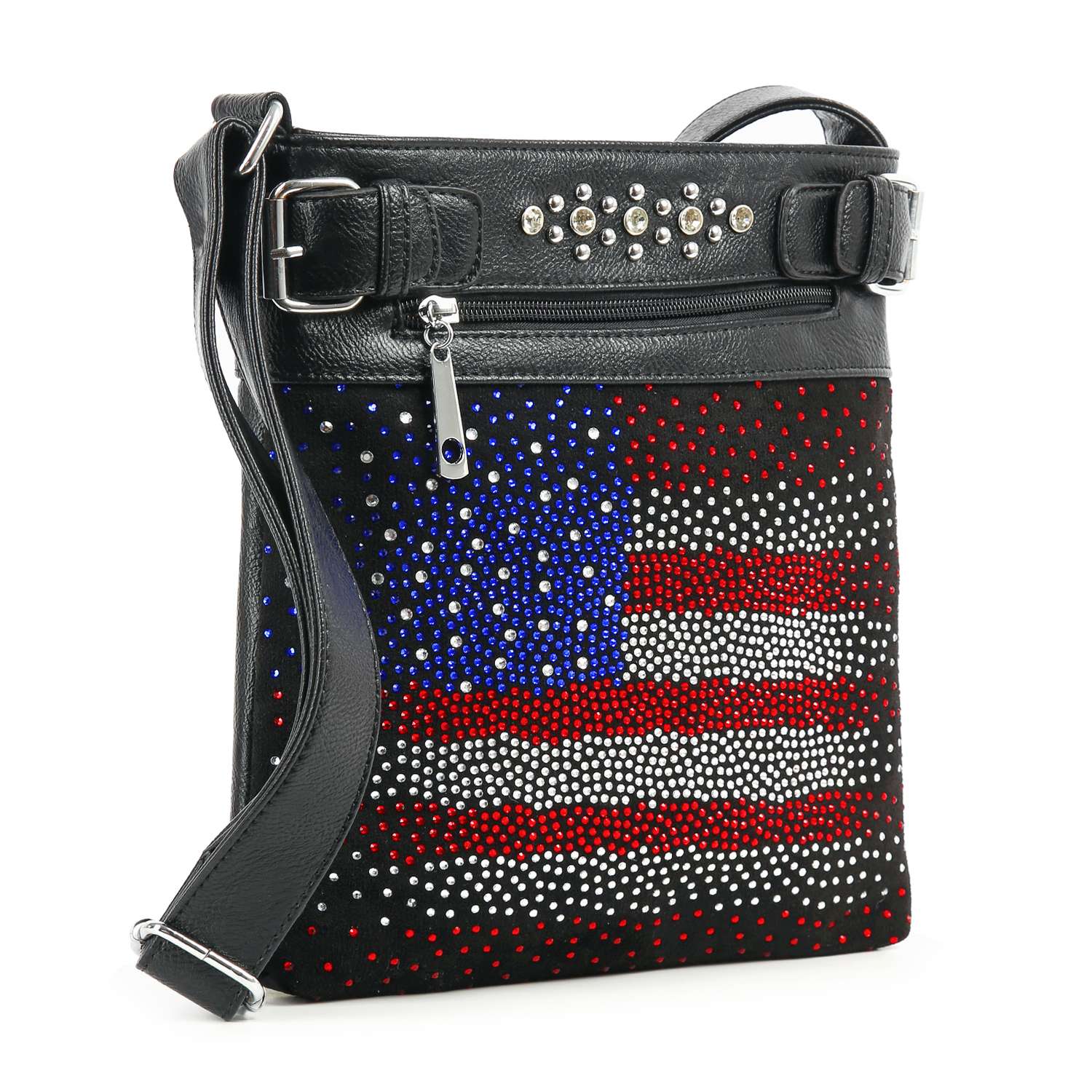 A crossbody sling in faux leather will make you feel your American pride with beautiful faded rhinestone pattern.