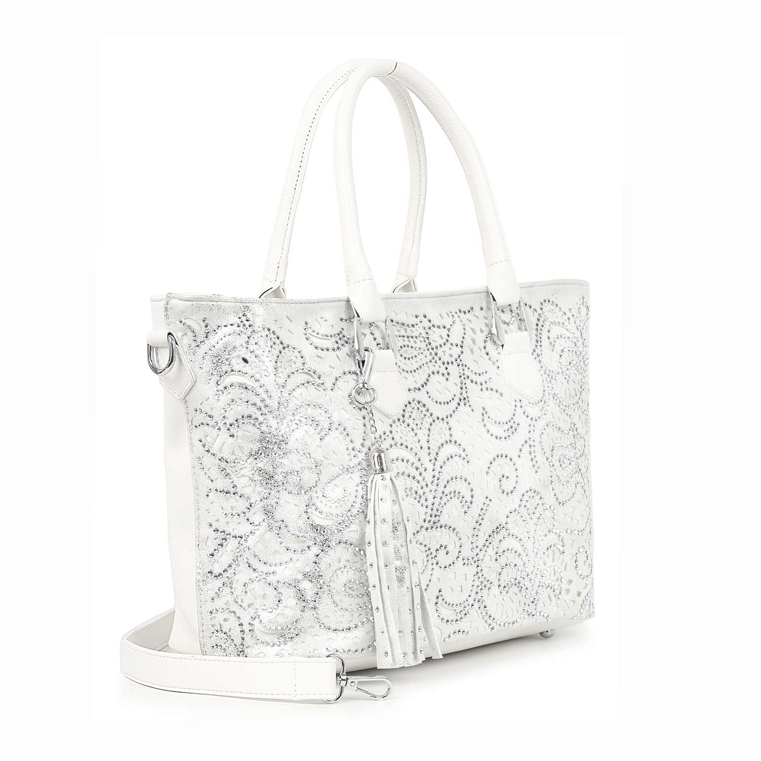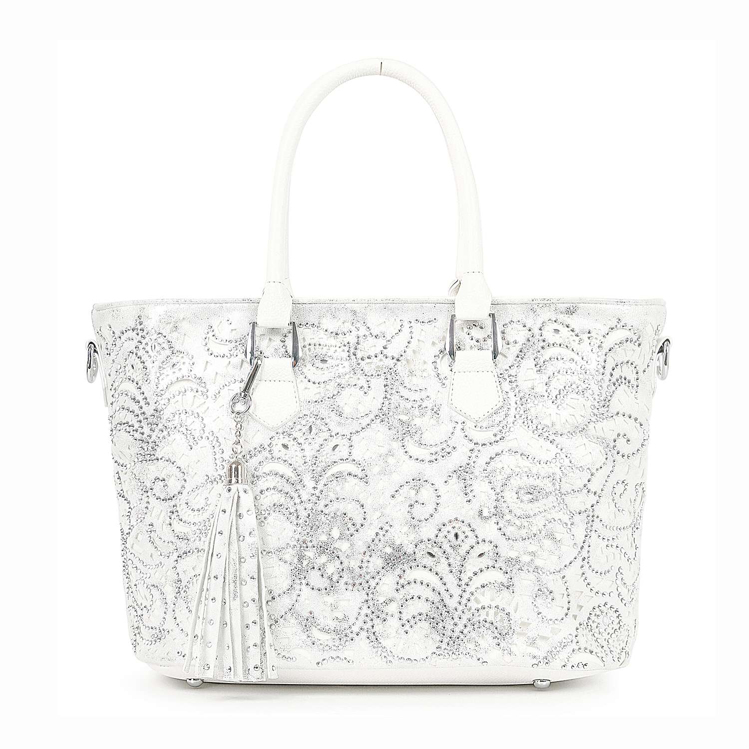 Shimmering rhinestones bring eye-catching allure to this layered tote.