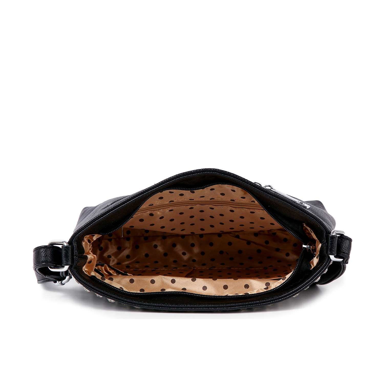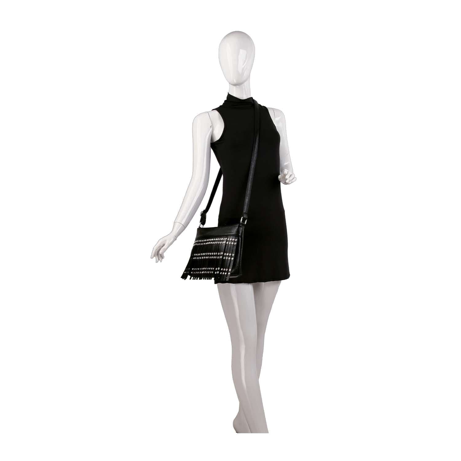 Layers of rhinestine studded fringe bring eye-catching movement to a chic crossbody sling handbag.