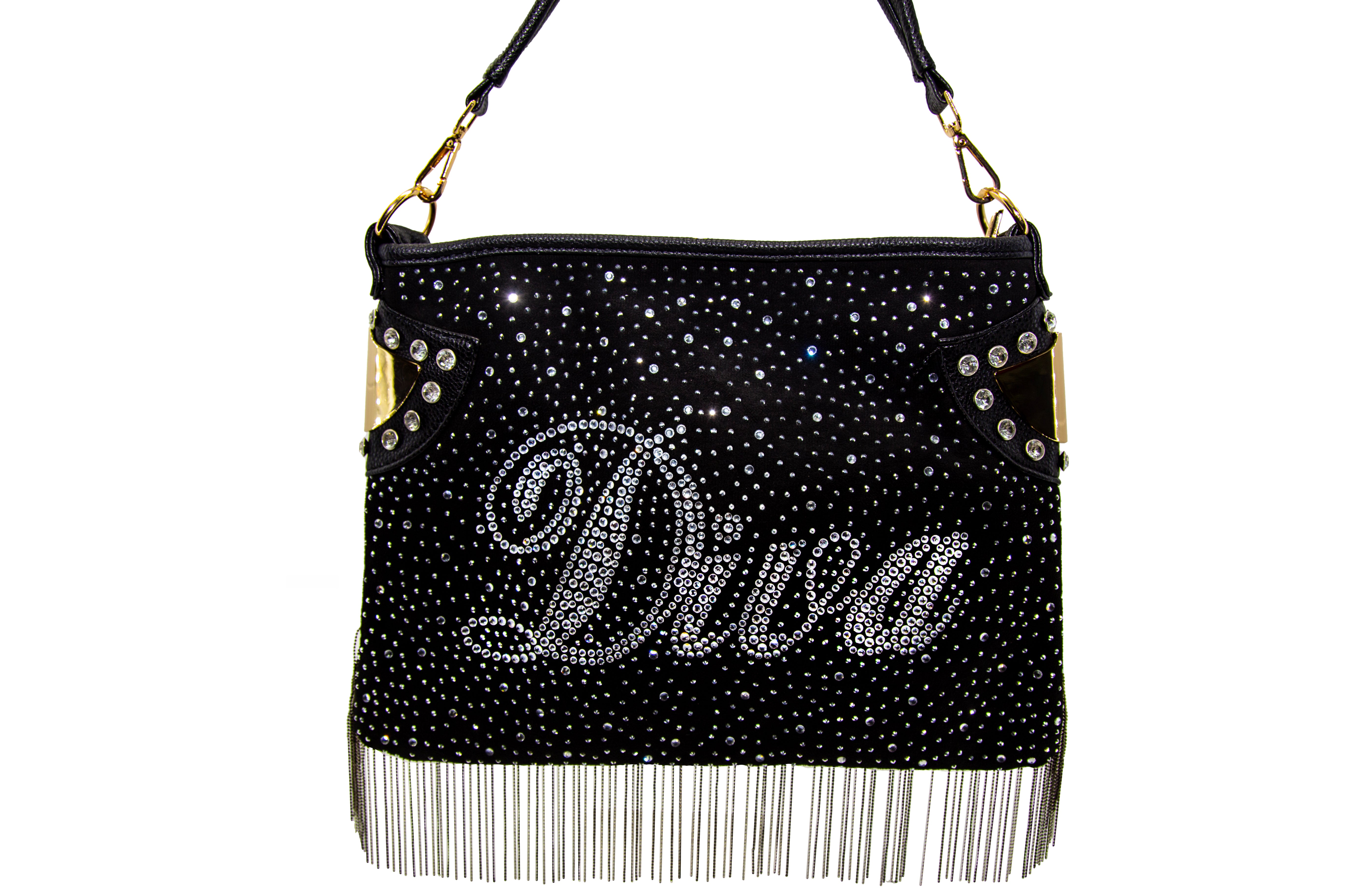 An effortlessly hip silhouette, this fashion hobo is sprinkled with stones and has a rhinestone Diva design.