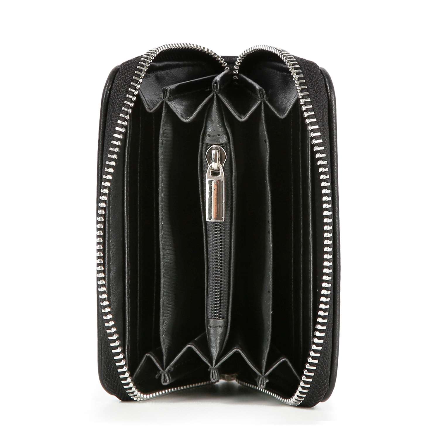 Interior zip divider pocket, multiple currency slots and card slots.