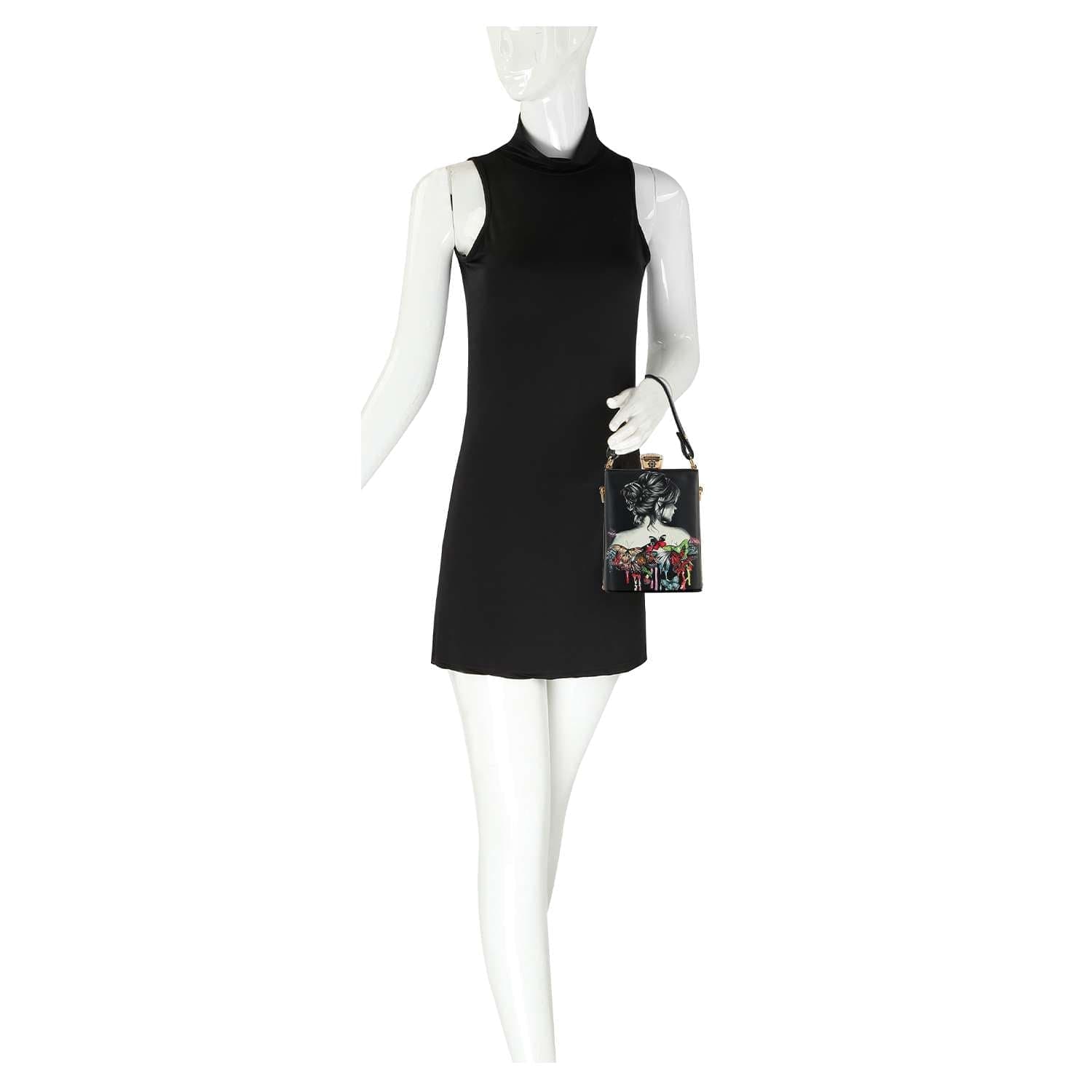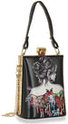 An Art Deco inspired print dazzles against the metal frame exterior of a petite hand tote fitted with a crossbody chain for hands free styling.