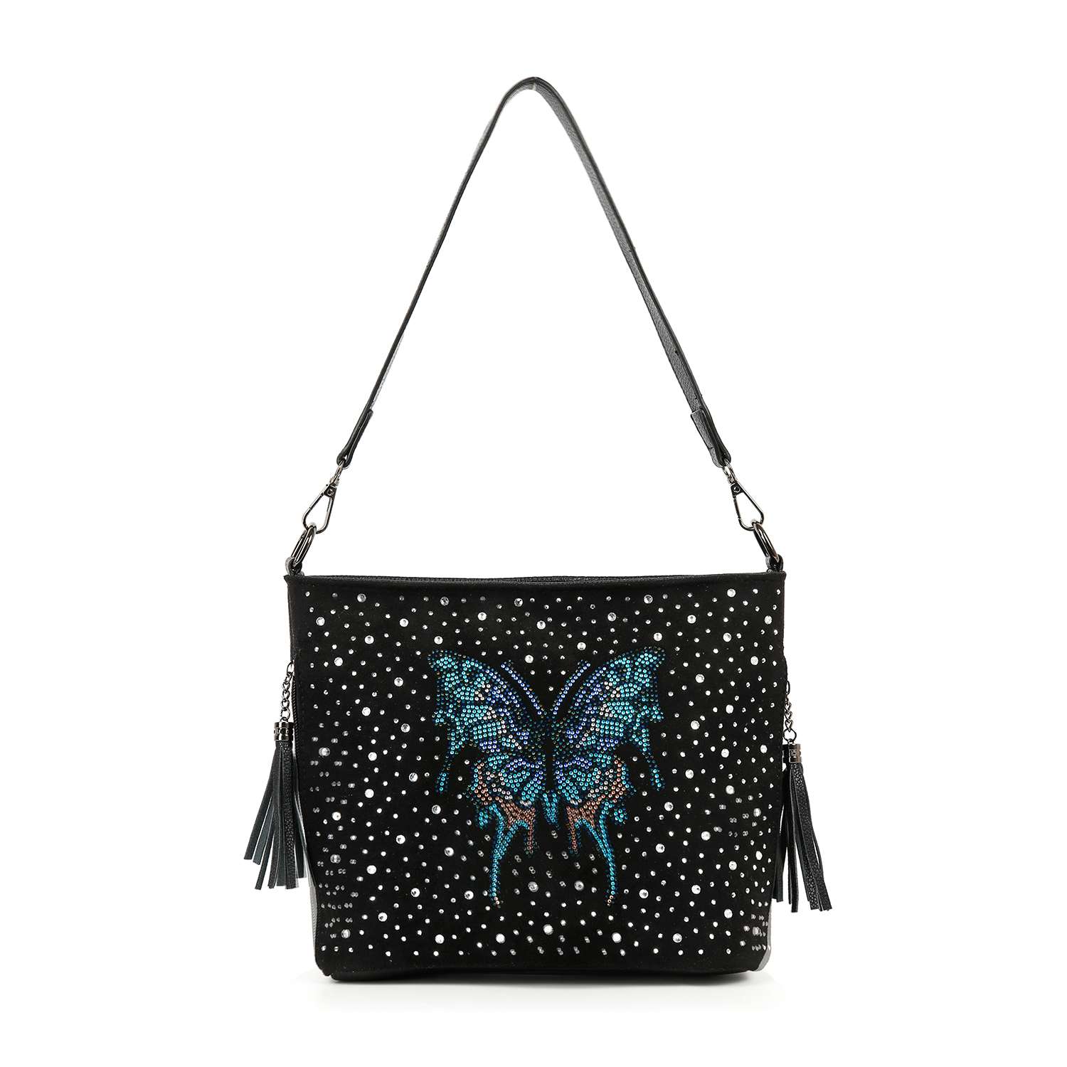 A gorgeous, colorful rhinestone design gives this perfectly sized hobo a truly unique edge. Tassel accents add charm and the crossbody strap is the perfect accompaniment!