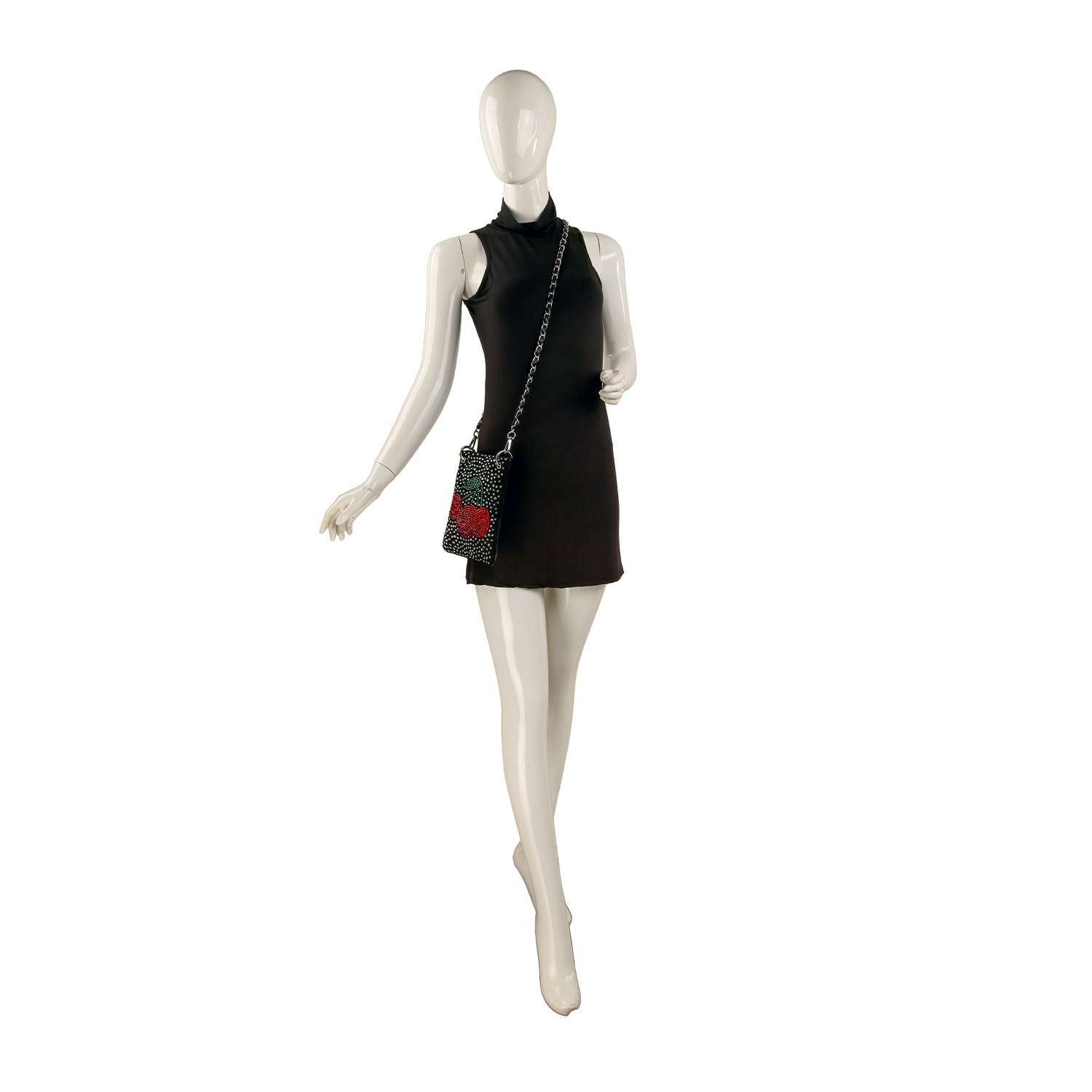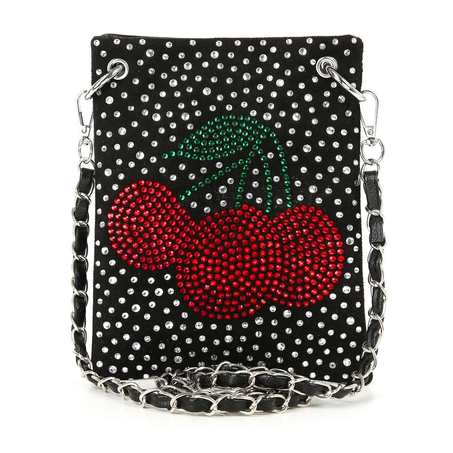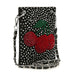 Big bling does come in small packages! A stunning, rhinestone Cherries design covers this ultra petite crossbody sling.