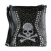 The Skull Rhinestone Crossbody Sling is a black faux leather bag with silver studs and rhinestones, highlighted by a bold skull and crossbones design—perfect for making an edgy statement.