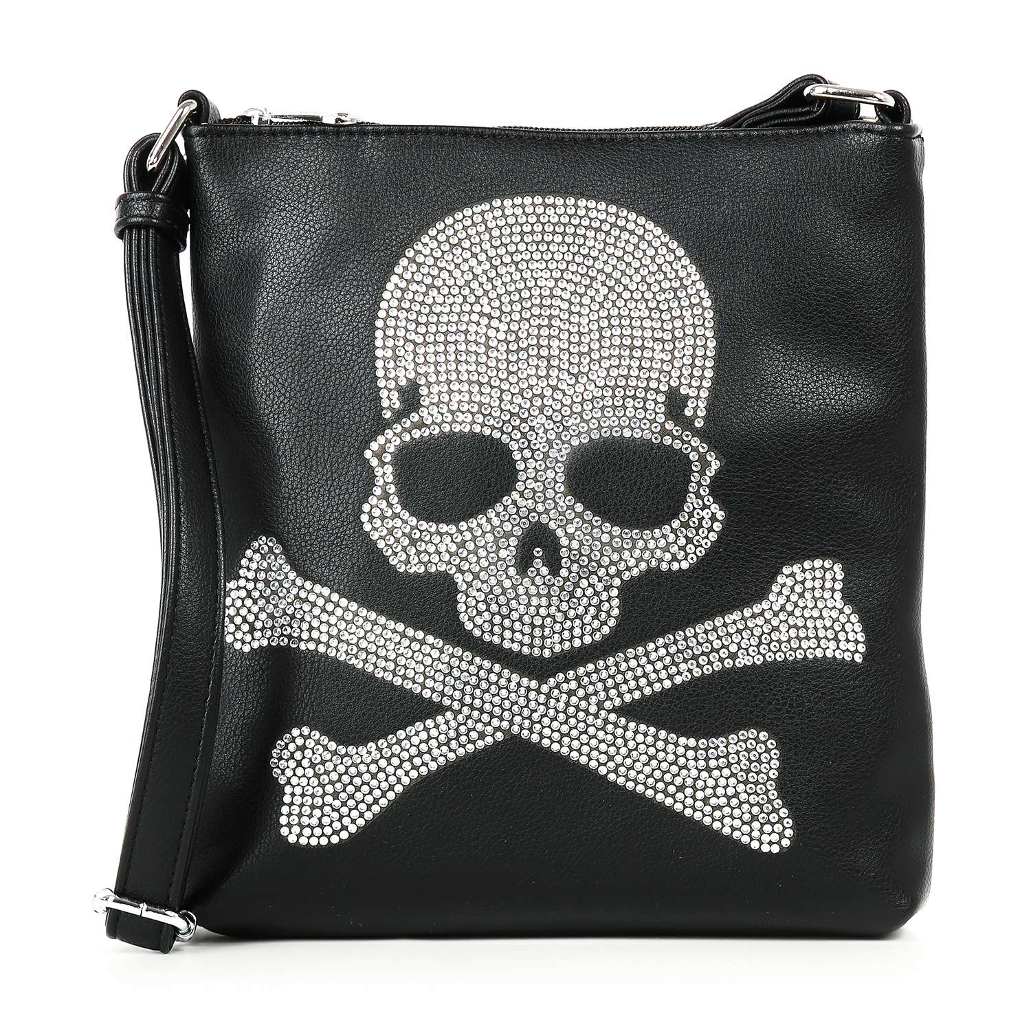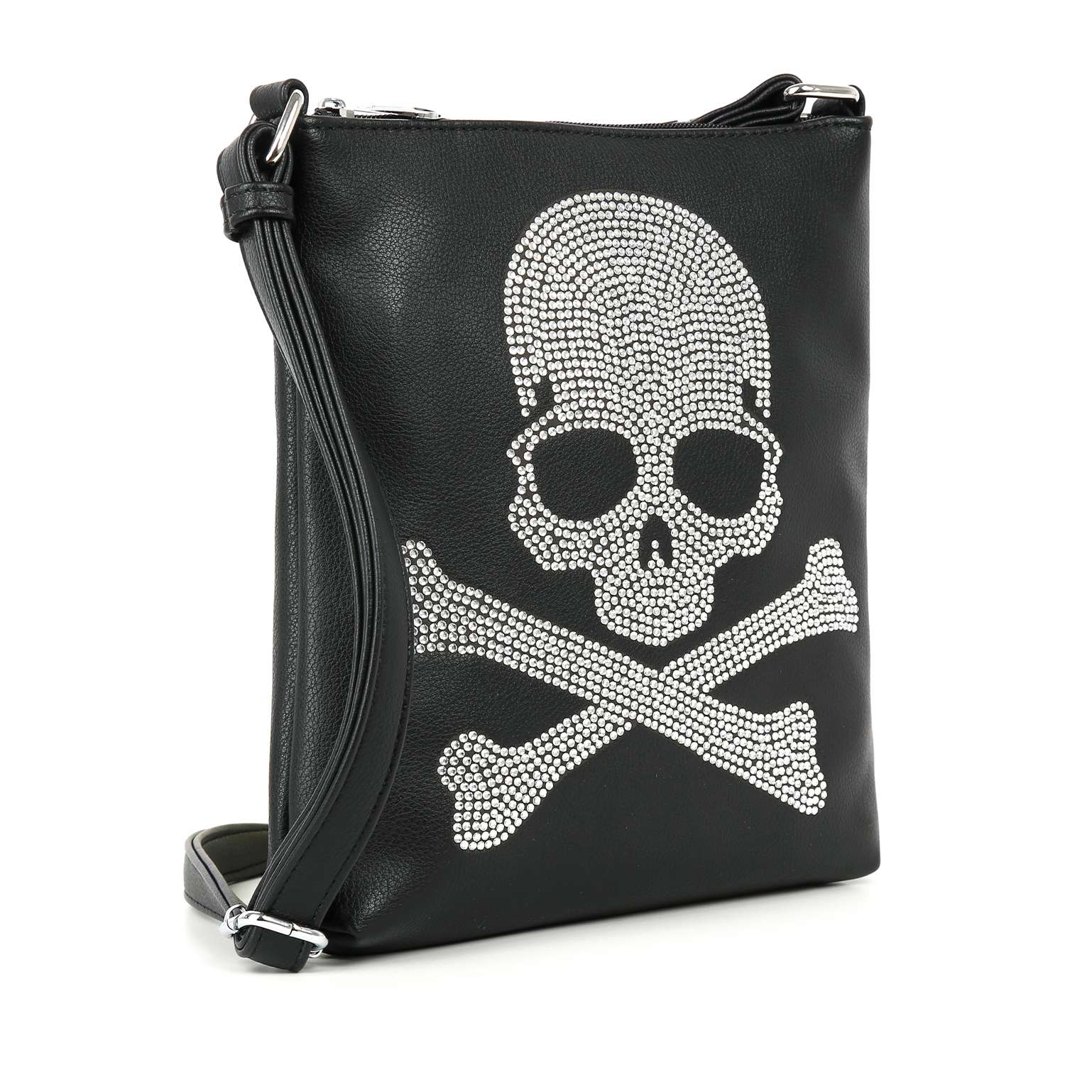 A slim crossbody sling in faux leather with a centerpiece  bling Skull and Crossbones. This is the...