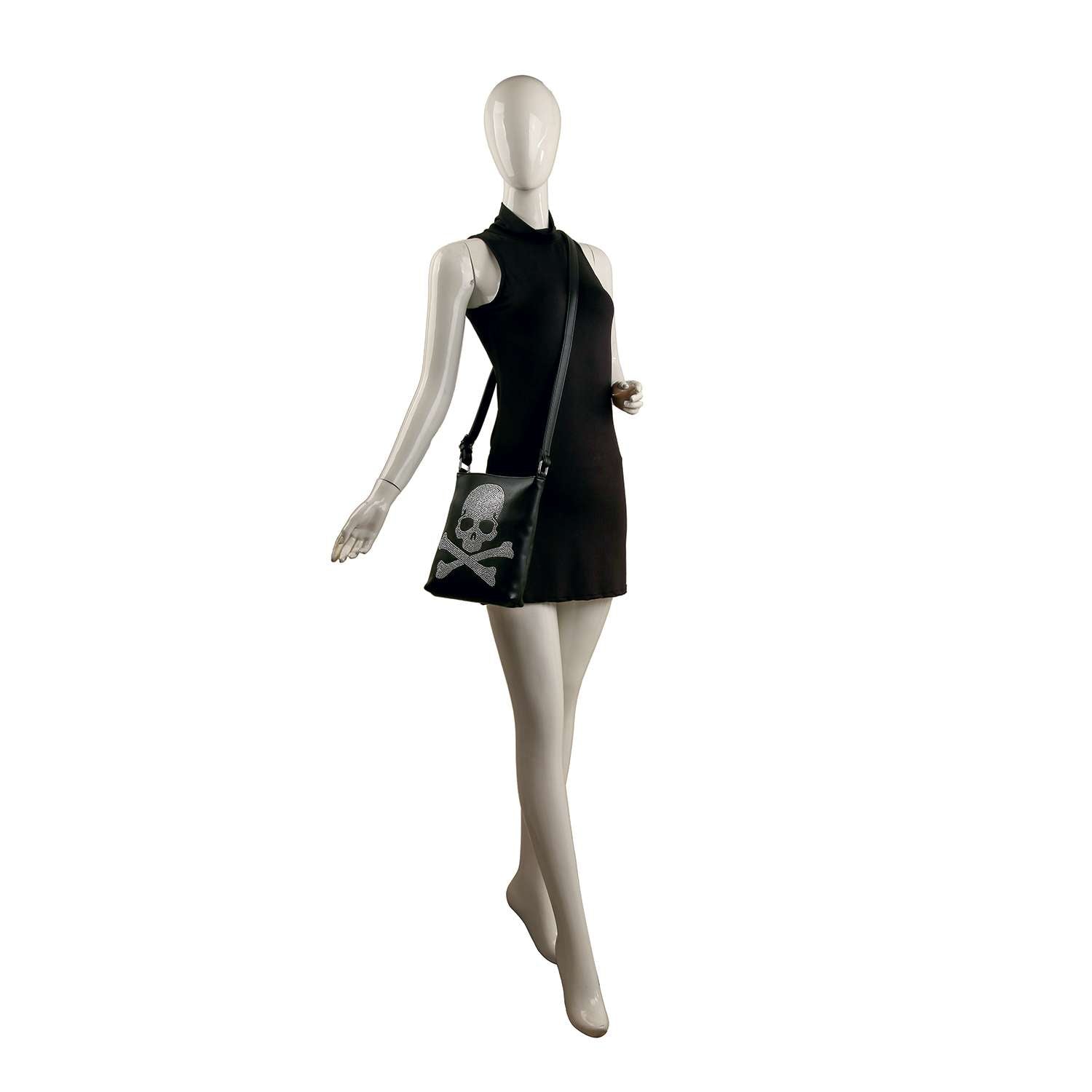 A slim crossbody sling in faux leather with a centerpiece  bling Skull and Crossbones. This is the bag you carry when you want to be noticed.