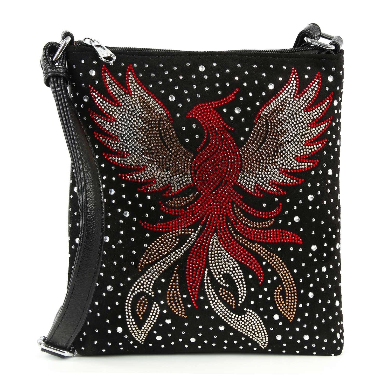 This unique crossbody features a beautifully unique sparkling Phoenix design  that is guaranteed to turn heads