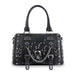 Studs enhance the edgy glamour of this signature satchel that's covered in buckles and chains, embellished with a cool silvery skull