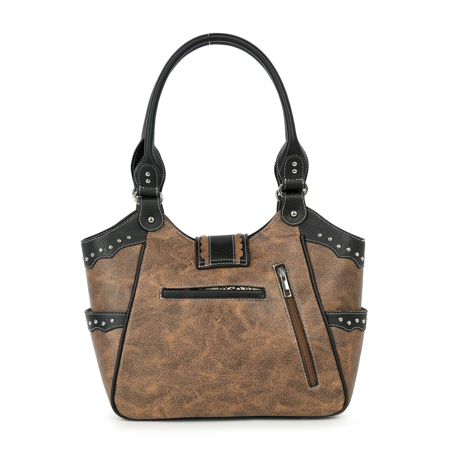 This high quality, faux-leather shoulder bag offers a big-sky beautiful, Western style and keeps all your essentials organized and easy to access.