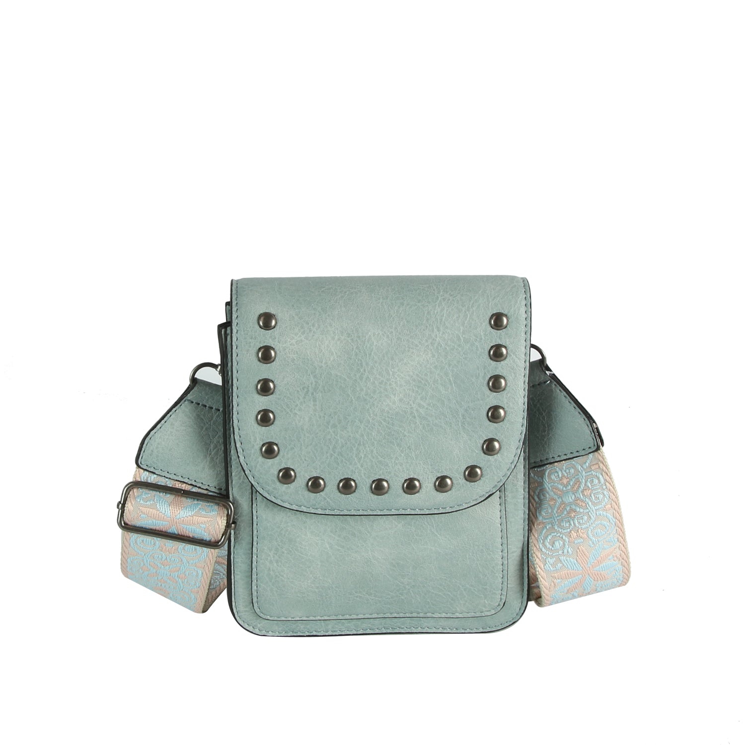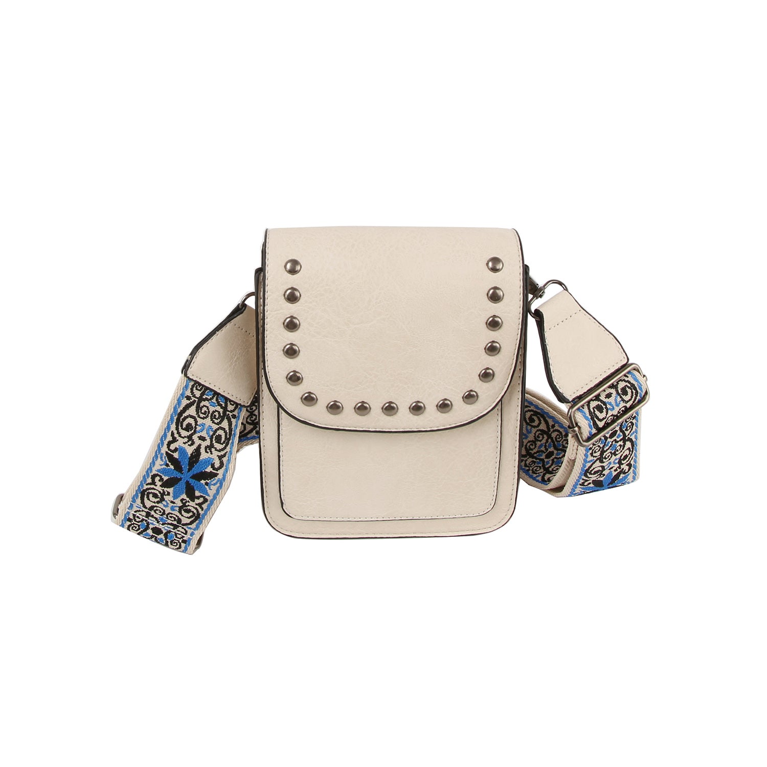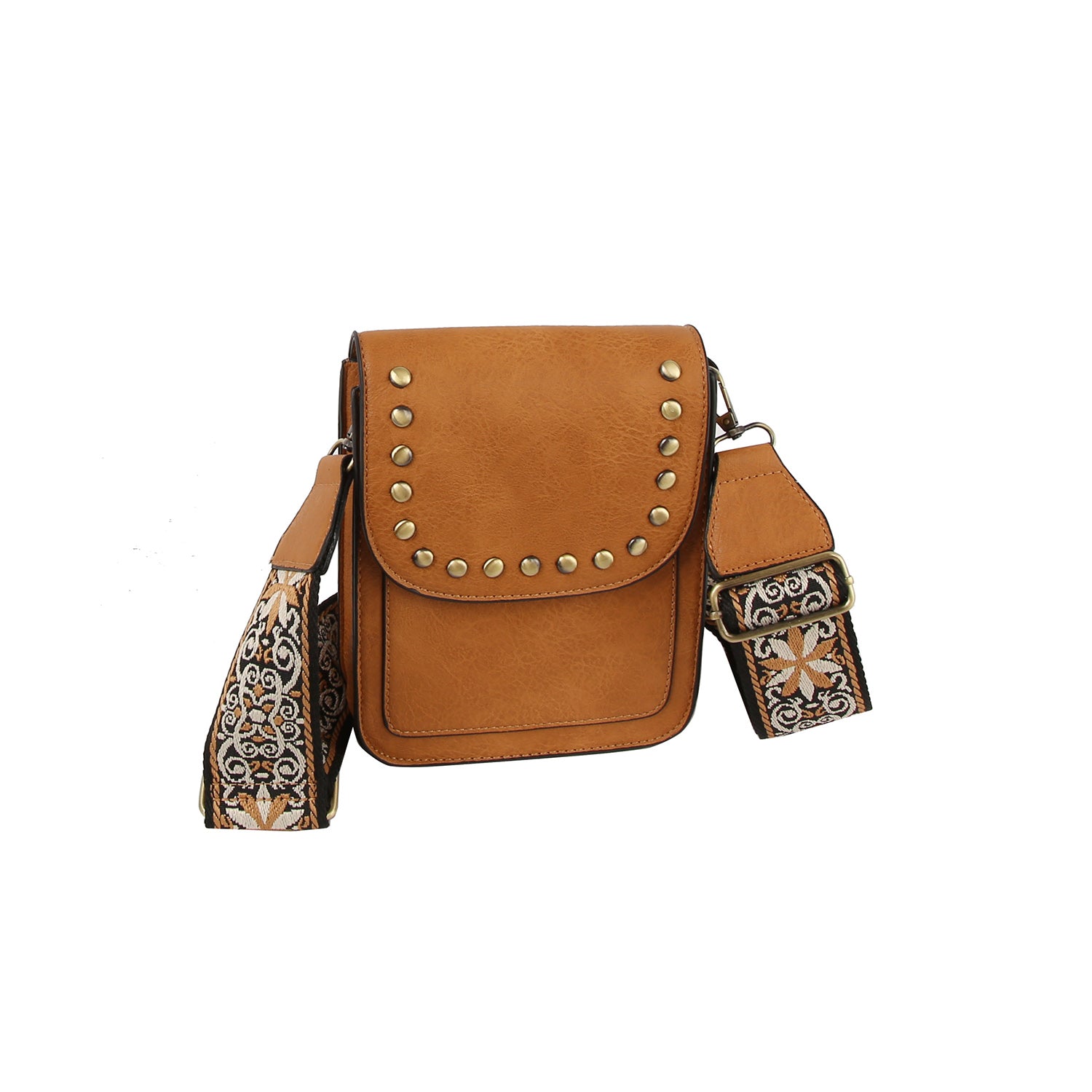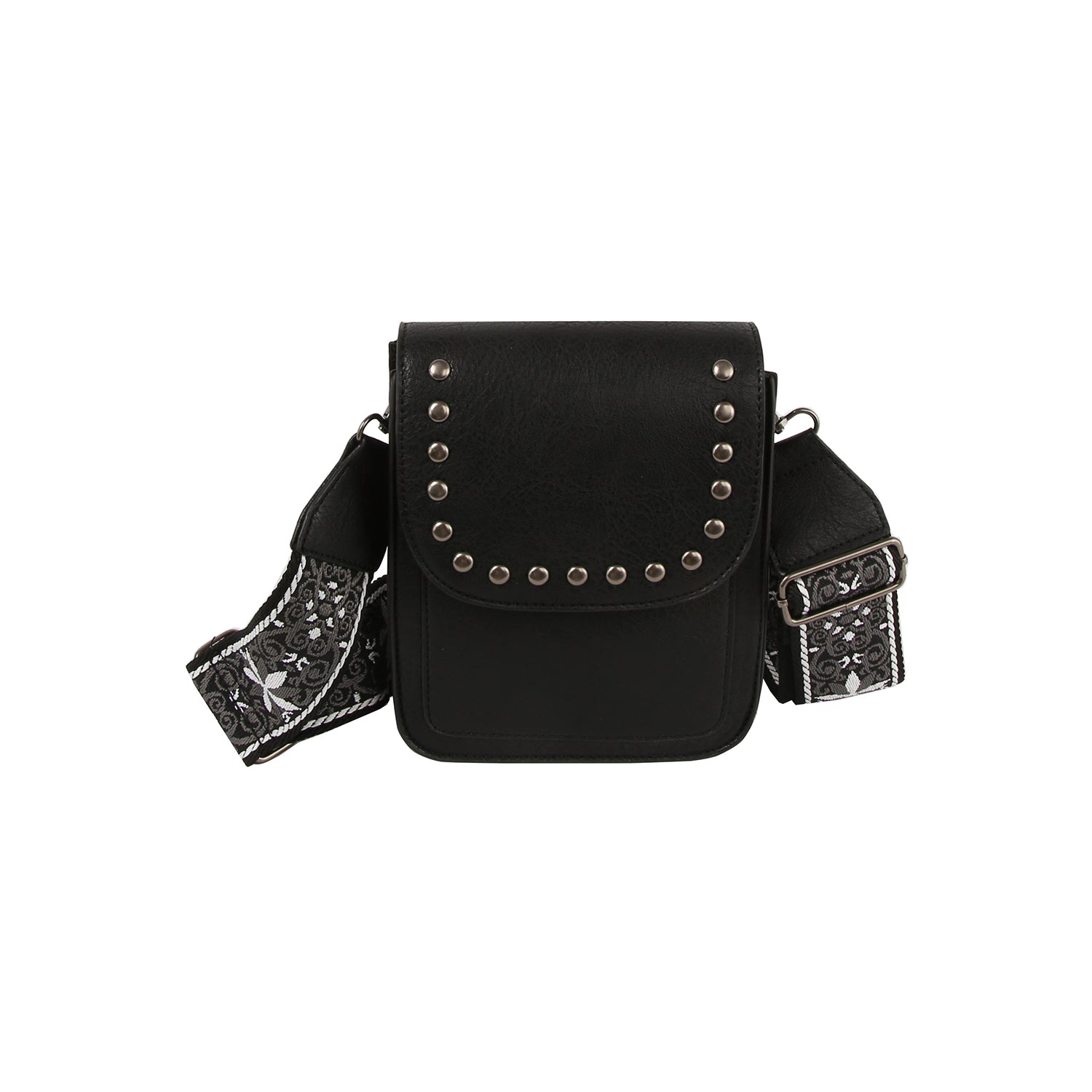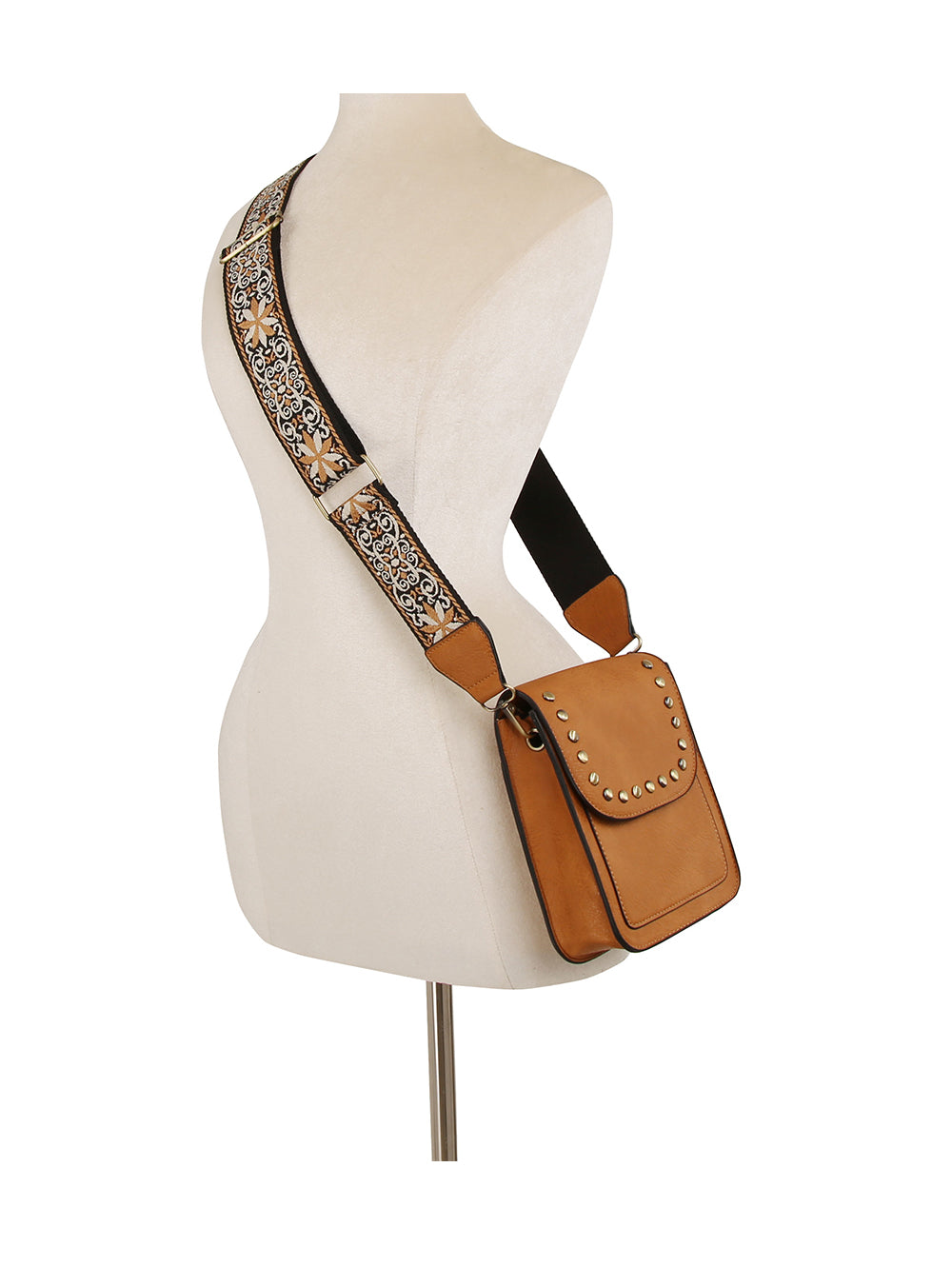 Features a striking embroidered guitar strap for a bold, stylish statement Compact crossbody design with studded flap...