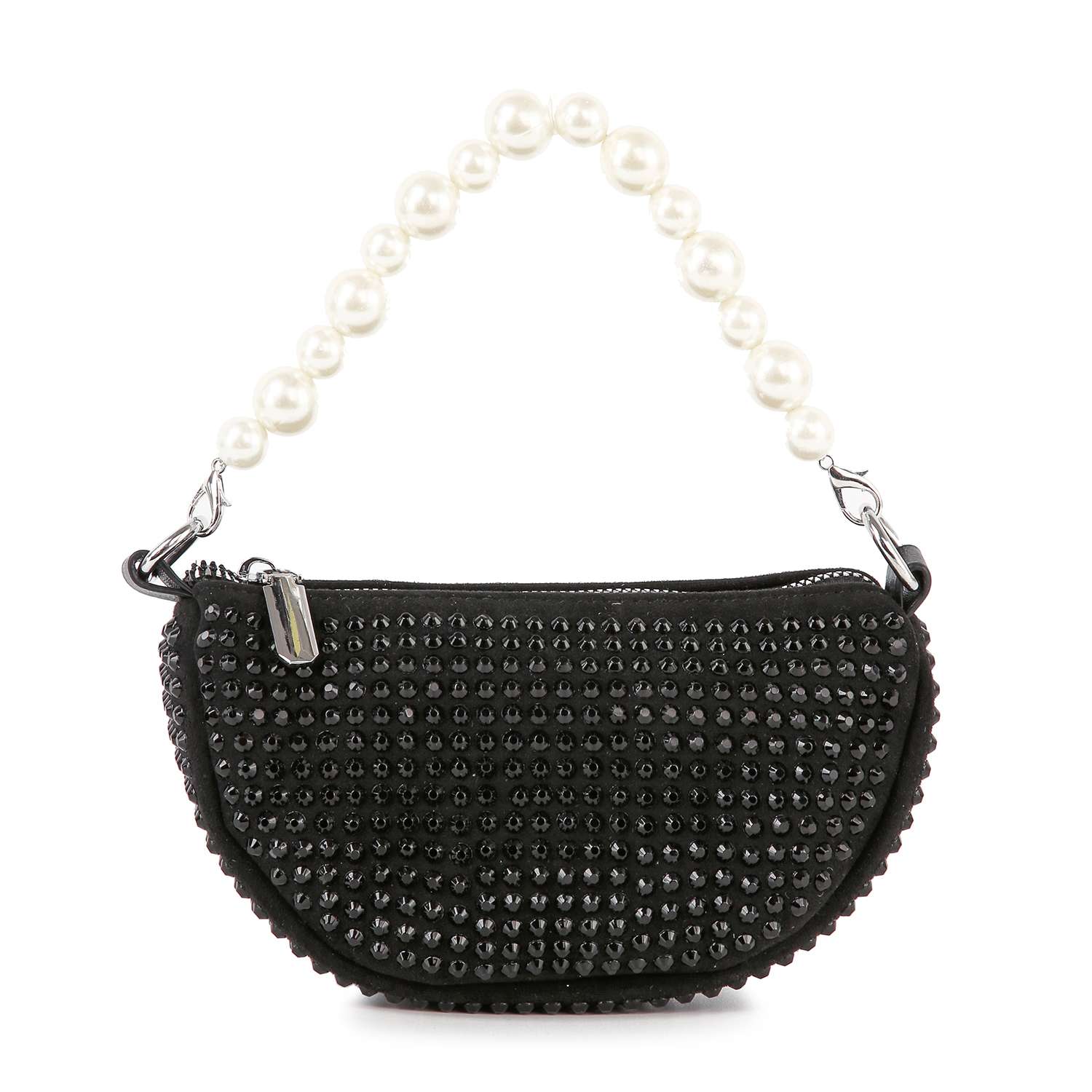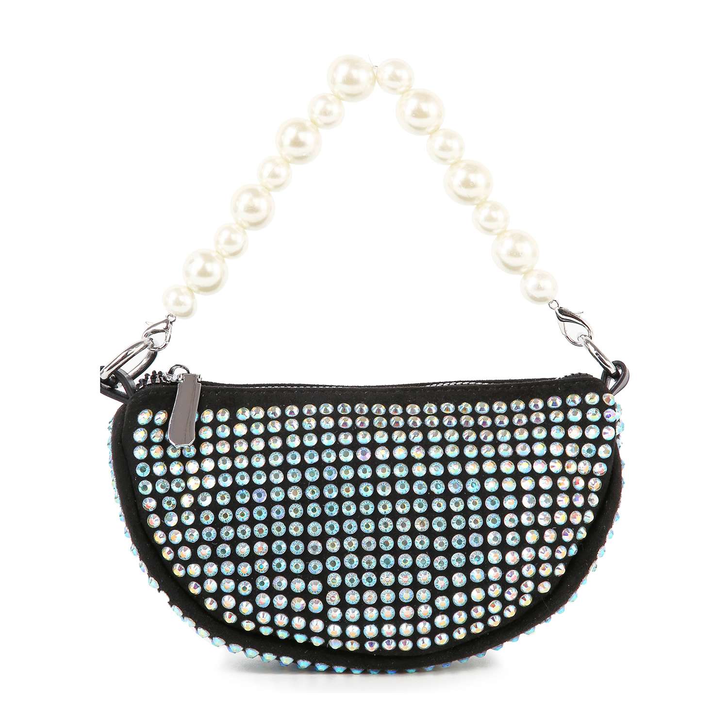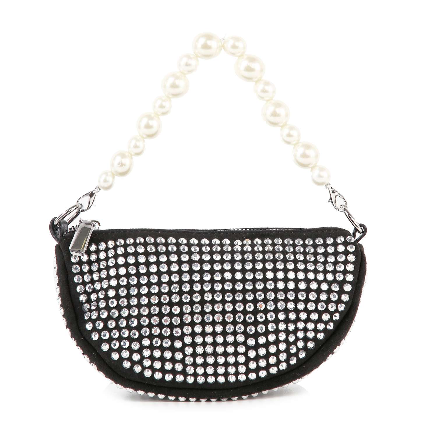 A beaded pearl strap accents this evening bag which is covered in rows of tiny sparkling crystals,...