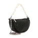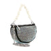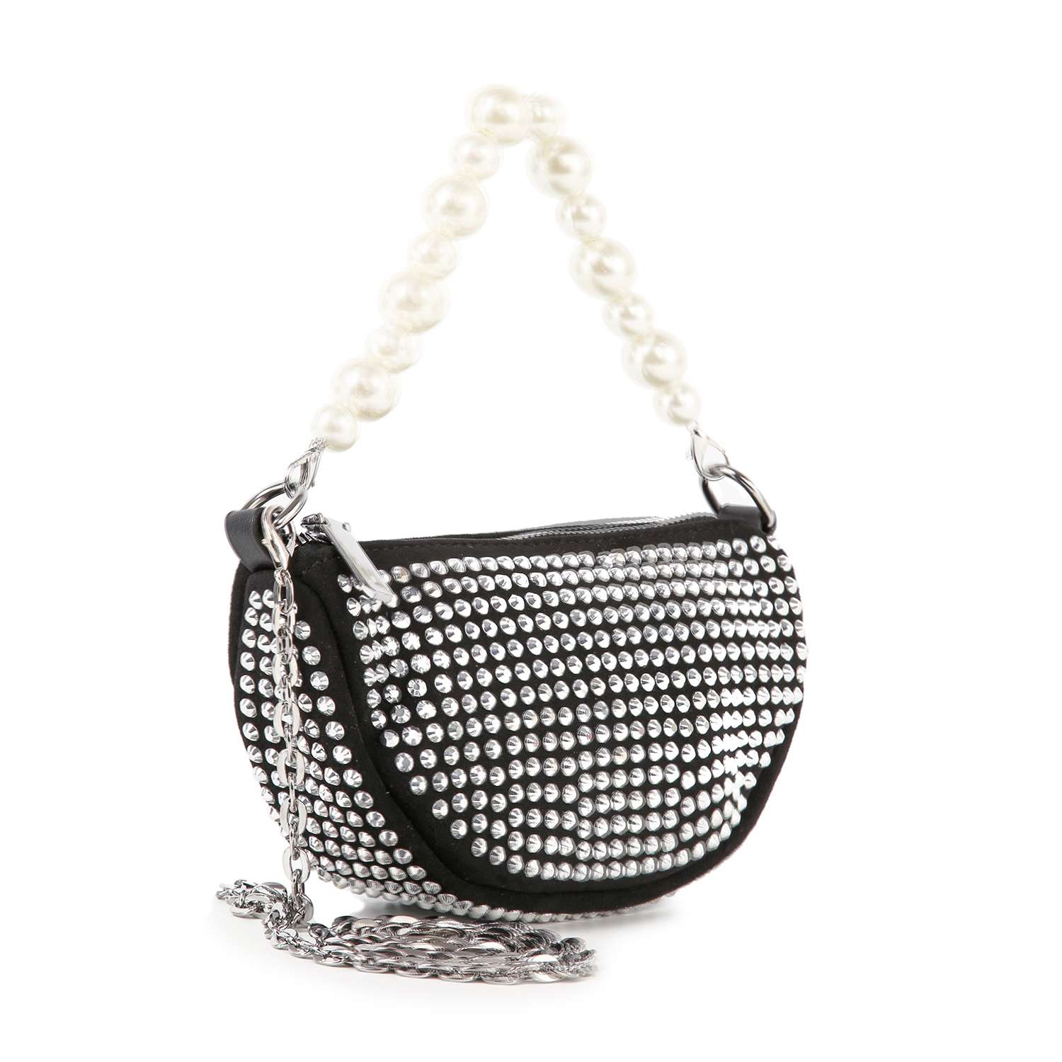 A beaded pearl strap accents this evening bag which is covered in rows of tiny sparkling crystals, while a chain strap frees up your hands once hors d'ouevres are served.