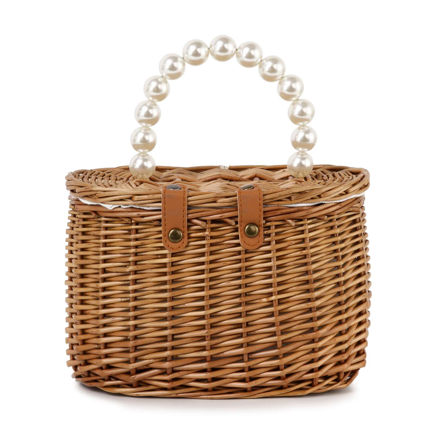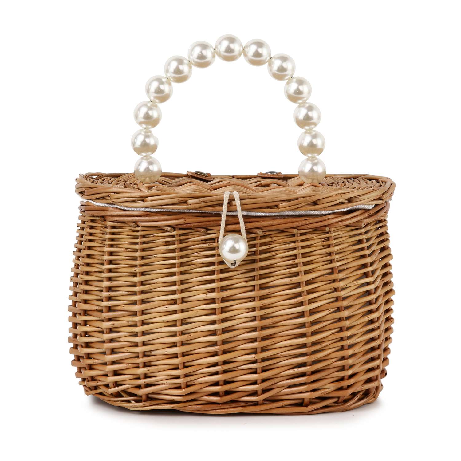A classic market basket. The timeless silhouette of this versatile tote  expertly crafted and trimmed with an adorable pearl styled handle.