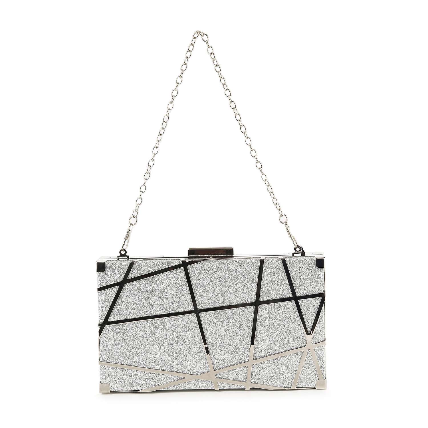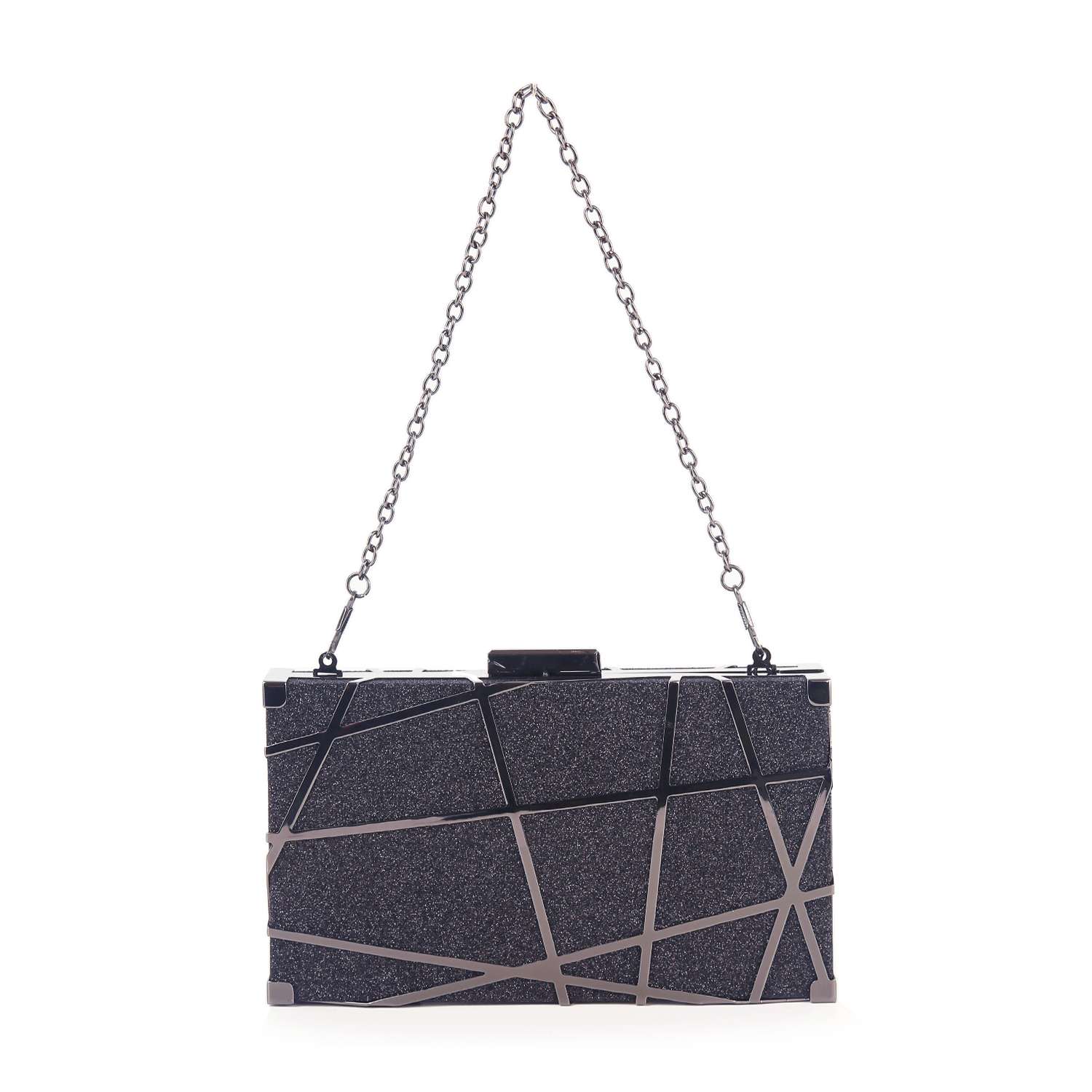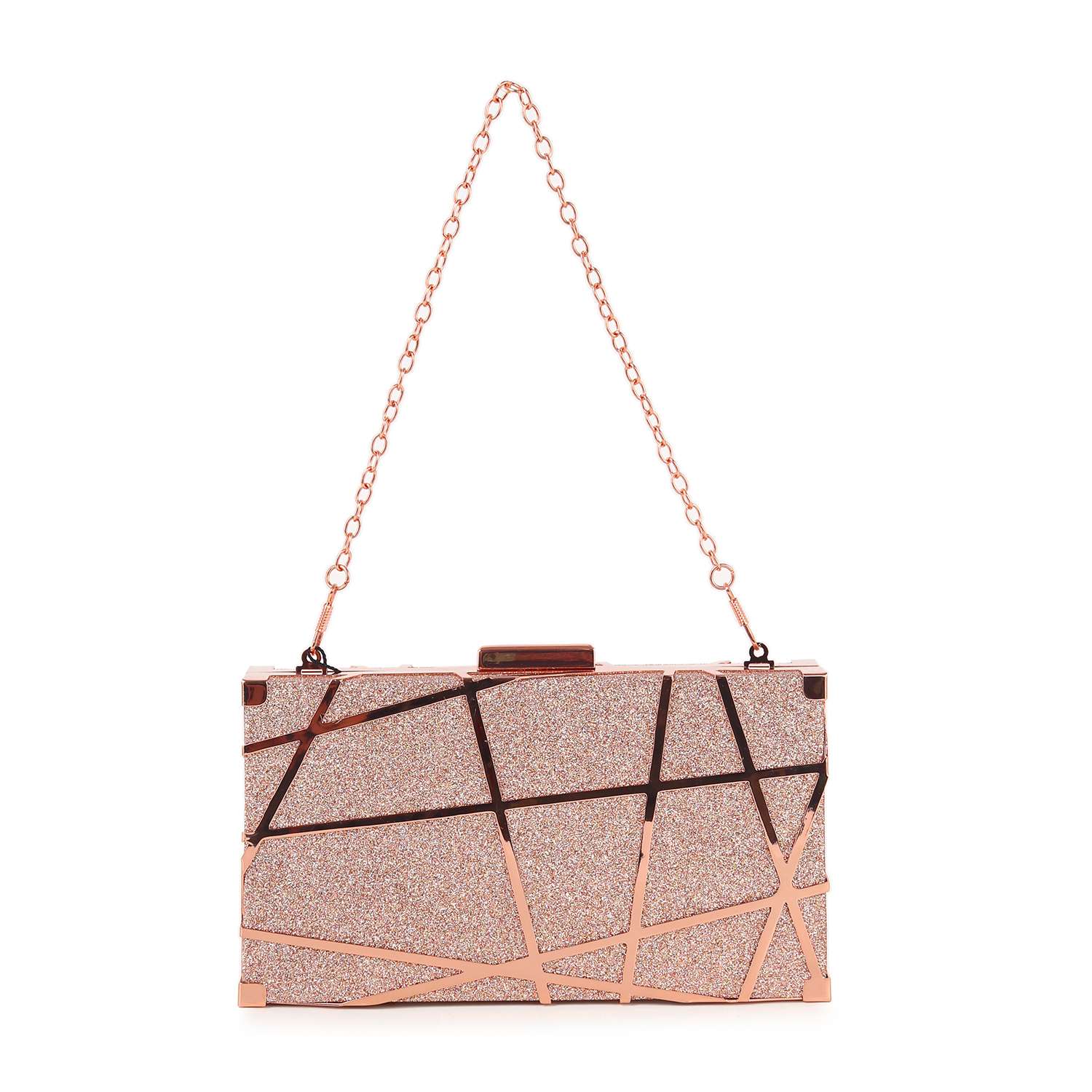 Go for full glamour with this framed clutch that's covered in glitter and trimmed with a modern...