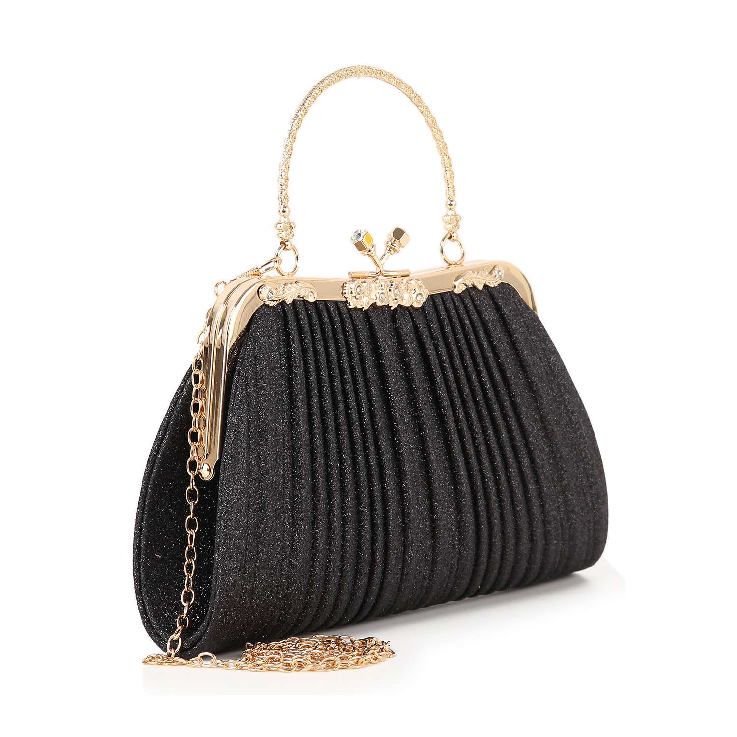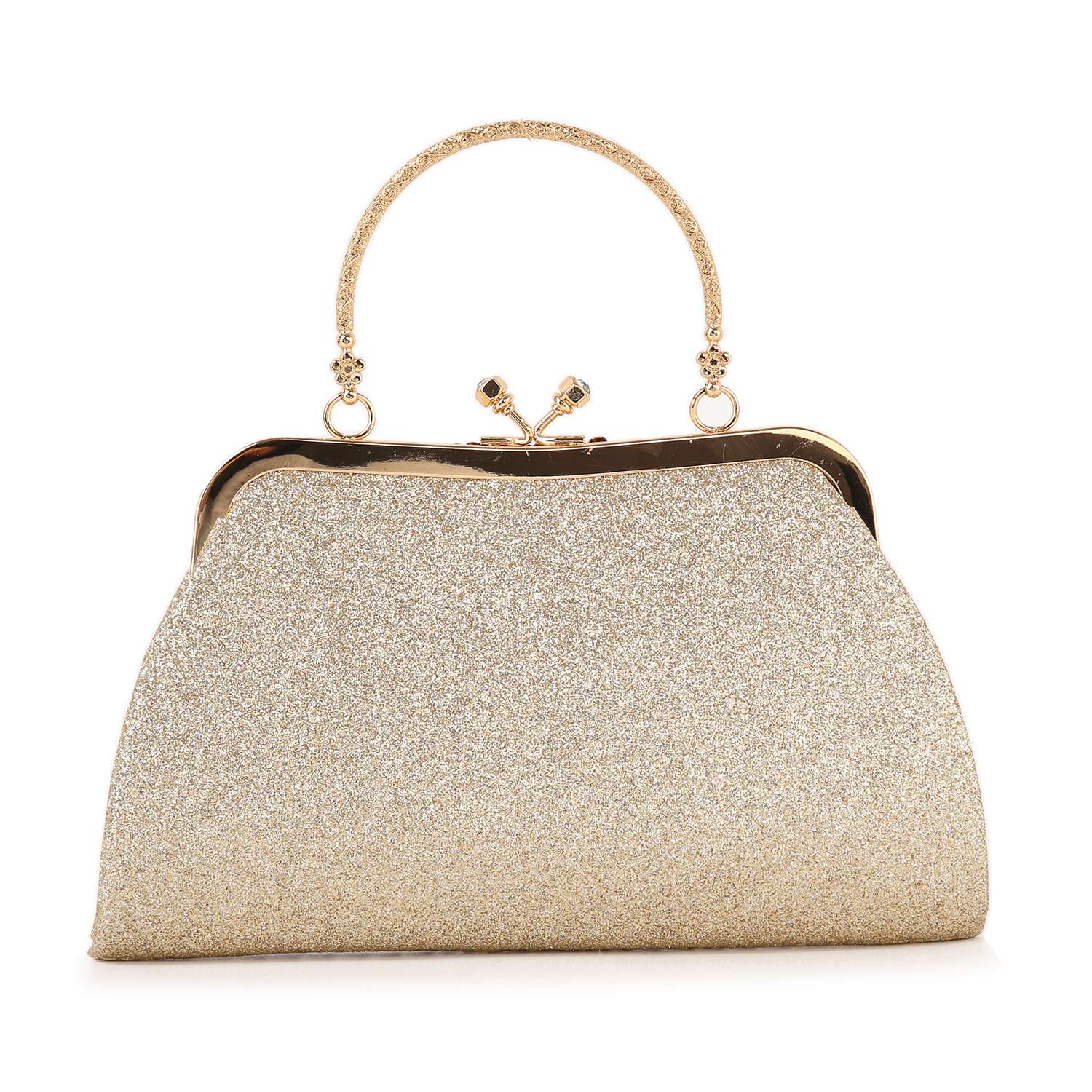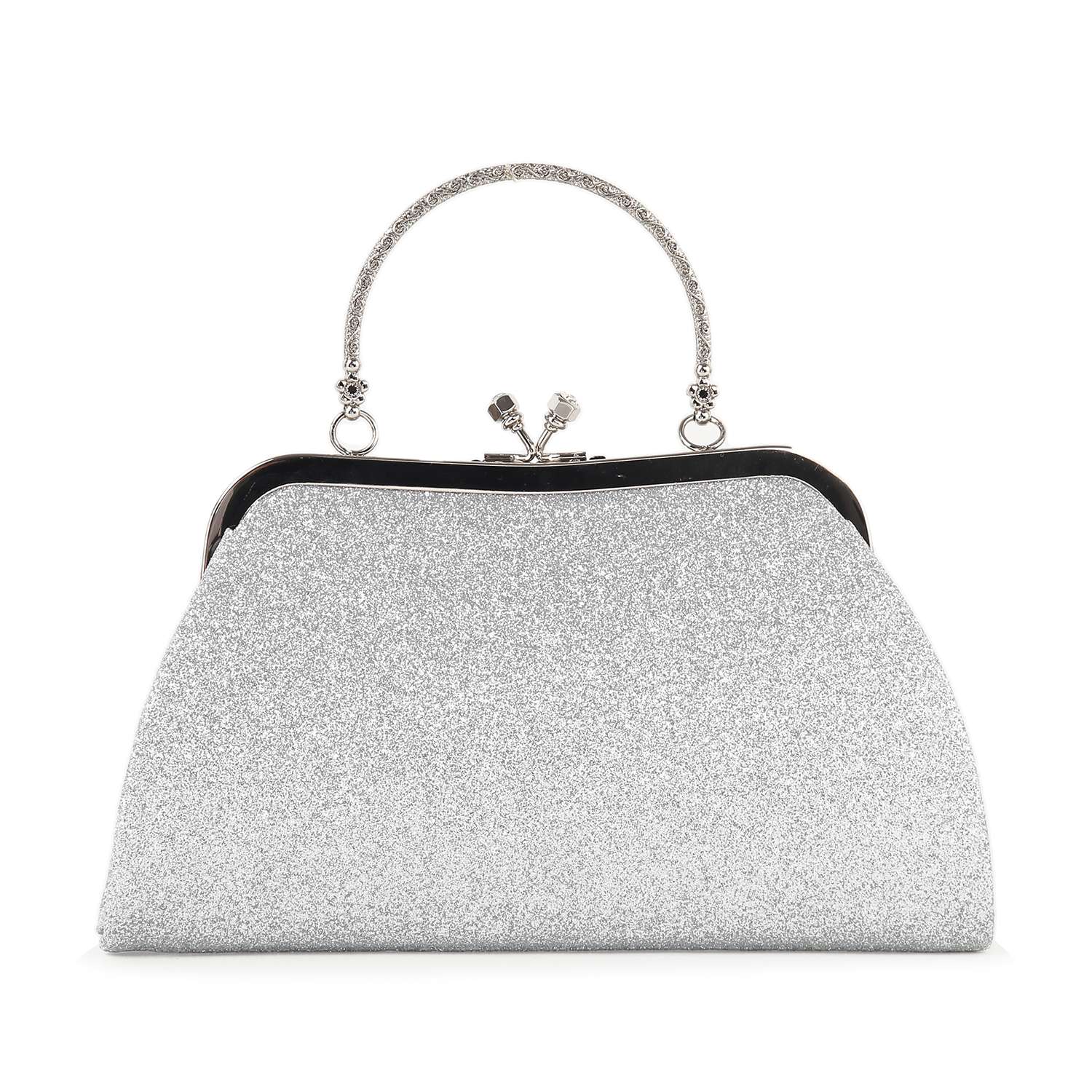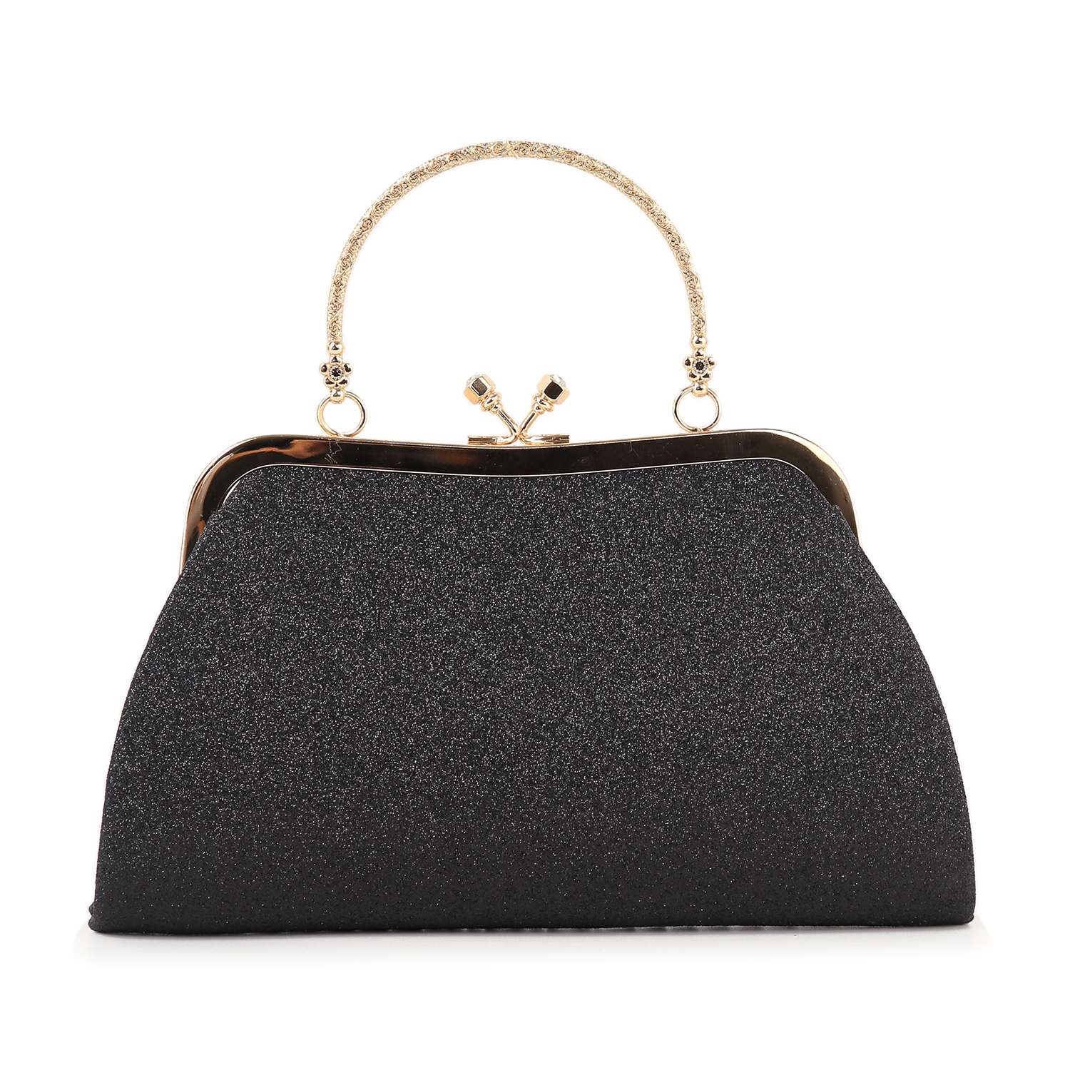 A crystal bloom kiss-lock clasp lends a flash of glamour to a swanky glittery hand tote suspended by a drop-in chain strap.