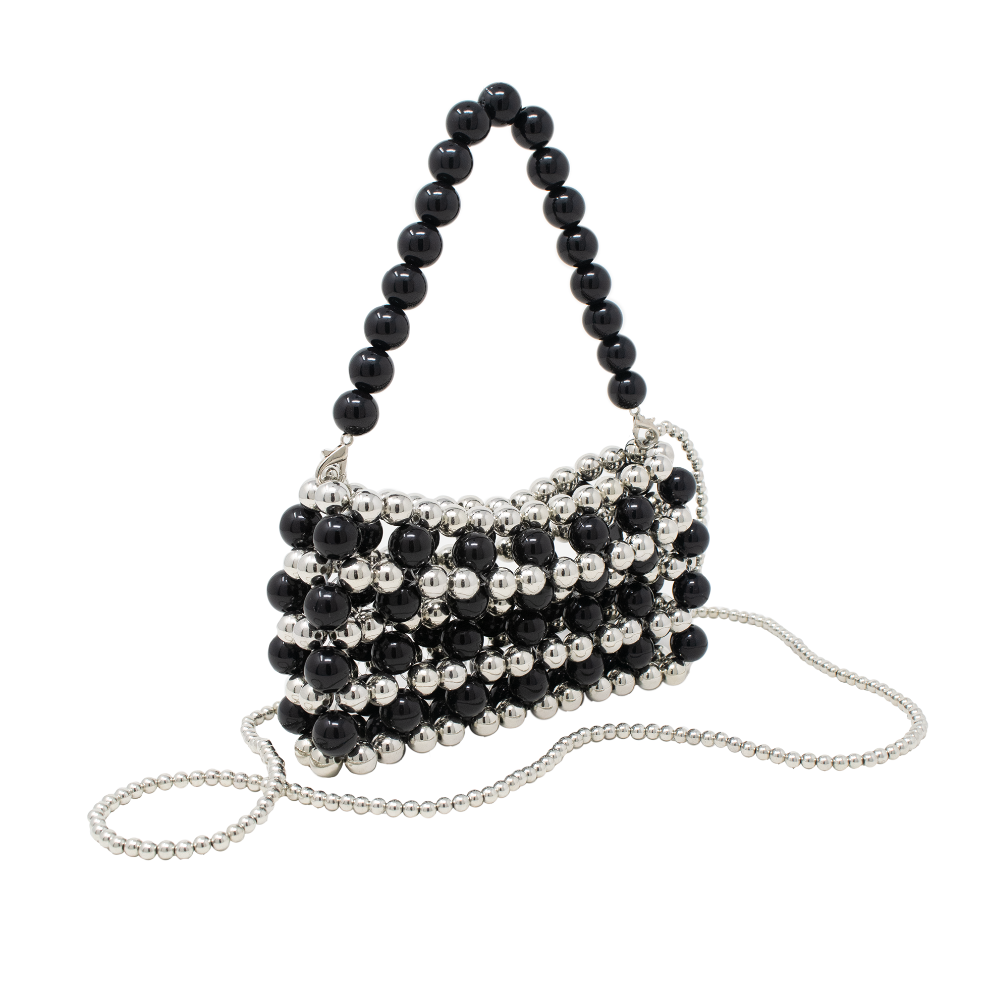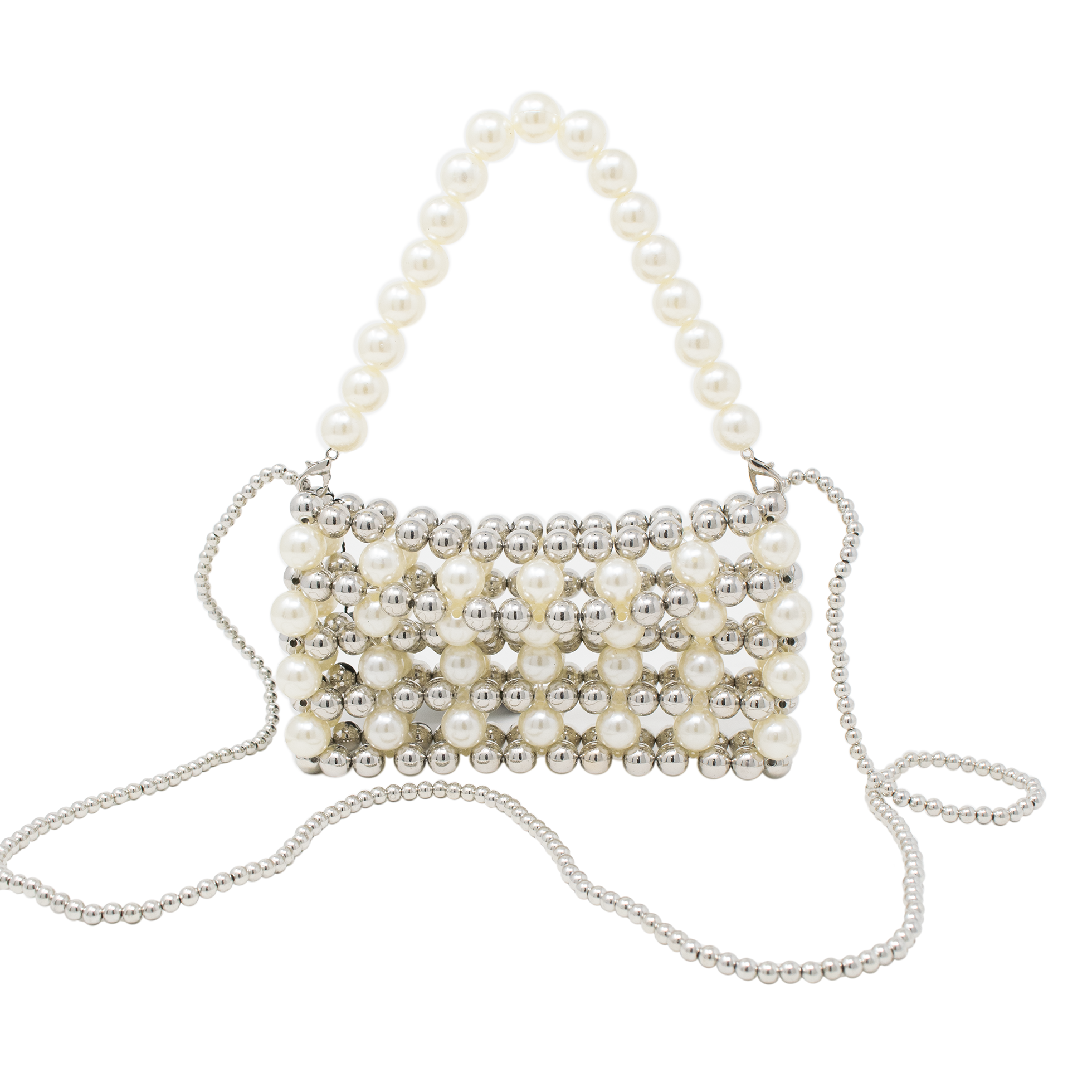 Perfect pearl accented petite evening bag. 5.5L single handle. 22L detachable strap. Approximate Size: 7L x 4H...