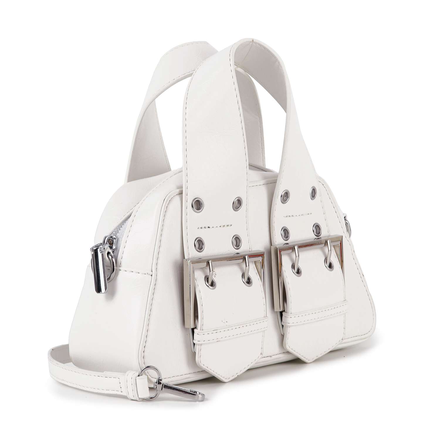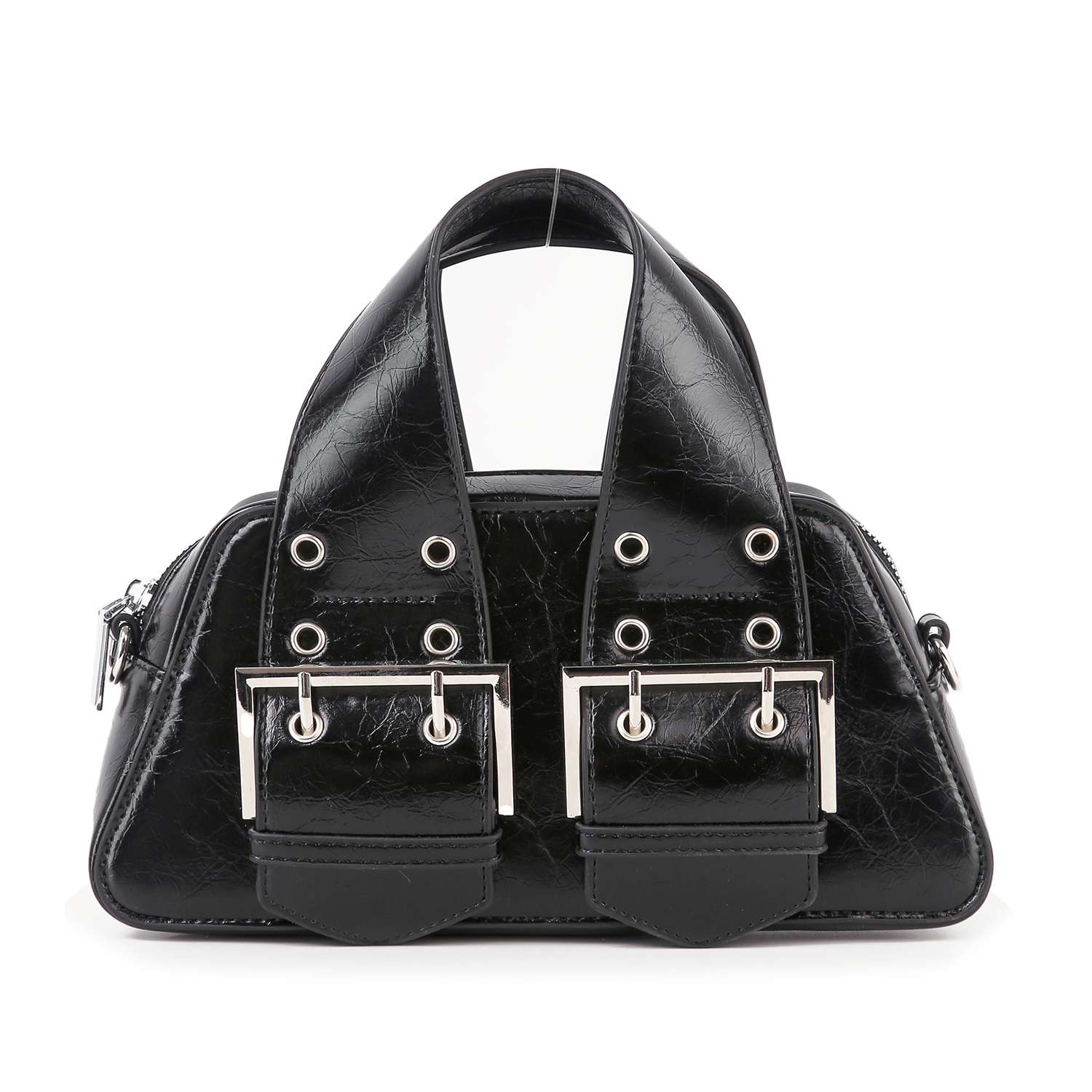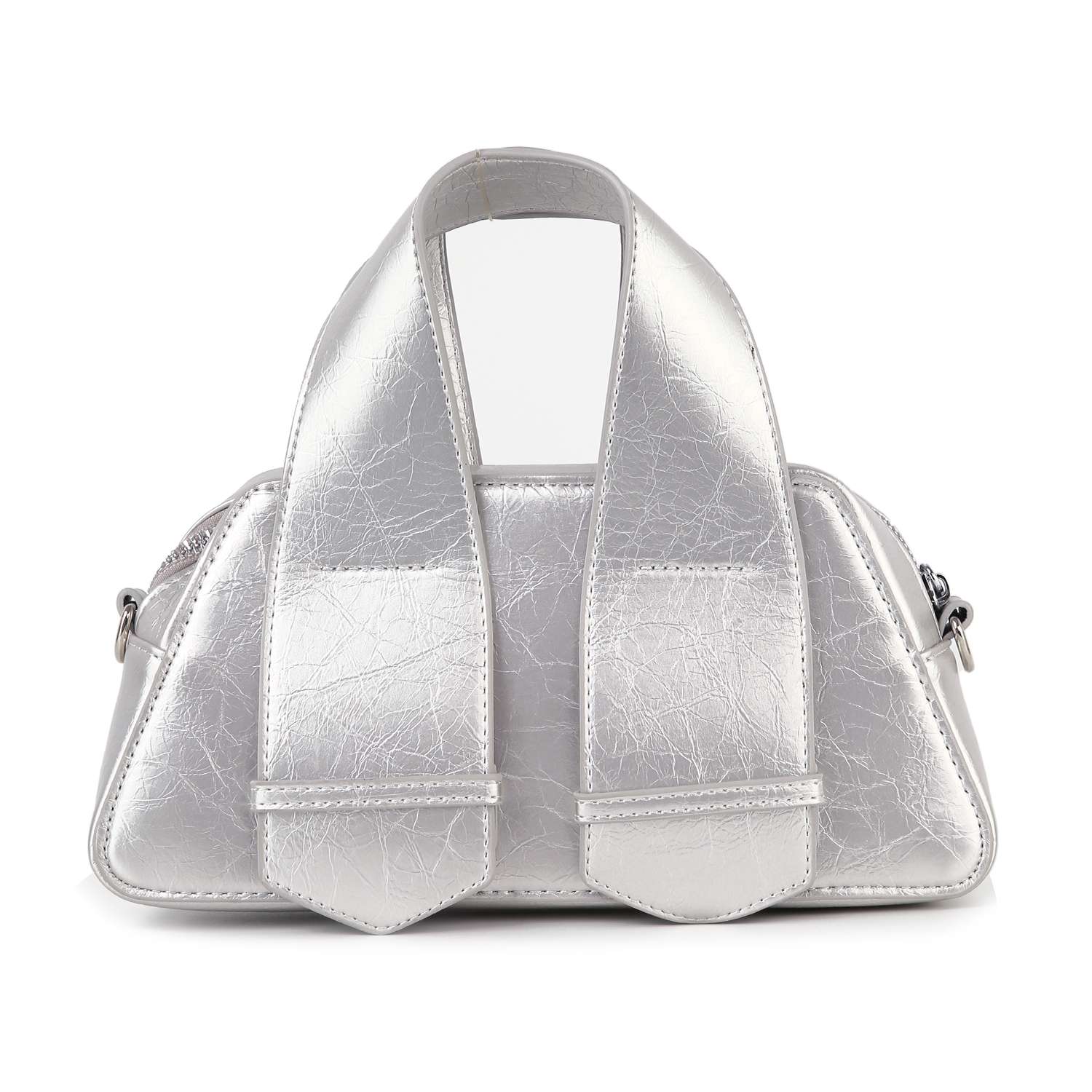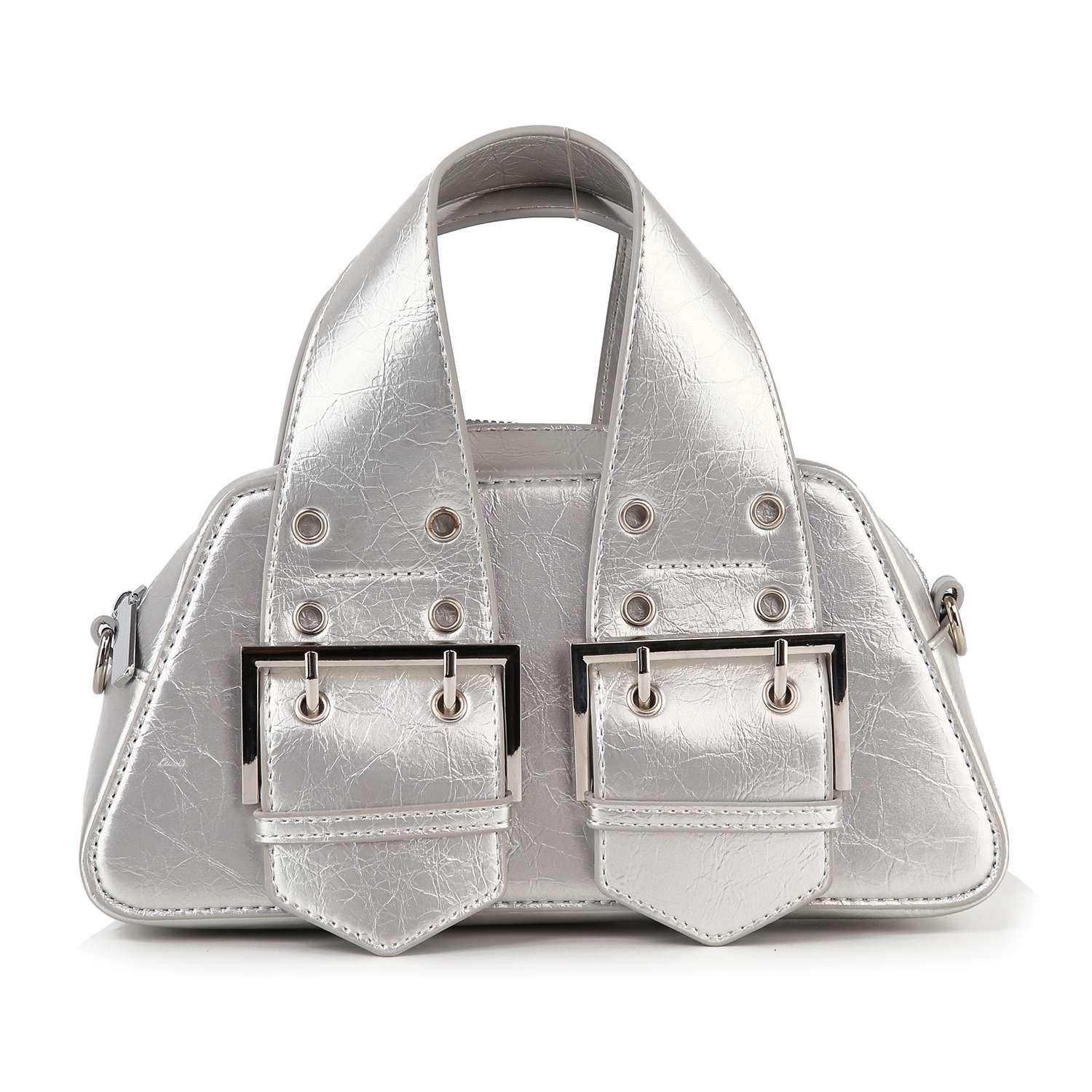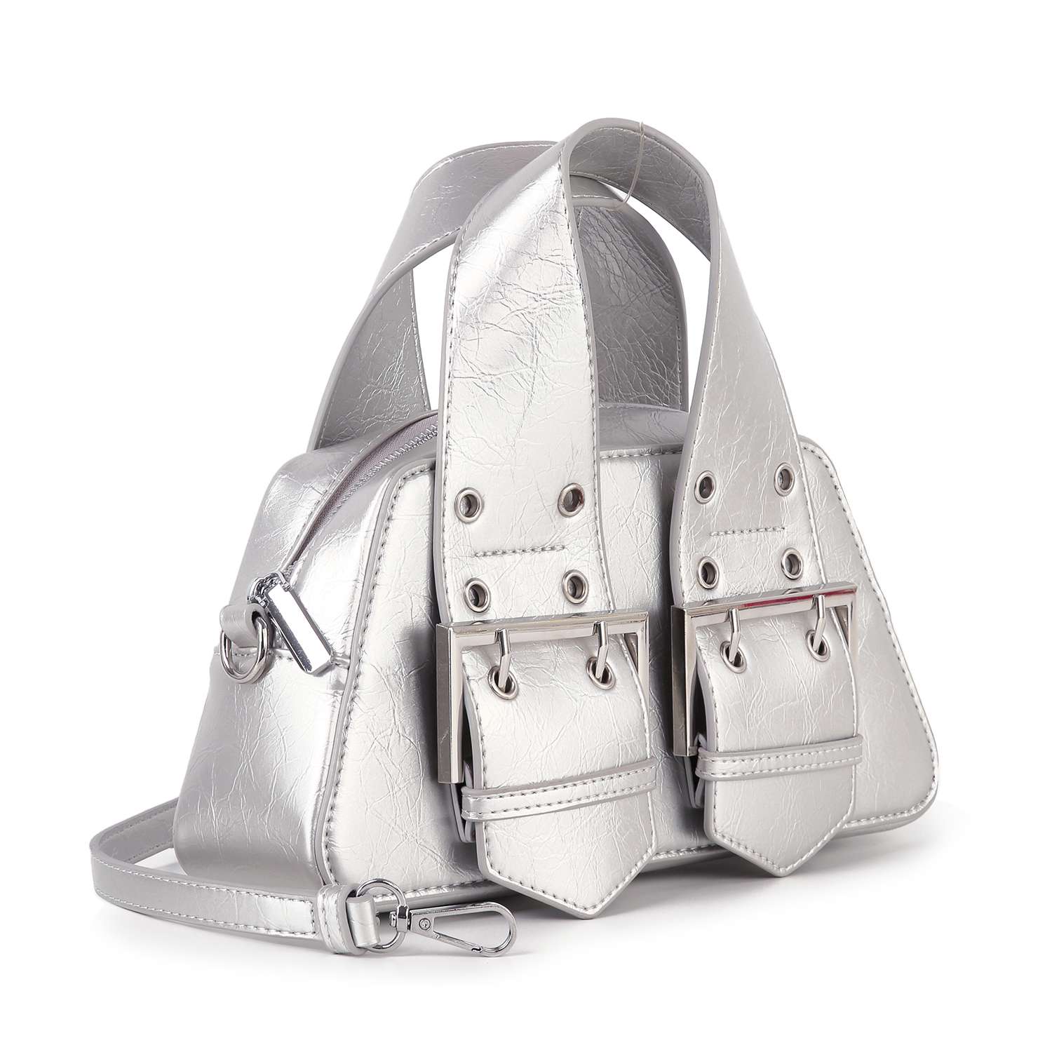 Bold silver buckles maximize the dazzle of a stunning hand tote furnished with a removable strap for styling versatility.