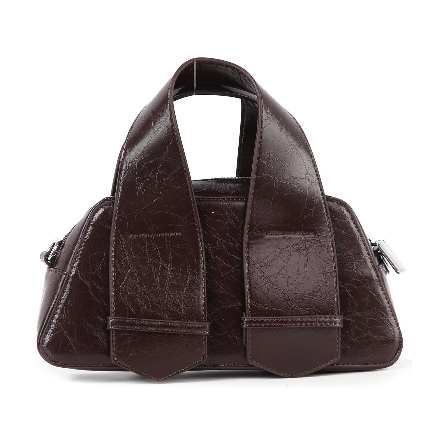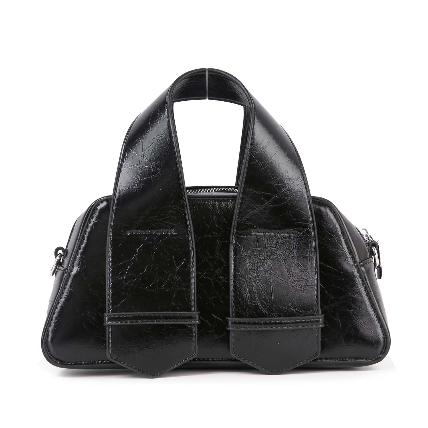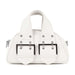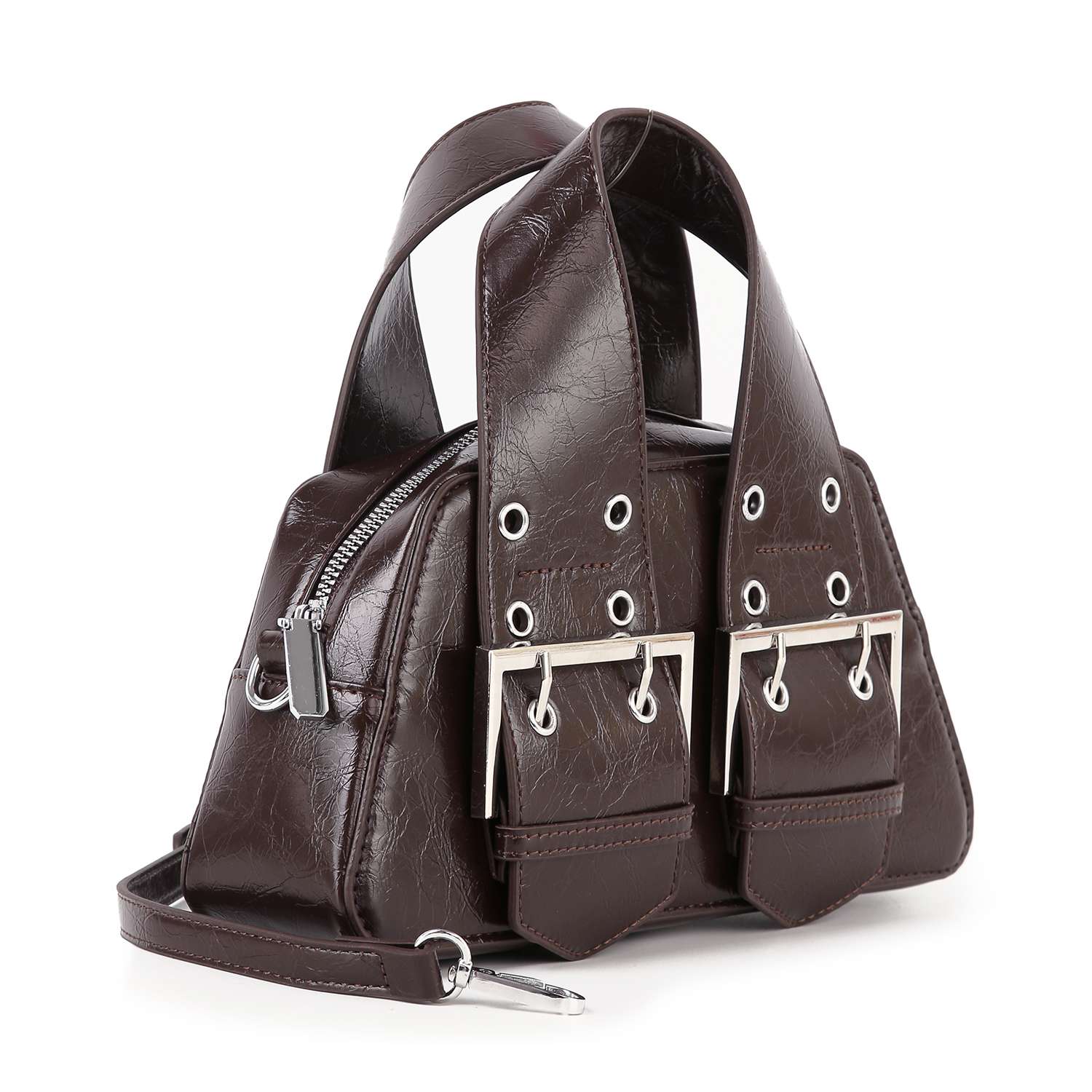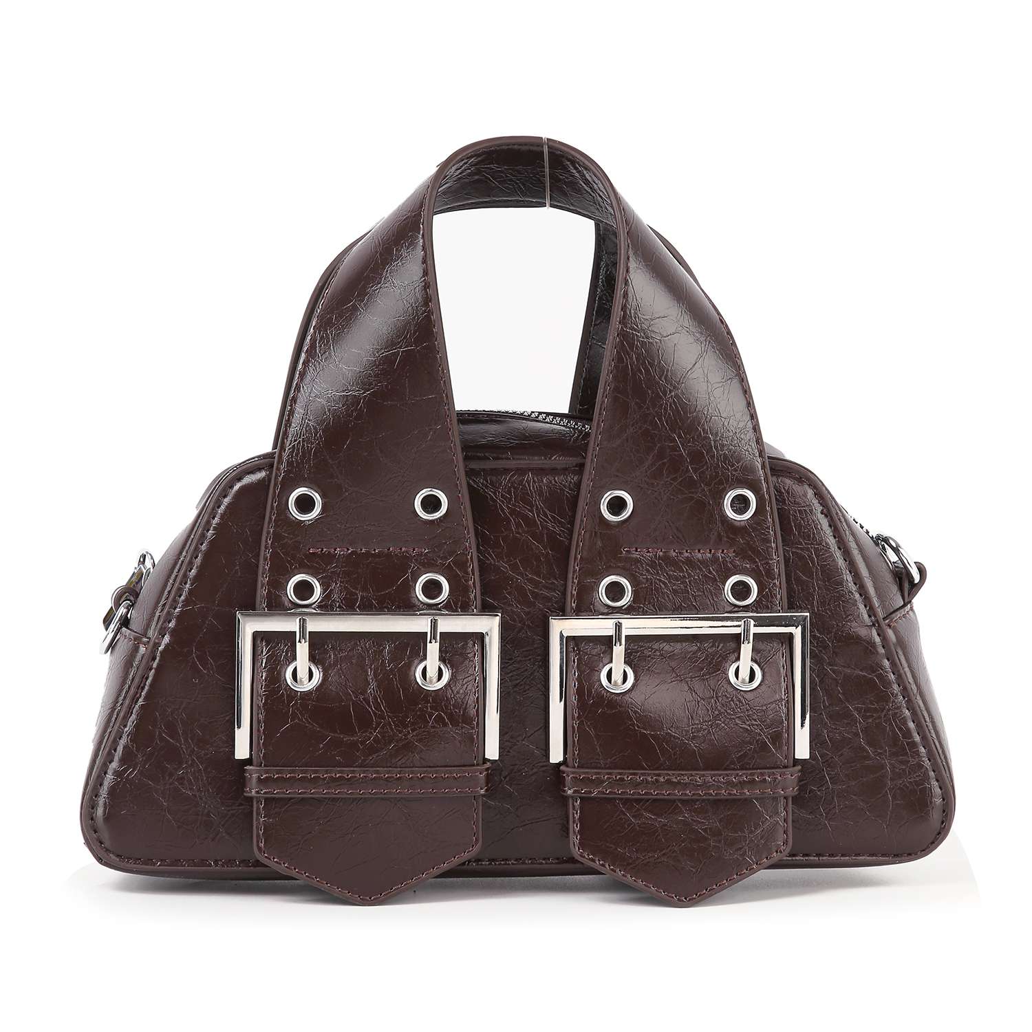 Bold silver buckles maximize the dazzle of a stunning hand tote furnished with a removable strap for styling versatility.