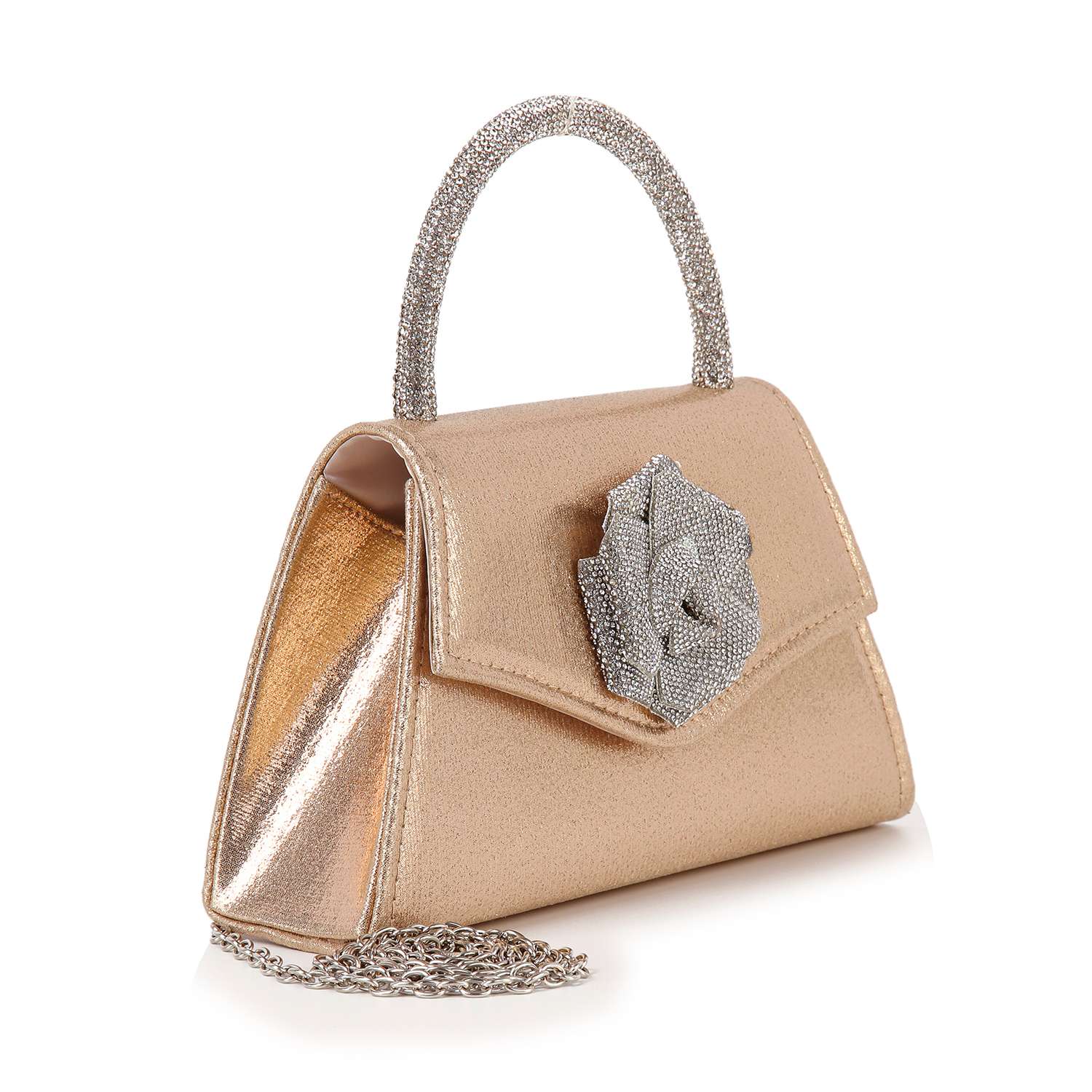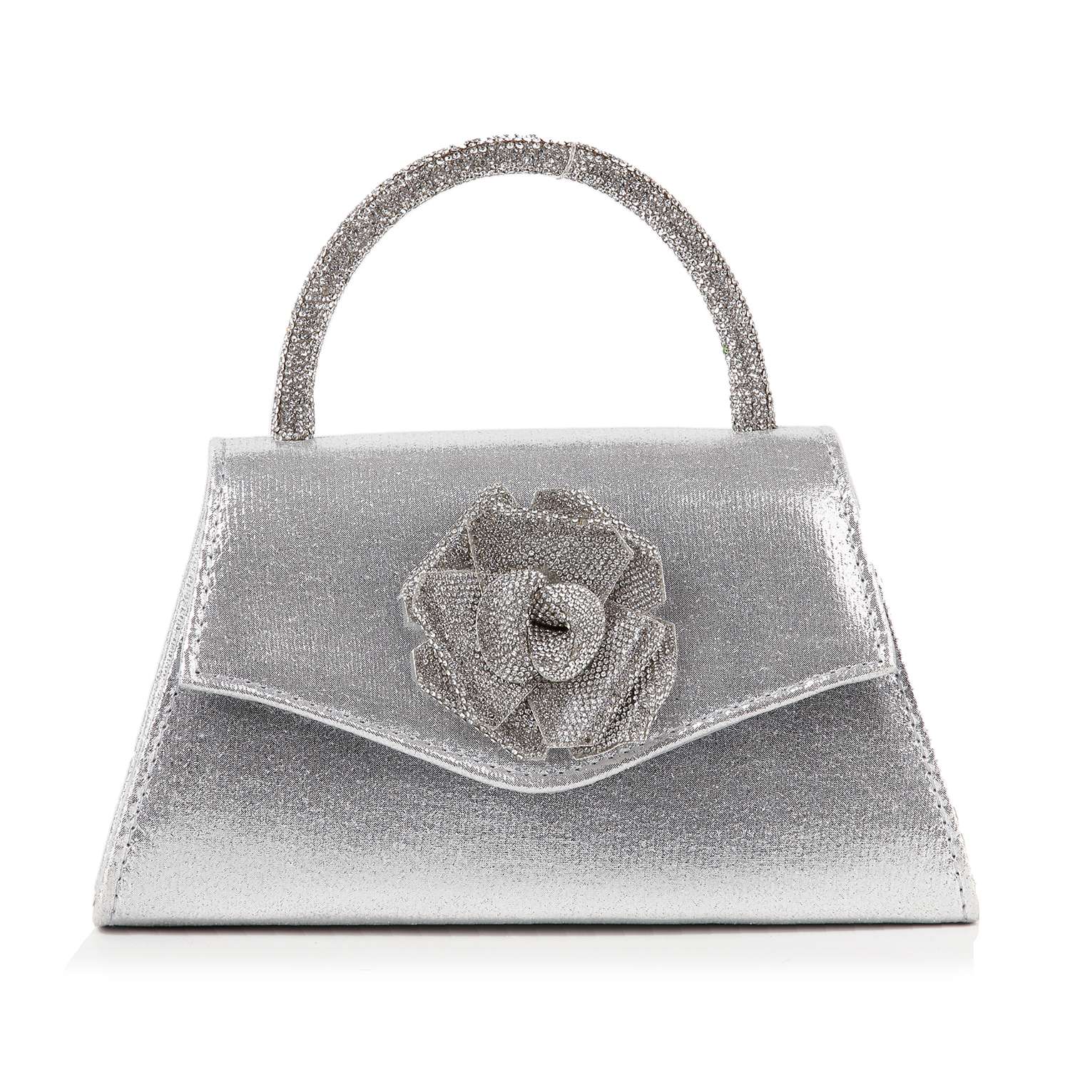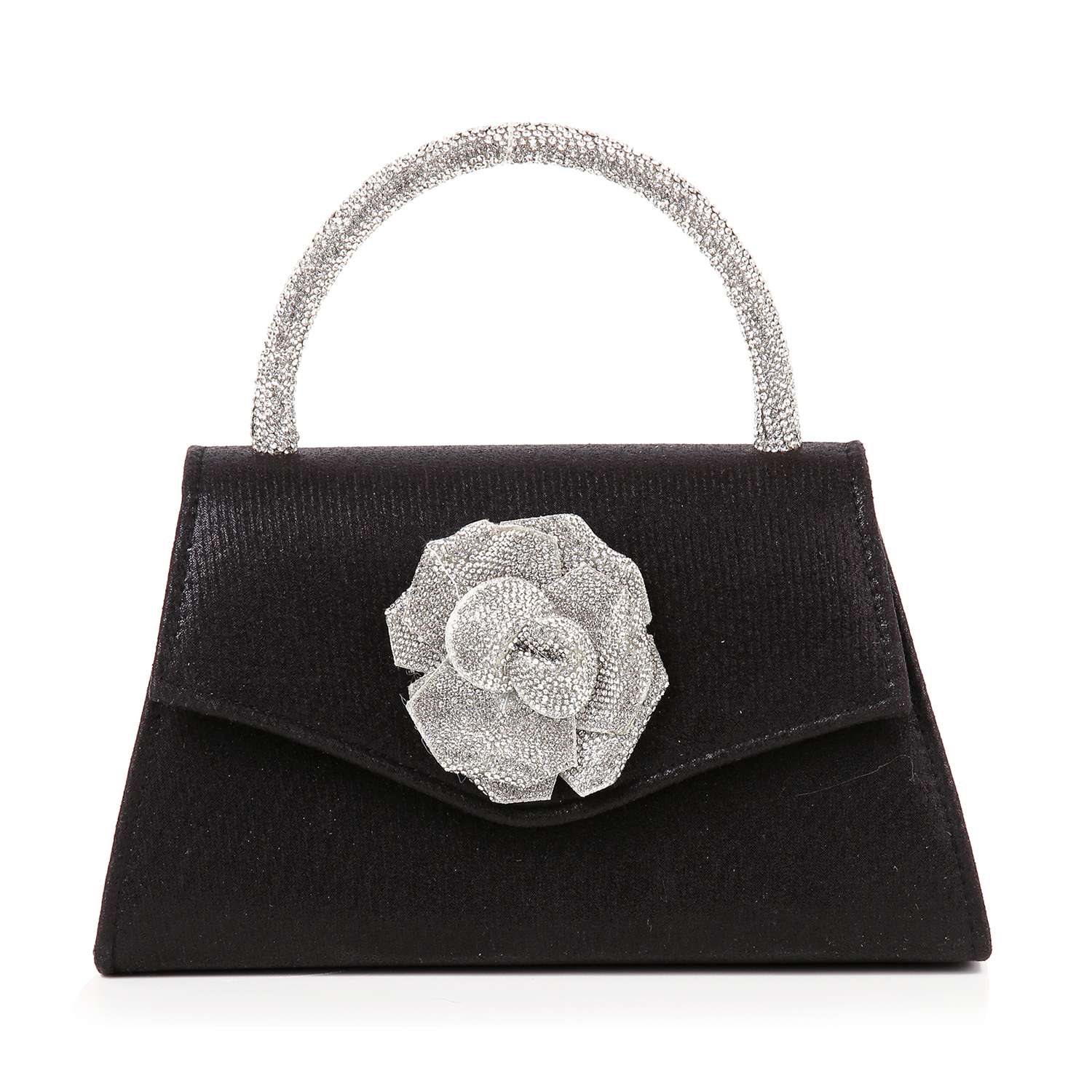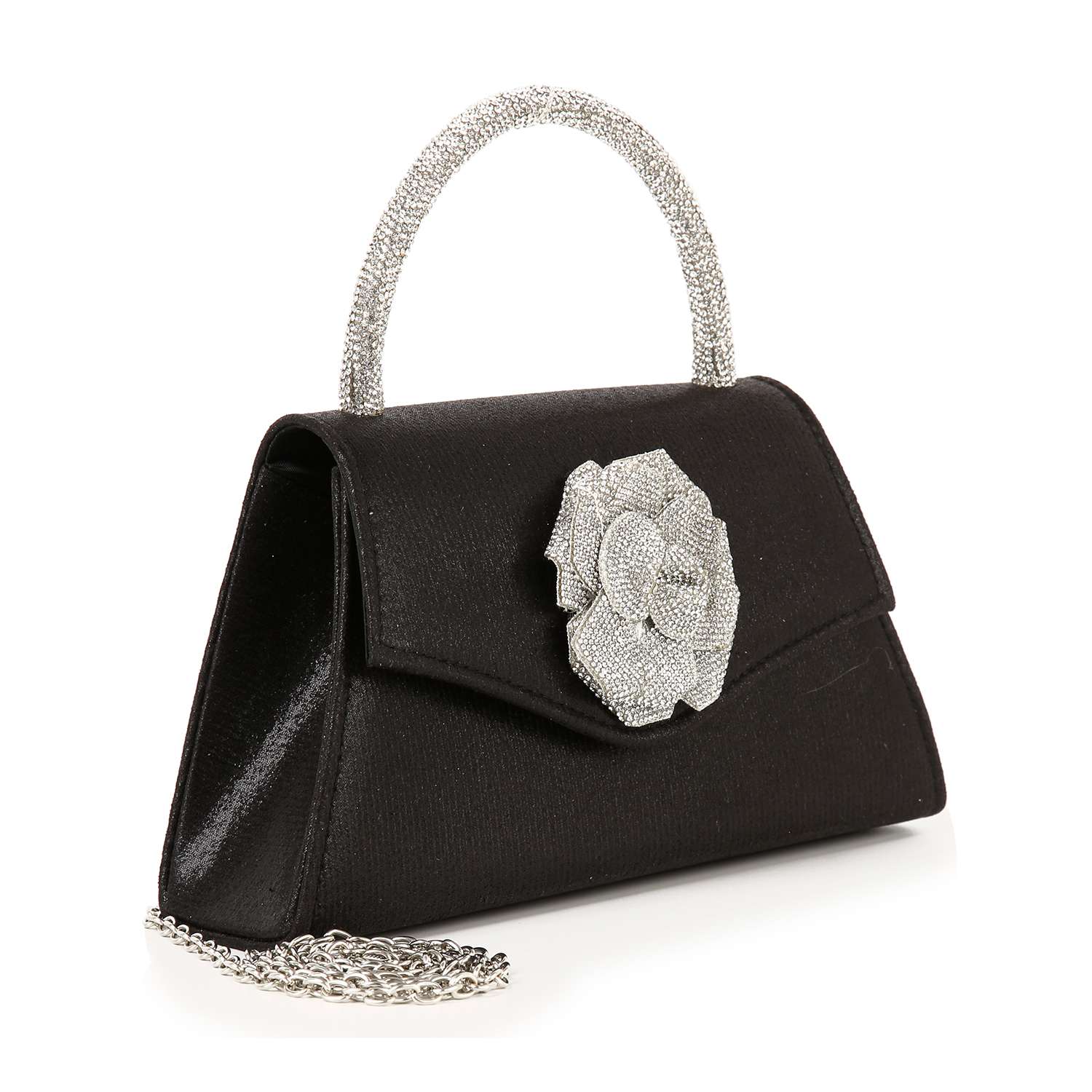 A raised rhinestone flower is an easy way to elevate any look, and this petite hand tote does it right.