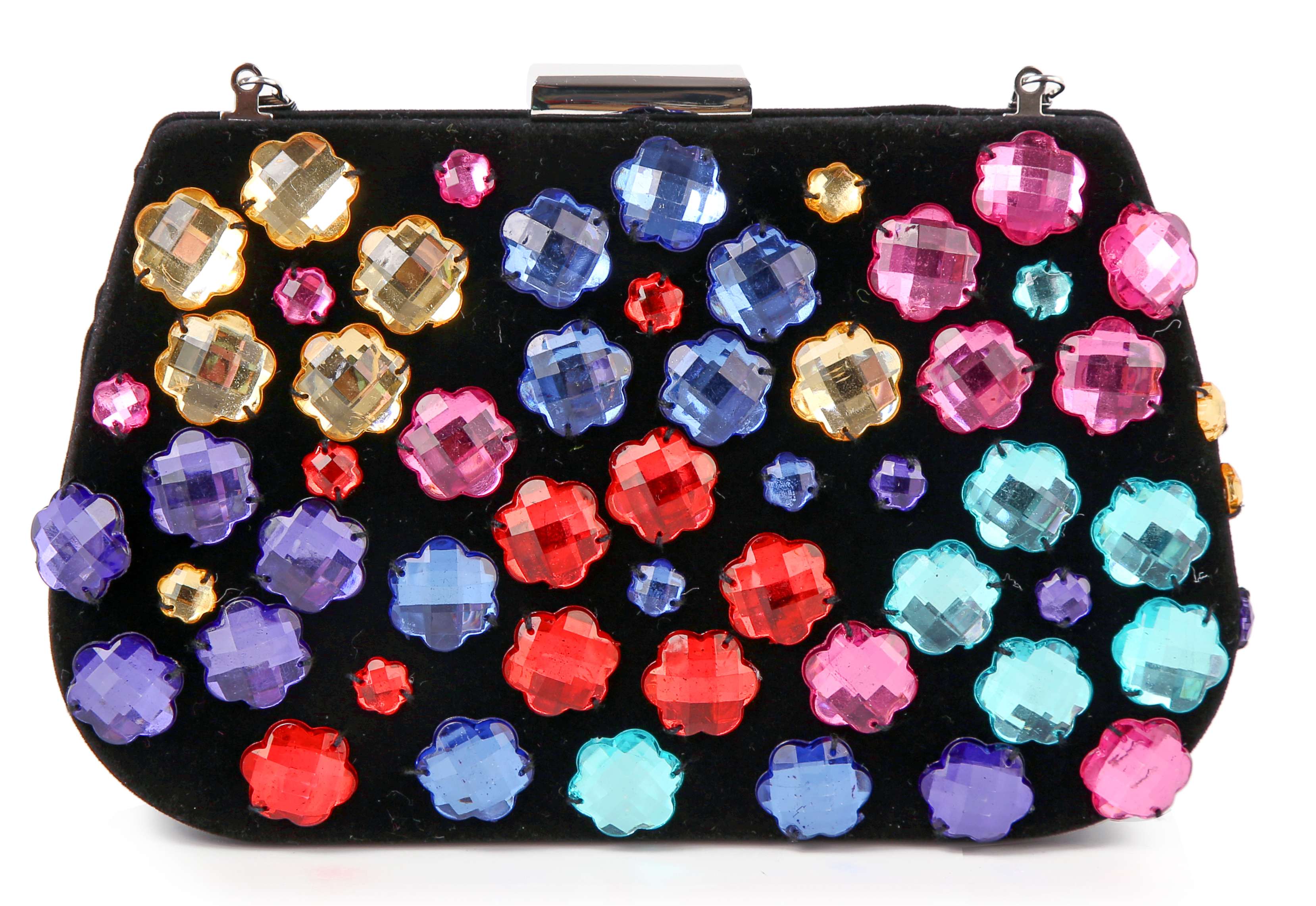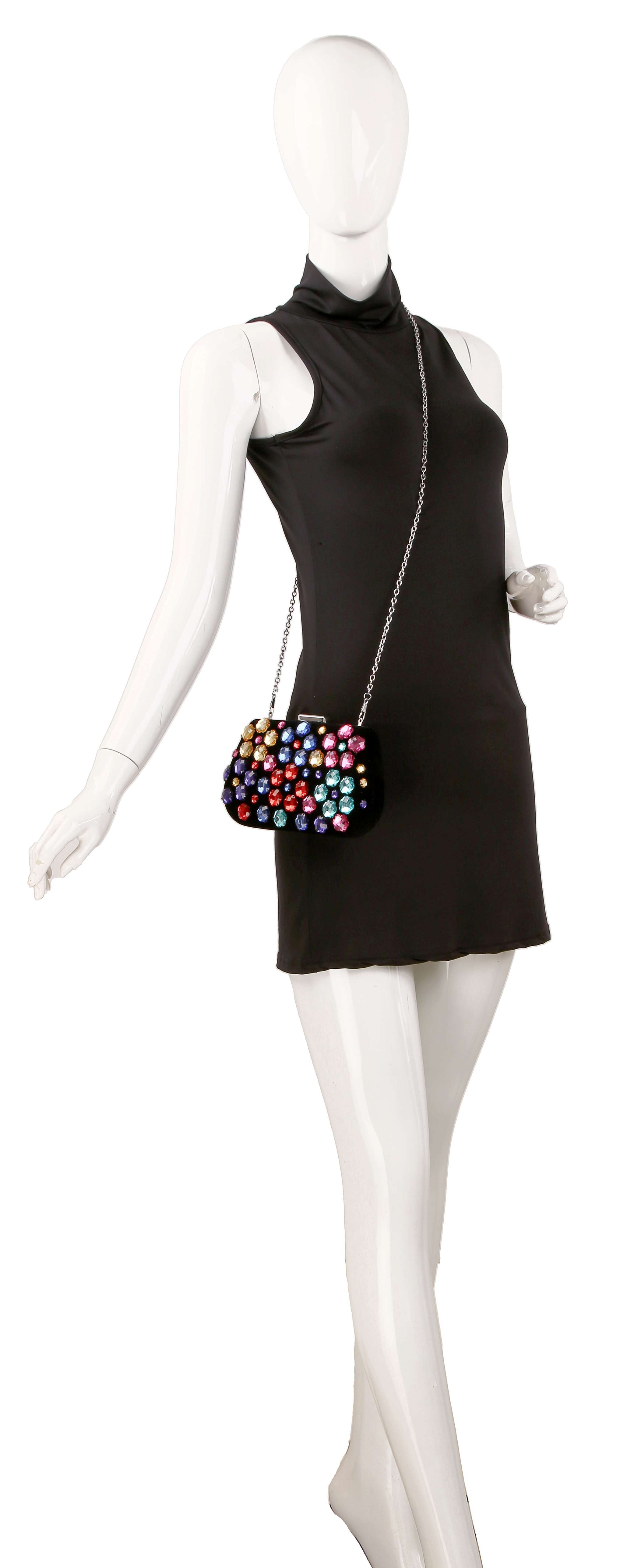 Brilliant colored gems distinguish a faux-leather shoulder bag fitted with an adjustable strap for versatile wear  23L...